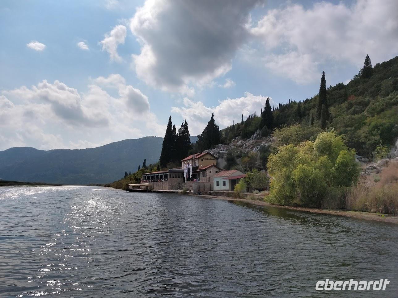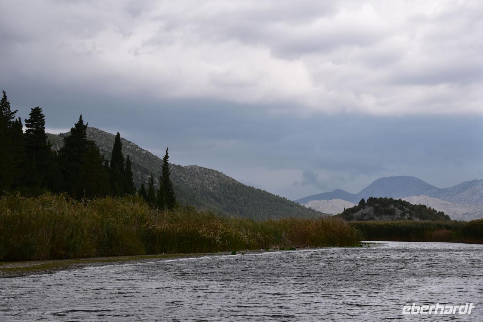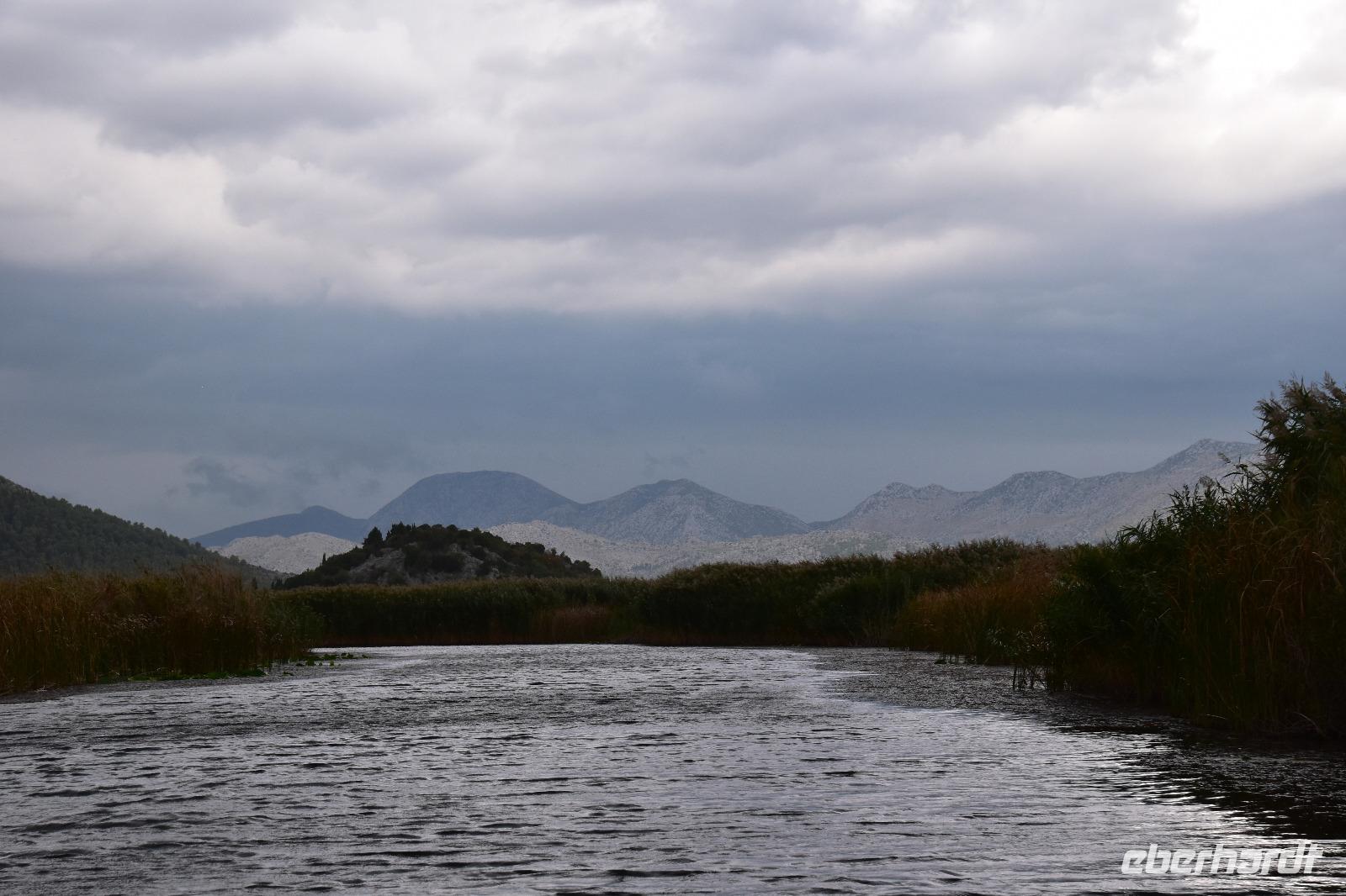Vom Bootsanleger dieses Restaurants unternehmen wir nun eine schöne Bootsfahrt mit Musik und Schnaps durch die Kanäle des Flussdeltas. Am hübsch am Wasser gelegenen Restaurant „Neretva House" verlassen wir unser Boot undwerden mit einem tollen Mittagessen, Weißwein und Wasser bewirtet und verwöhnt. Dazu haben wir Zeit den Blick in die herrliche Landschaft schweifen zu lassen. Leider zieht jetzt ein Unwetter über die Berge heran. Wir schaffen es gerade noch ungeschoren mit den Booten zurück zum Bus., dann hagelt und Stürmt es auch schon.