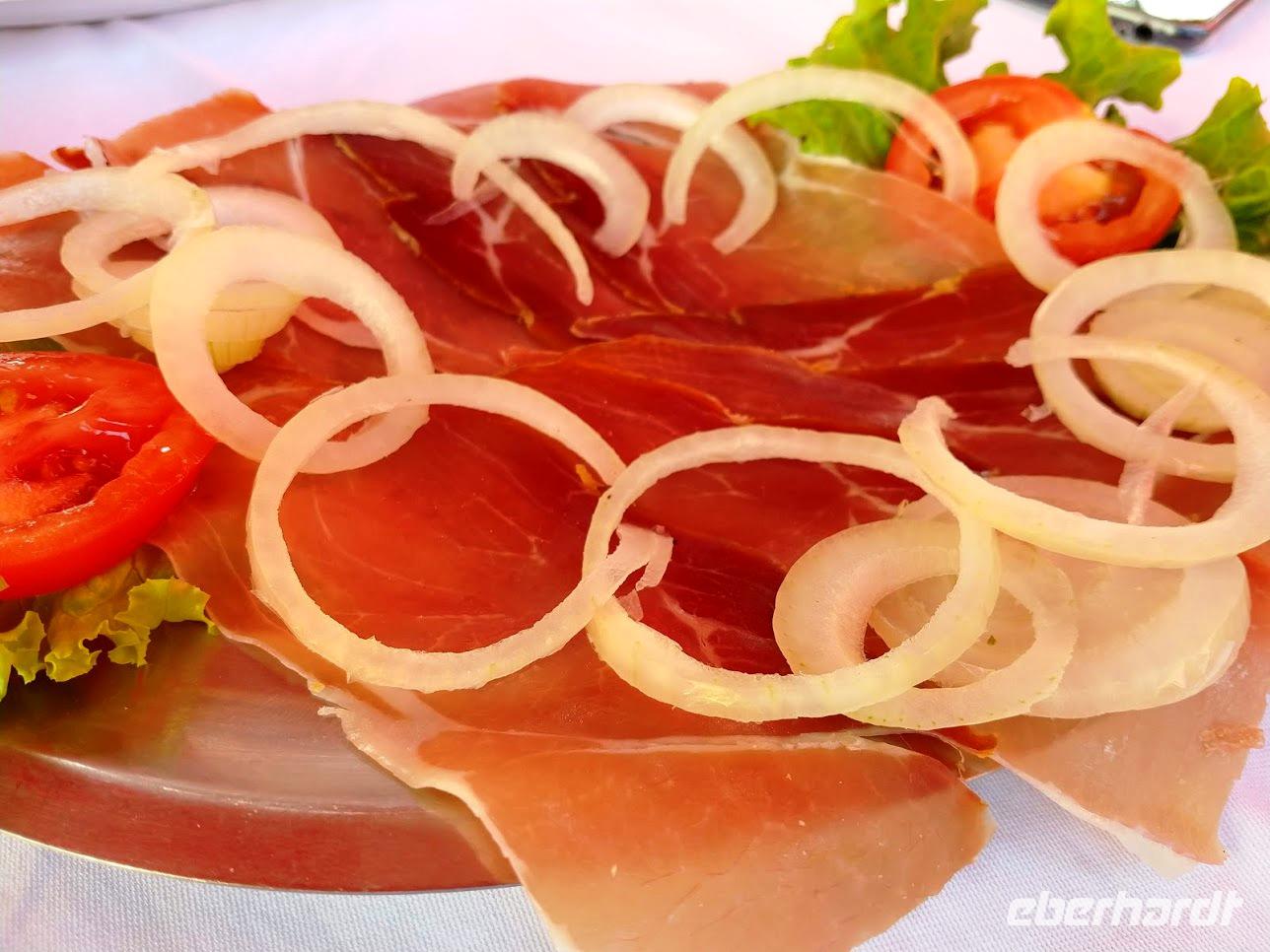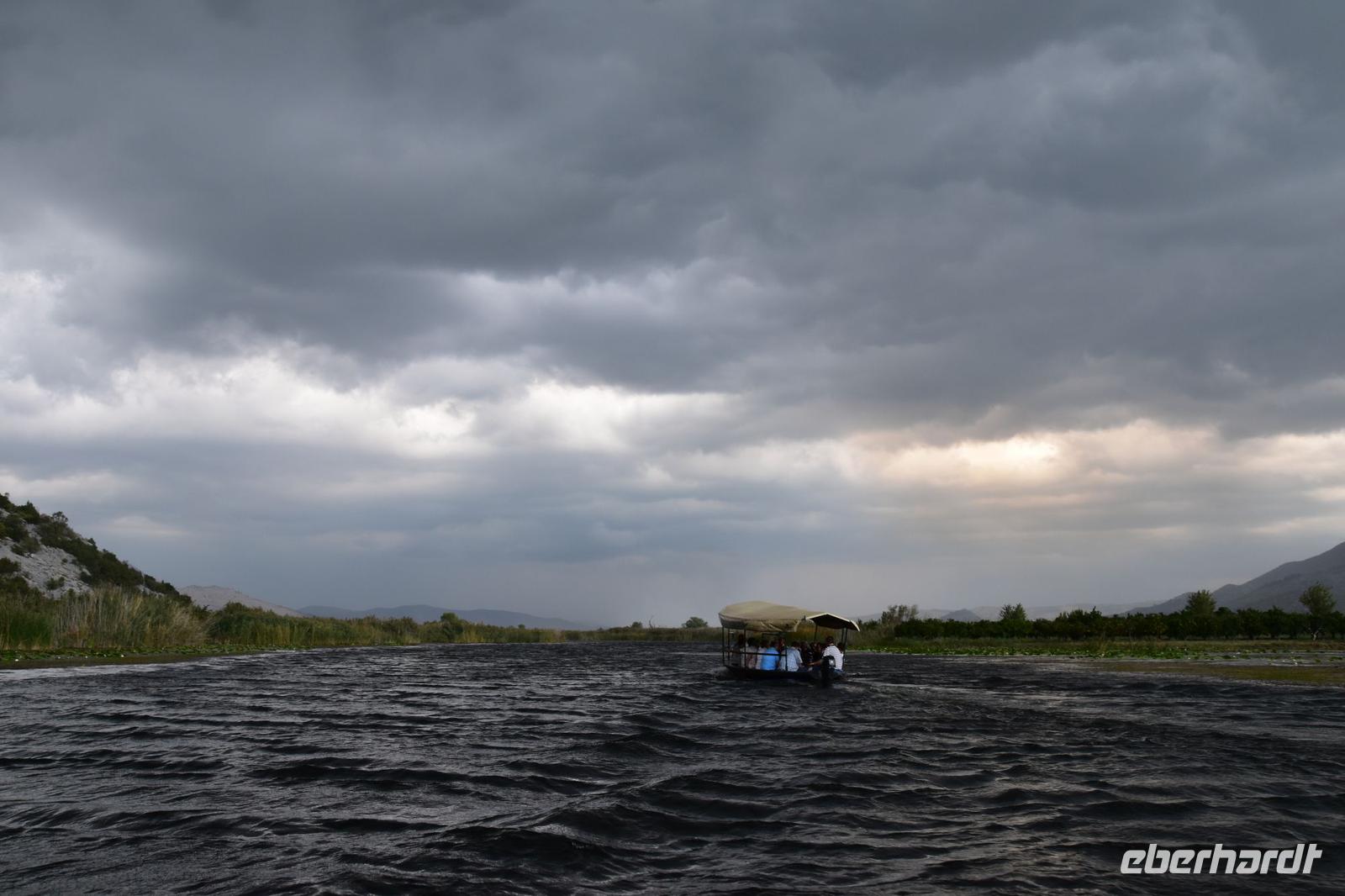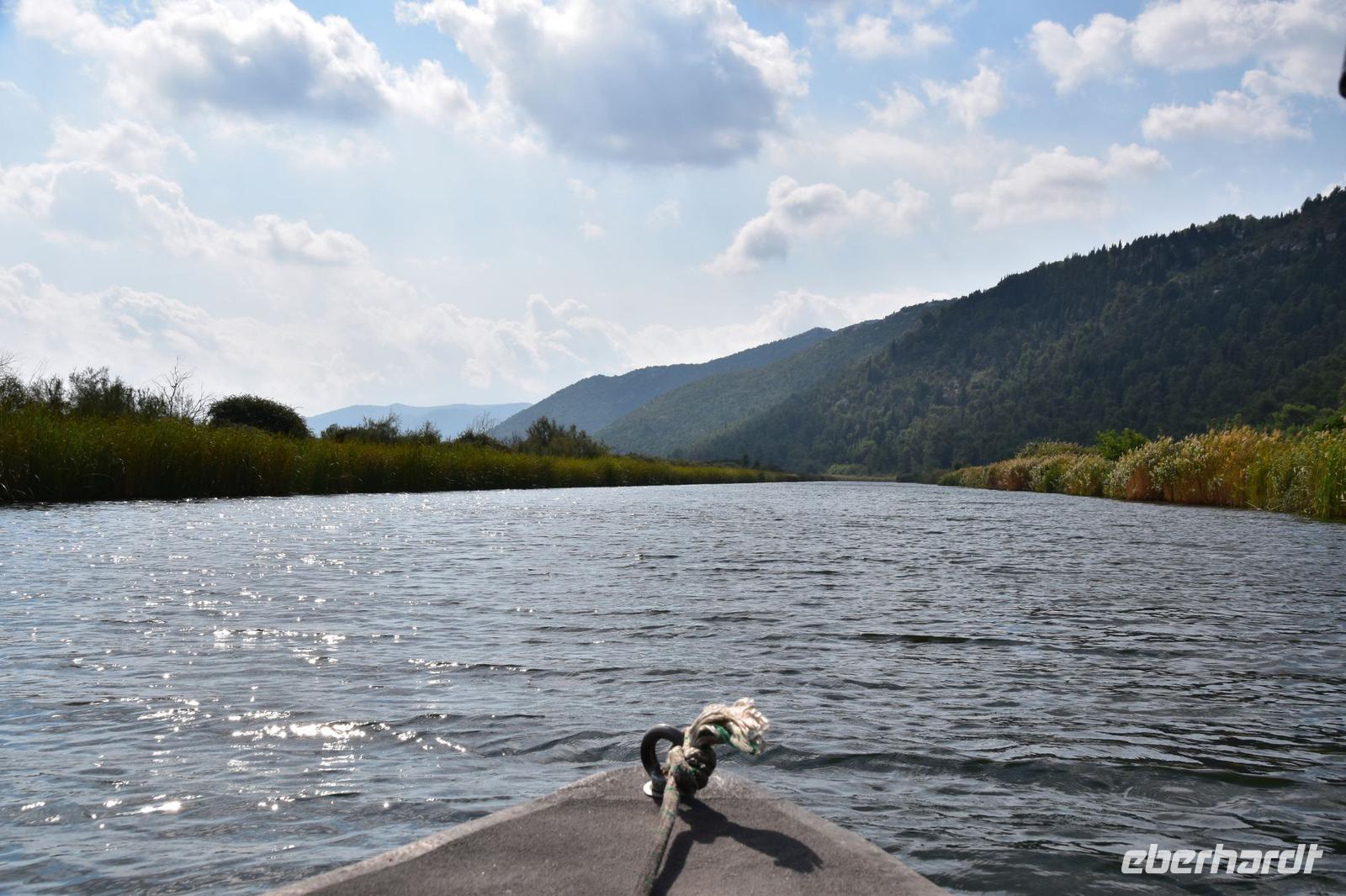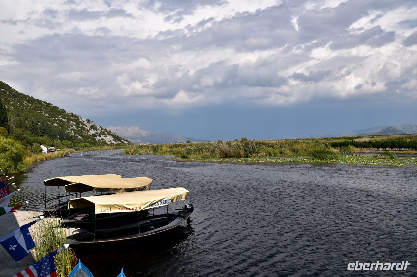 Vom Bootsanleger dieses Restaurants unternehmen wir nun eine schöne Bootsfahrt mit Musik und Schnaps durch die Kanäle des Flussdeltas. Am hübsch am Wasser gelegenen Restaurant „Neretva House" verlassen wir unser Boot undwerden mit einem tollen Mittagessen, Weißwein und Wasser bewirtet und verwöhnt. Dazu haben wir Zeit den Blick in die herrliche Landschaft schweifen zu lassen. Leider zieht jetzt ein Unwetter über die Berge heran. Wir schaffen es gerade noch ungeschoren mit den Booten zurück zum Bus., dann hagelt und Stürmt es auch schon.