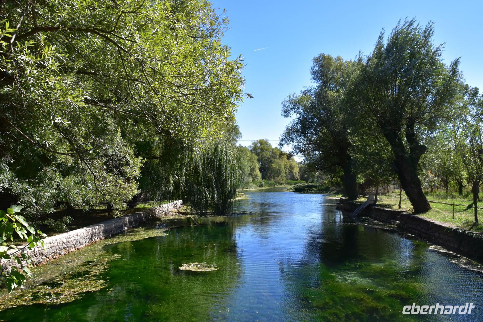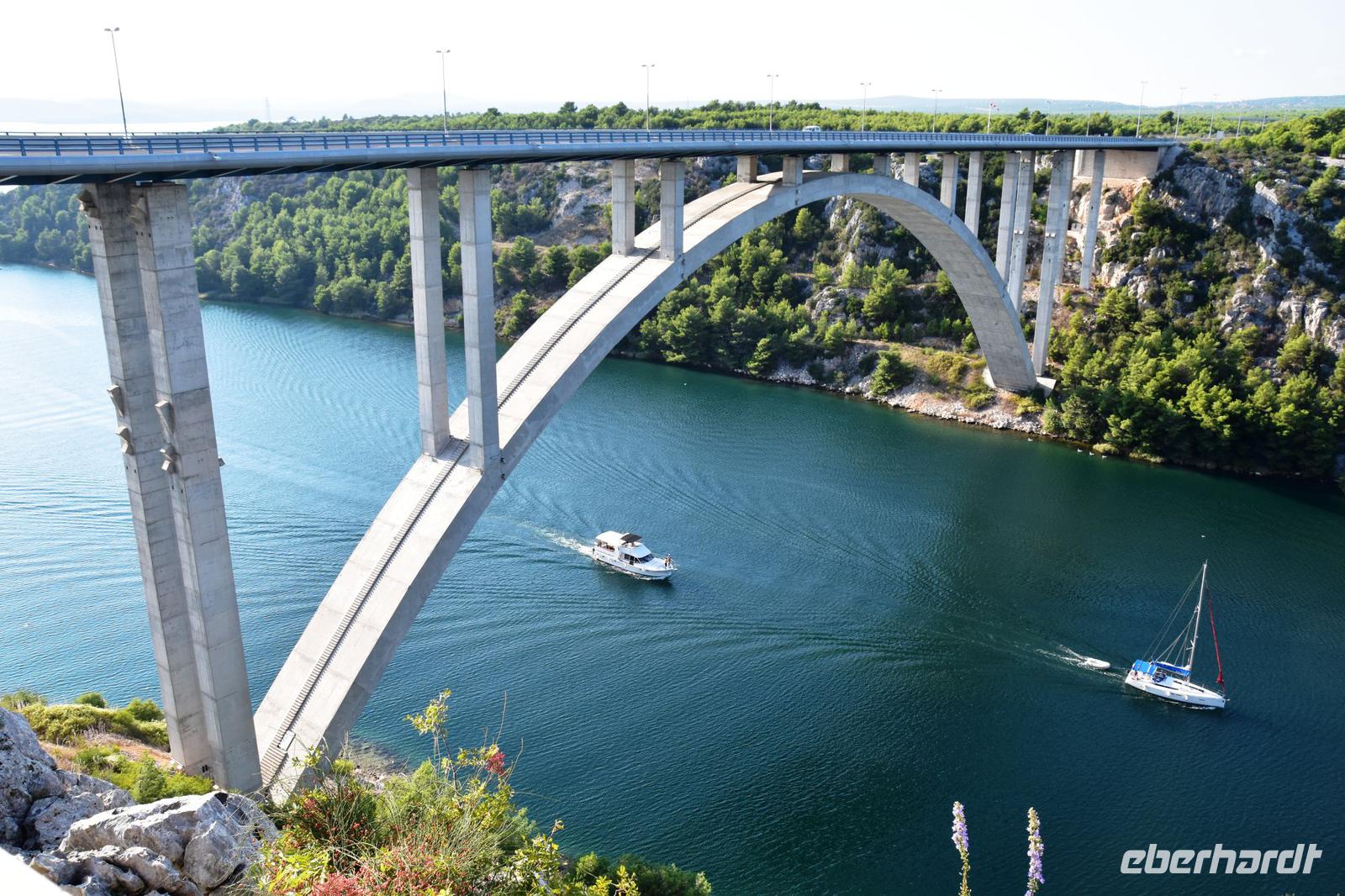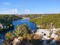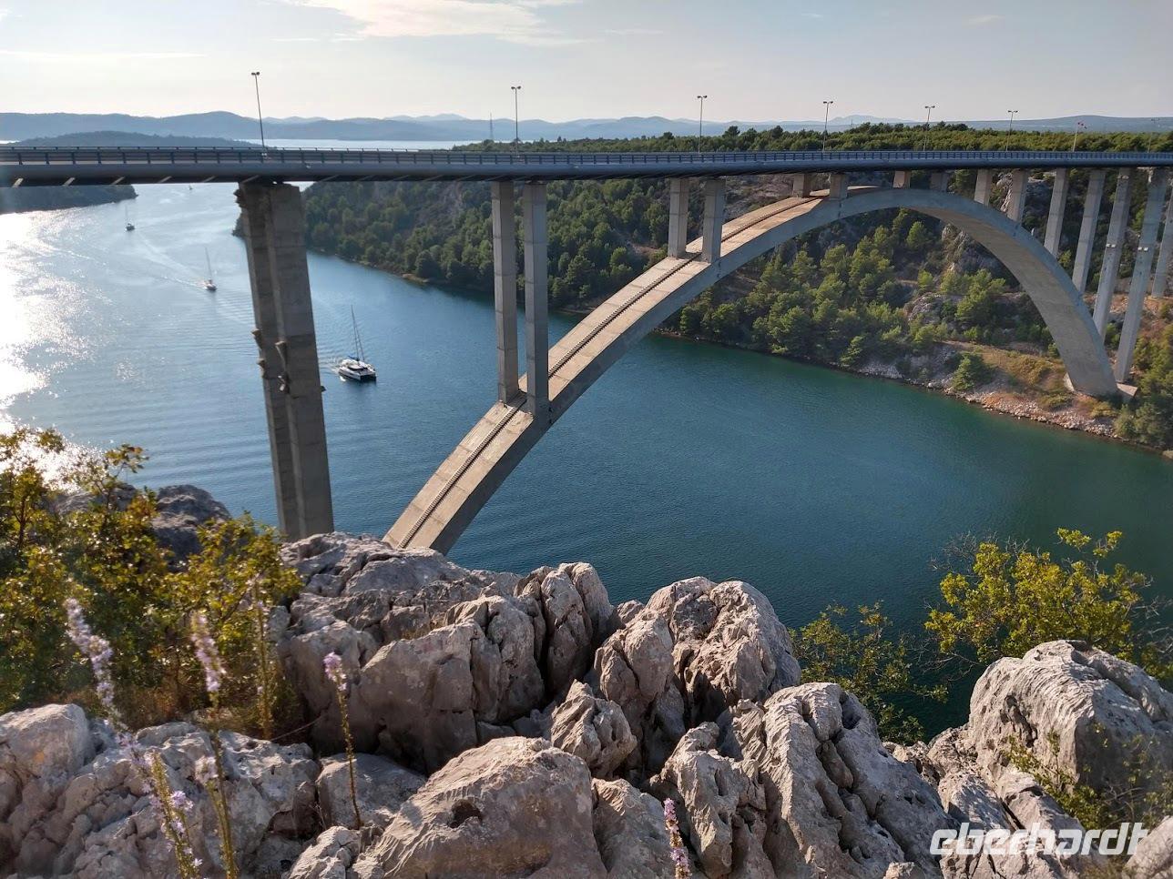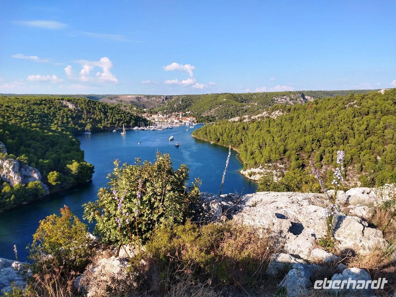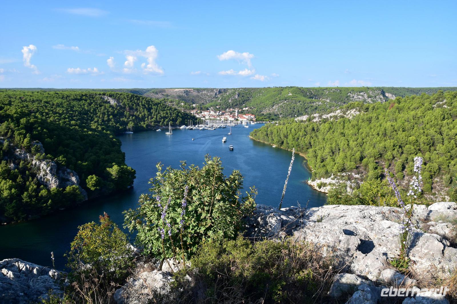 Auf der Rückfahrt machen wir noch einmal an der Krka-Brücke halt und genießen den herrlichen Blick auf die Flusslandschaft und die alte Königsstadt Skradin.