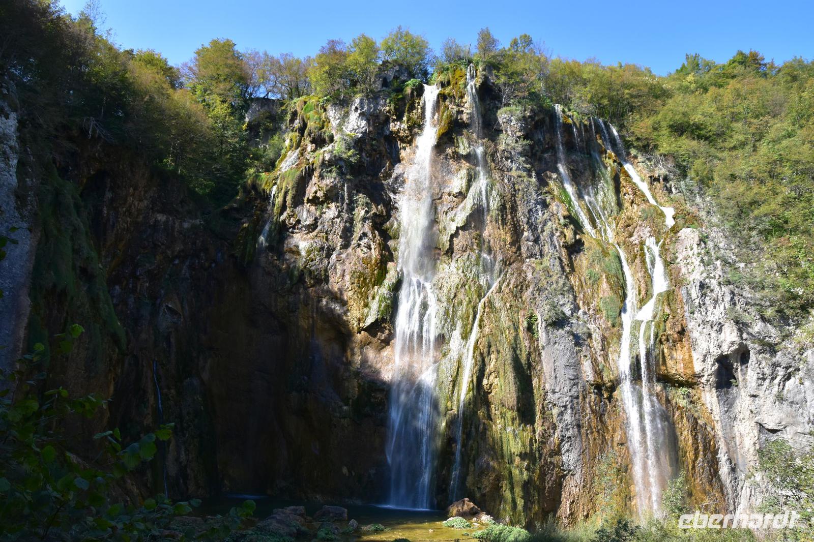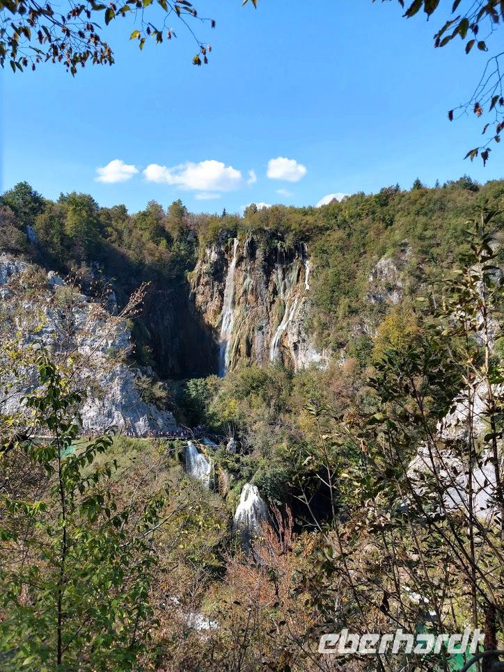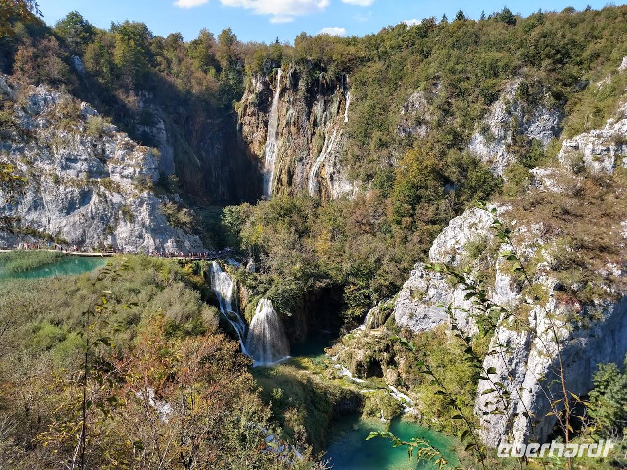 Wir gehen zuerst zur oberen Aussicht über die tiefe Schlucht dem „Silbersee" und dem 76 m hohen Wasserfall des Plitvicbaches. Dann steigen wir ins Tal ab, gehen über den ersten Travertindamm hinüber zu den großen Wasserfällen, bevor wir an den Seen entlang durch die Schlucht hinauf bis zum Großen See gelangen. Hier können wir uns etwas ausruhen und uns im Restaurant stärken. Dem folgt die lange Überfahrt über den großen See zum oberen Bereich des Nationalparks, den wir nun mit seinen idyllischen Seen und malerisch imposanten Wasserfällen besichtigen.