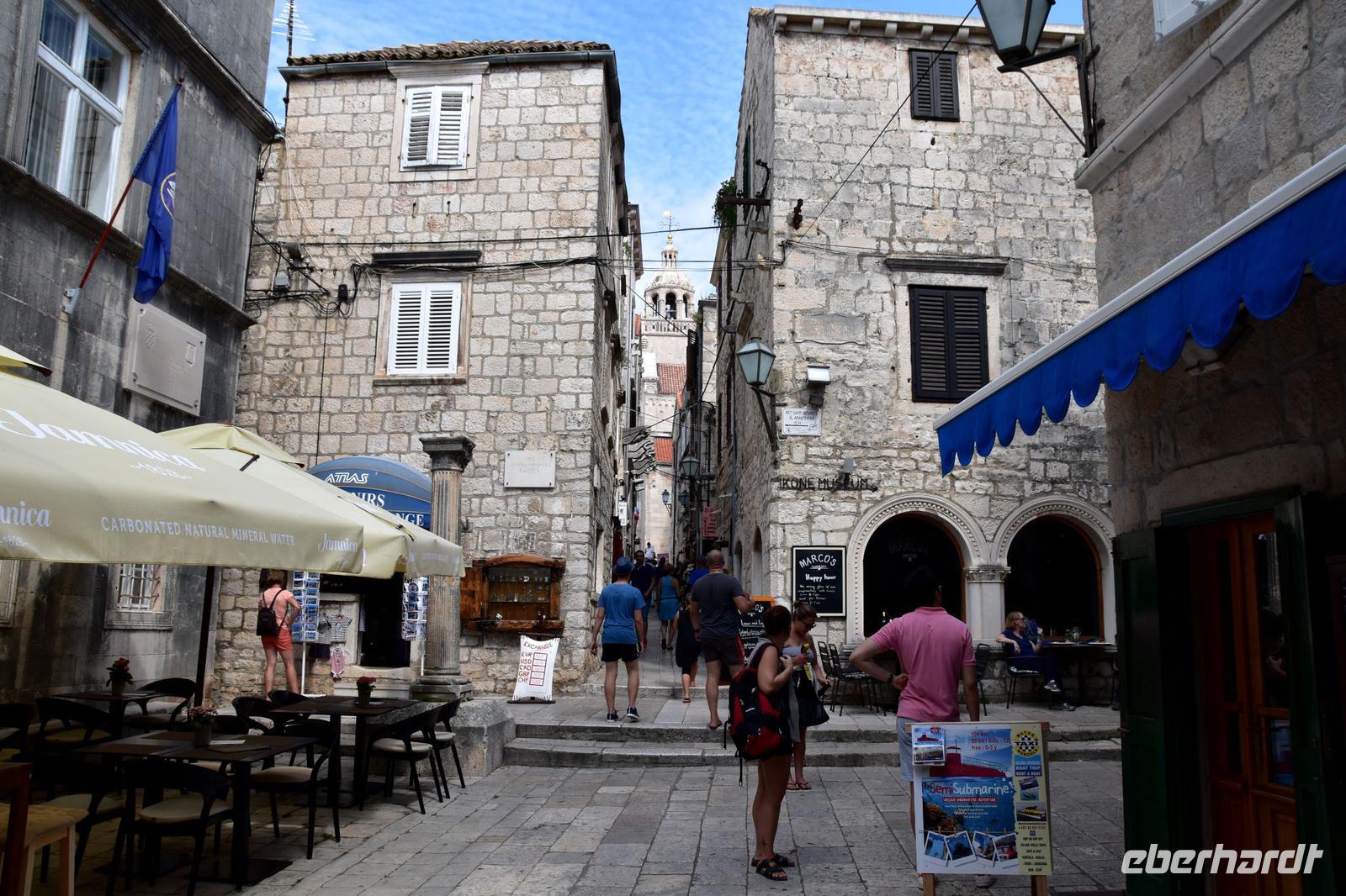 Über die gebirgige und fast 60 km lange Halbinsel geht es auf schmaler Gebirgsstraße durch Weingärten und vorbei an Austernzuchten an der Küste bis nach Orebic. Das herrlich am Meer gelegene Orebic, mit seiner wunderschönen Uferpromenade und den alten Kapitänshäusern ist ein lohnendes Ziel. Von hier bringt uns die kleine Fähre hinüber zur nahen Insel Korcula, mit ihrer gleichnamigen Hauptstadt. Stanka, die nette und lustige Gästeführerin wartet schon am Fähranleger auf uns. Wir erfahren von ihr mehr über die Heimat von Marco Polo und erleben das idyllische Städtchen Korcula mit seinen von begabten Steinmetzen errichteten Bauwerken, erfahren viel über die lebendigenden Sitten und Bräuche sowie die alte Schiffbautradition. In dem romantischen Ort fällt es uns auch nicht schwer die anschließende Freizeit bis zur Rückfahrt der Fähre sinnvoll zu nutzen.