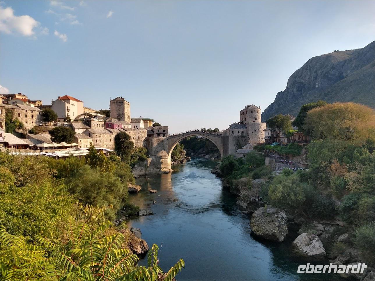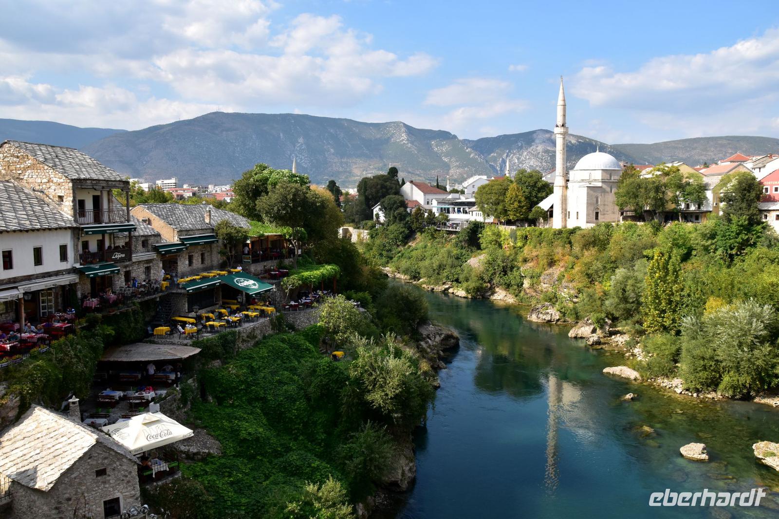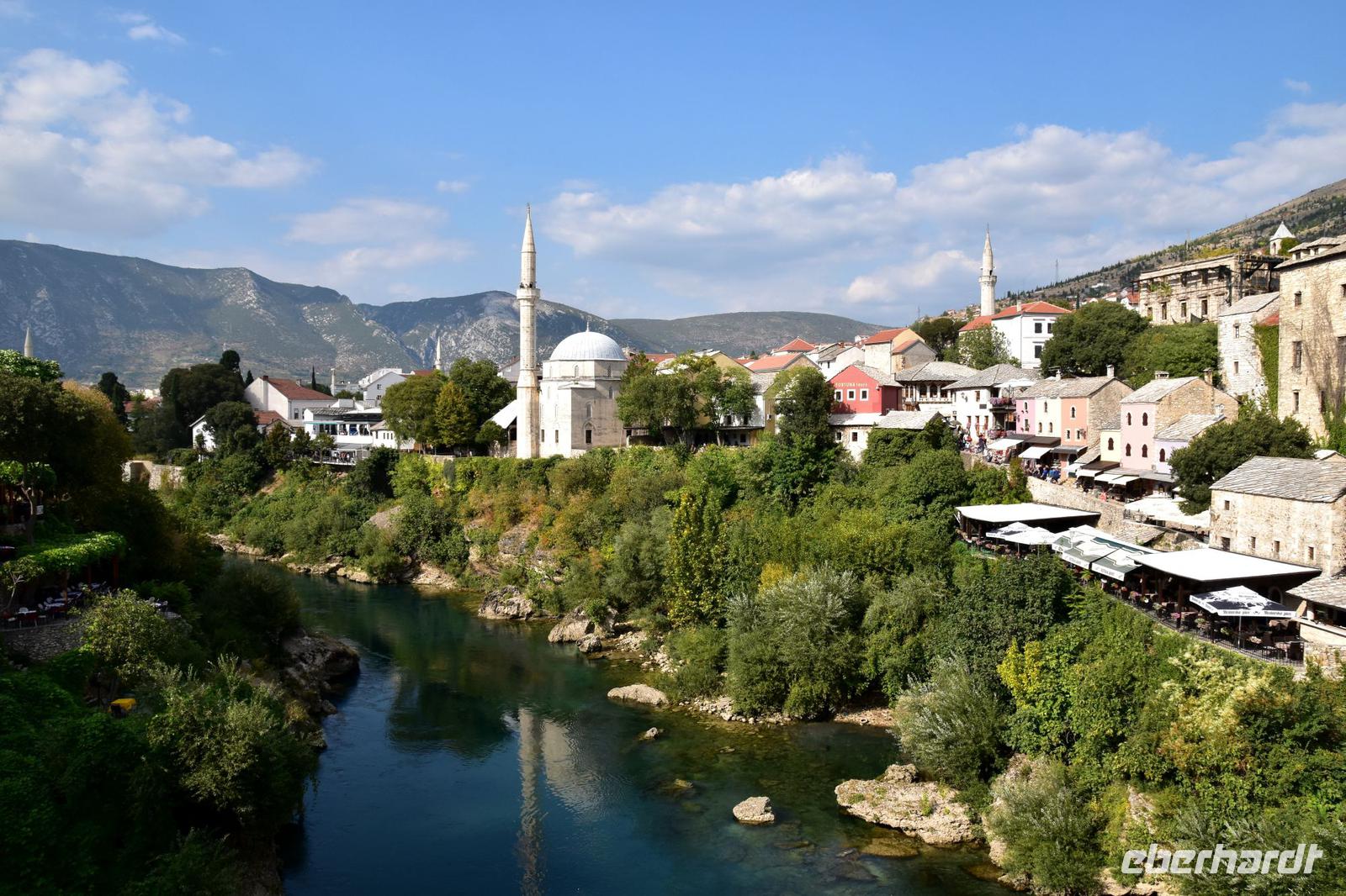 Den Grenzübergang Nova Sela passieren wir reibungslos und so haben wir Zeit einen kleinen Spaziergang durch das morgenländische Pocitelj, mit seiner Festung, den muslimischen Wohnhäusern, der alten Karawanserei, dem Hamam und der Moschee zu machen. Pünktlich zur vereinbarten Zeit erreichen wir den Busparkplatz in Mostar und treffen hier unsere örtliche Stadtführerin Almira. Mit ihr unternehmen wir nach einer kleinen Stärkung einen hochinteressanten Stadtrundgang durch das wieder multikulturelle Mostar. Wir spazieren über die Alte Stadtbrücke, besuchen mit Almira ein türkisches Haus, wo wir viel über das Leben der islamischen Familien erfahren, und die historische Mehmed Pascha Moschee. Von ihrer Terrasse haben wir abschließend einen wunderschönen Blick auf das Flusstal und die Stadt mit ihrer berühmten Brücke.