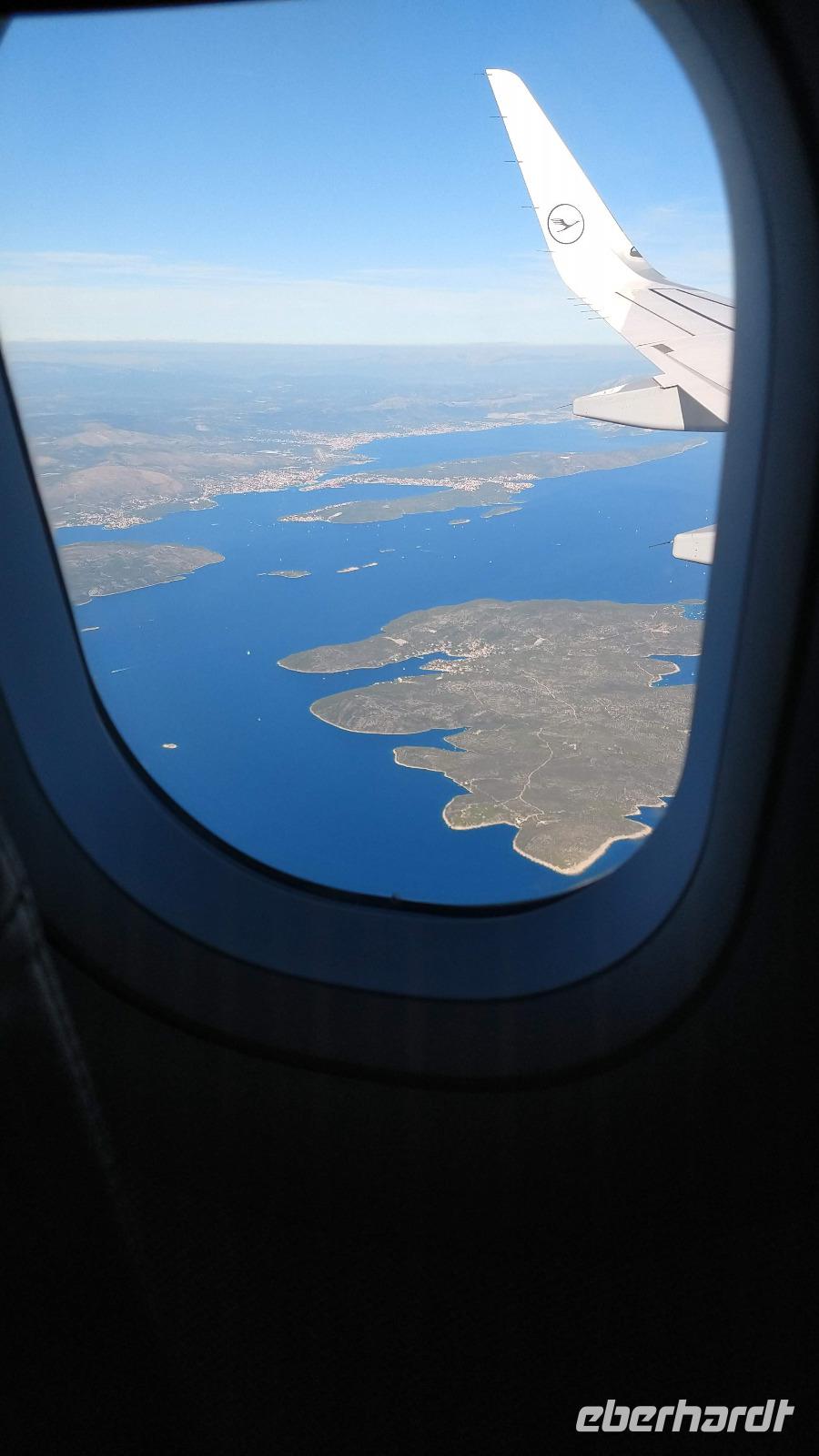 Gemeinsam gehen wir durch den Check Inn zur Lufthansa-Maschine nach Split. Über die Alpen hinweg Richtung Venedig und dann entlang der kroatischen Küste, erreichen wir pünktlich am Nachmittag Split, die zweitgrößte Stadt Kroatiens.