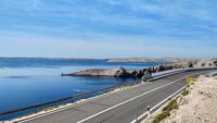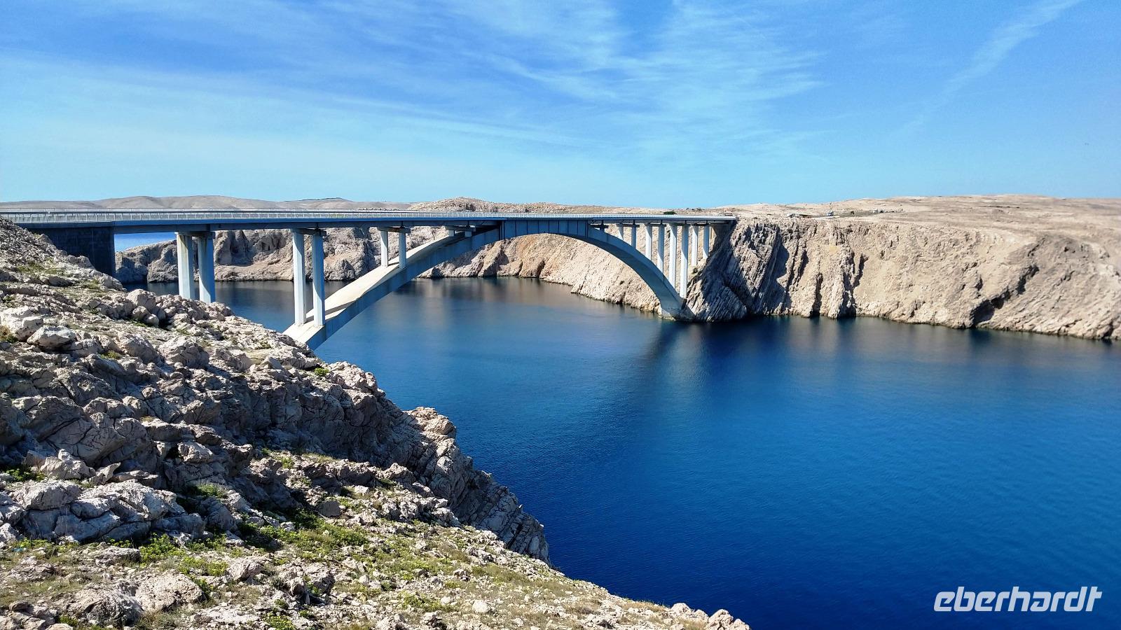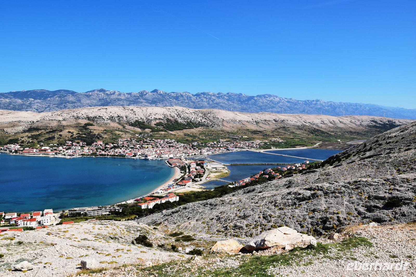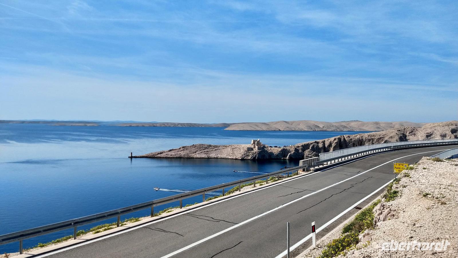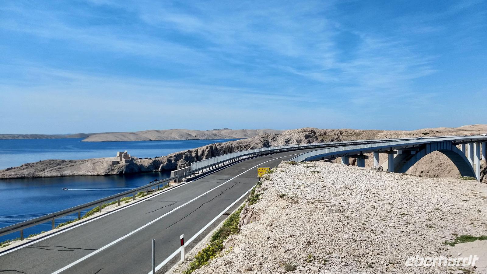 Erster Fotostopp ist an der Brücke, die das Festland mit der Insel verbindet. Dann geht es die Inselhauptstraße entlang - vorbei An der Stadt Pag - hinauf zur Aussicht über die Insel.