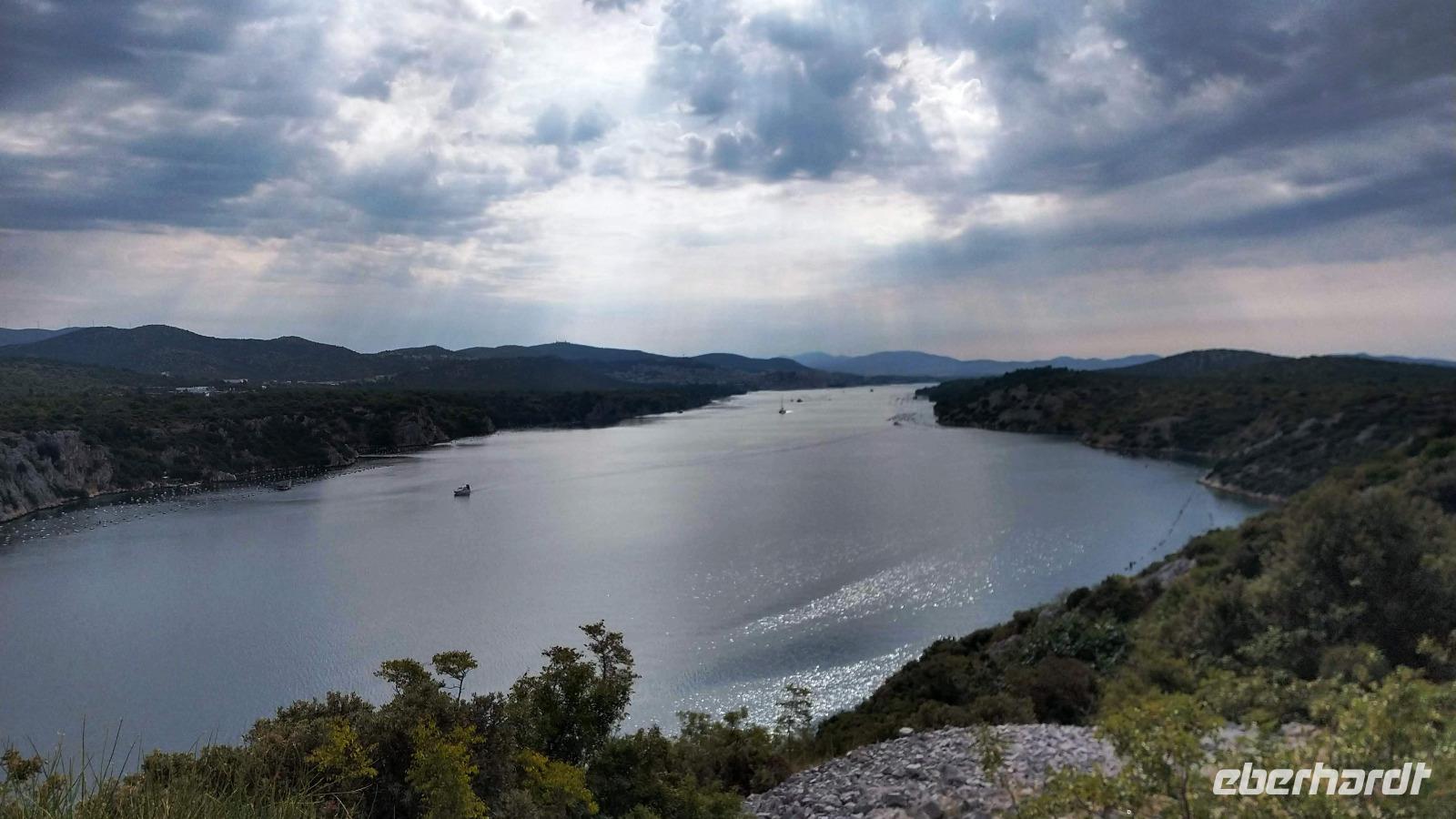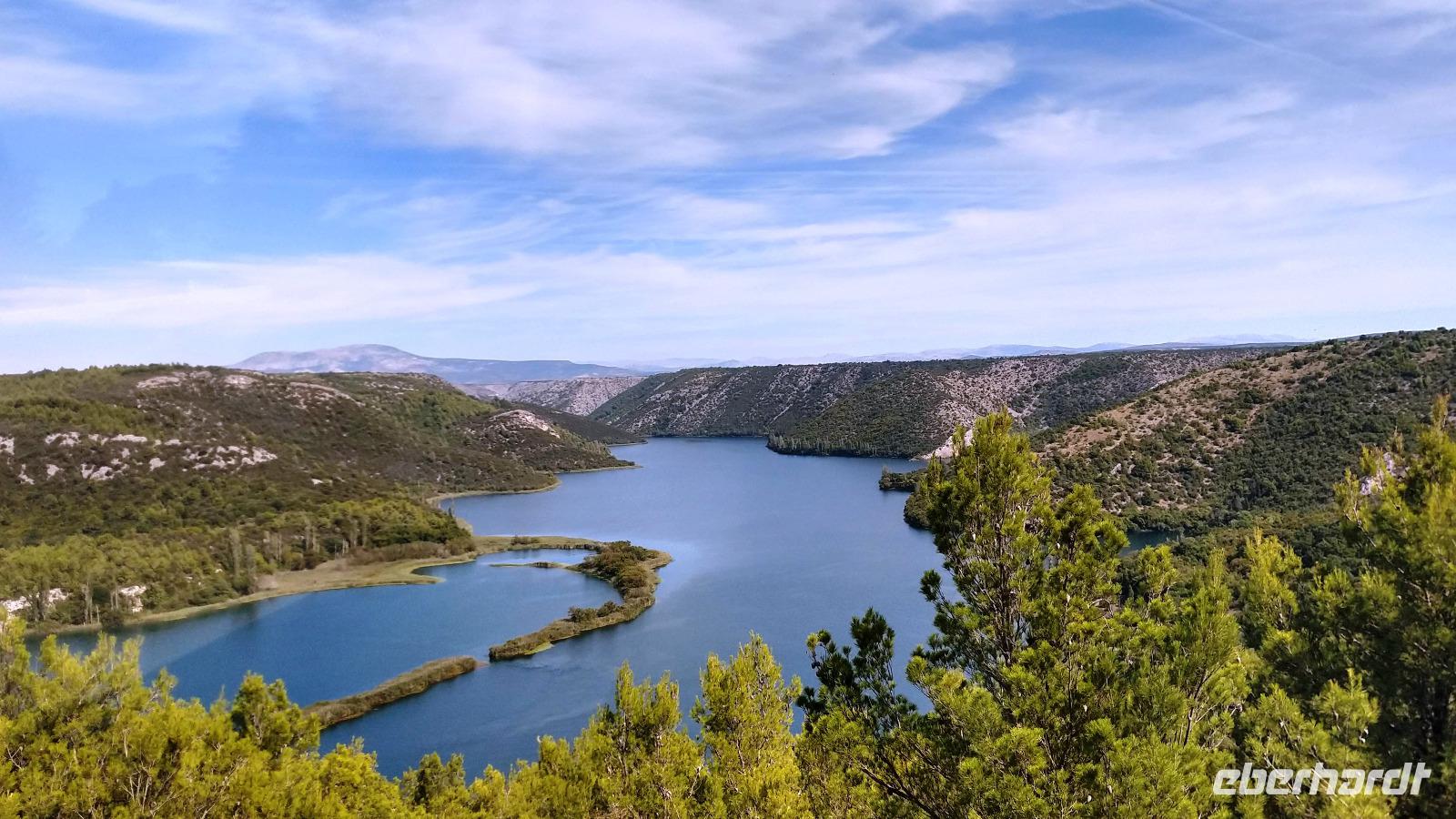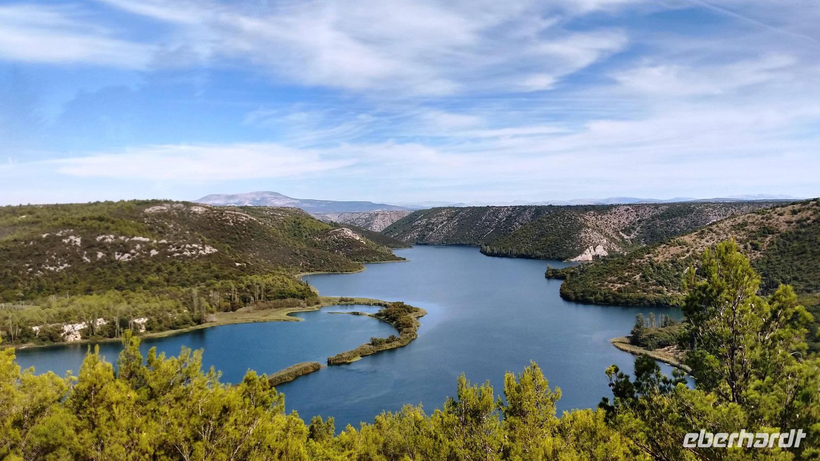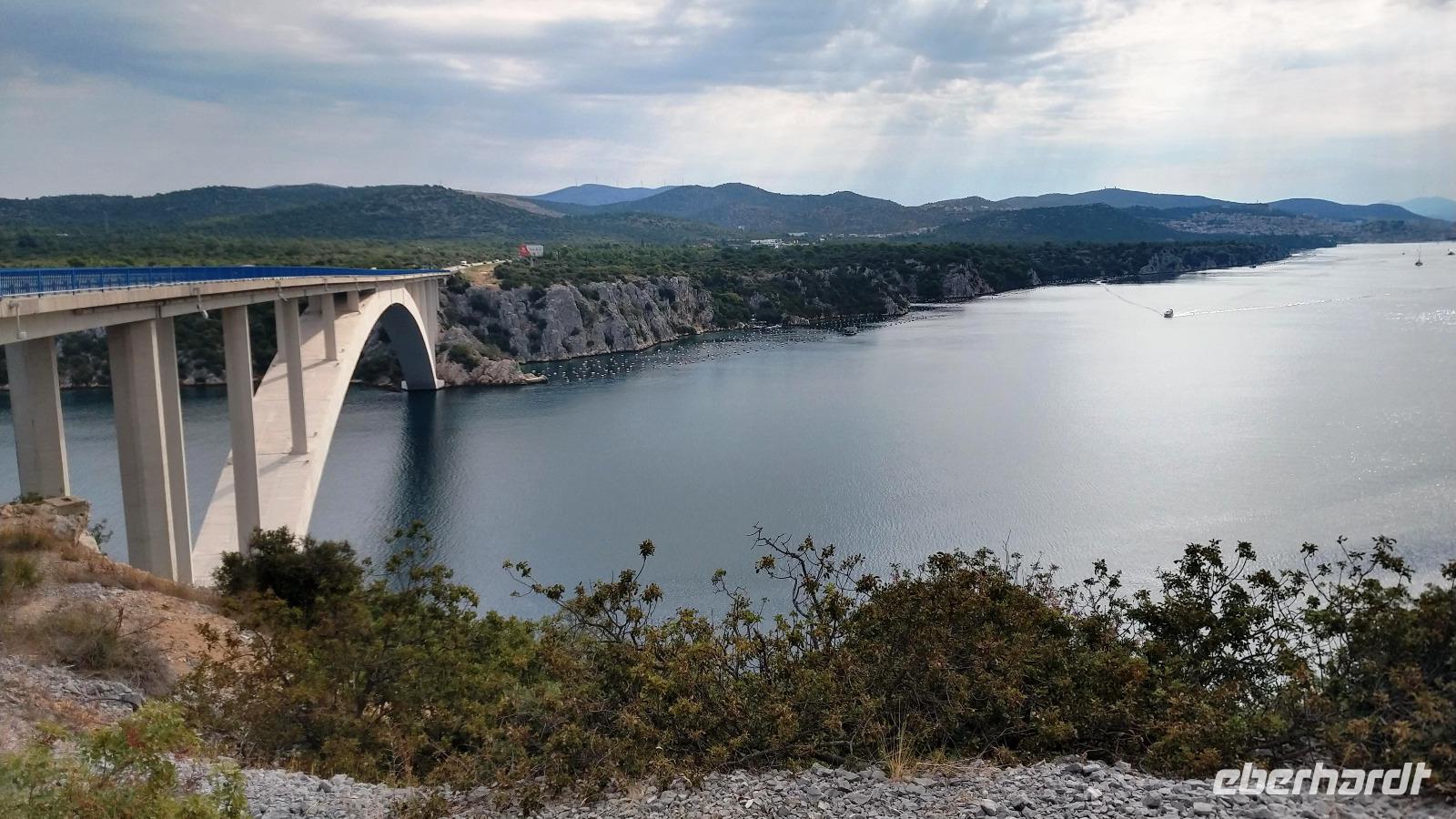 An der Autobahnbrücke über die Krka haben wir den ersten Blick auf die Seen des Unterlaufs des Flusses und auf die alte Königsstadt Skradin.