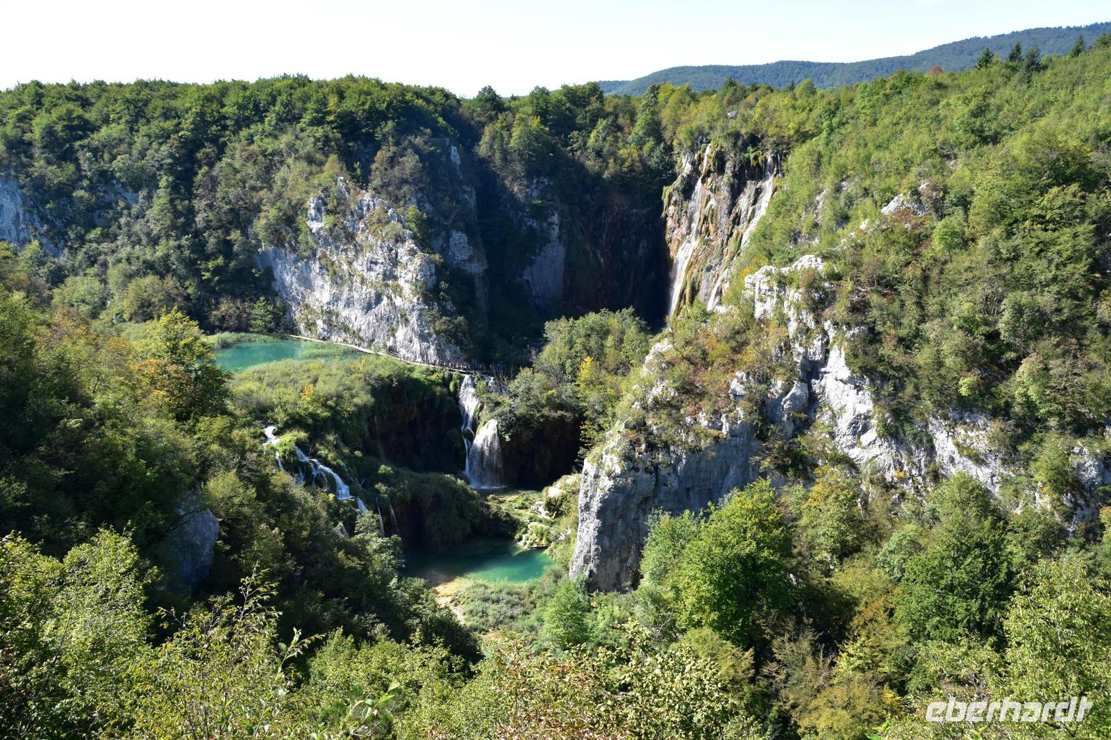 Auf der Höhe des Sveti Rok hat man einen schönen Blick auf die Küste, das Canyon von Obrovac und auf die Felsen des Velebit-Gebirges. Wir fahren durch den Tunnel des Velebit-Gebirges und erreichen bald die Lika. In diesem Gebiet liegt eines der einmaligsten und bedeutendsten Naturreservate Kroatiens, der 1949 gegründete Nationalpark Plitvicer Seen.