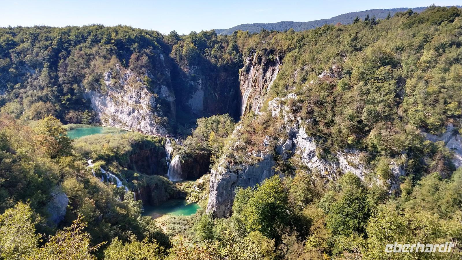 zum NP Plitwicer Seen. Die Sonne lässt Nebelwolken aus der See aufsteigen und erst bei der Auffahrt zum Velebit-Gebirge können wir wieder die Karstlandschaft sehen.