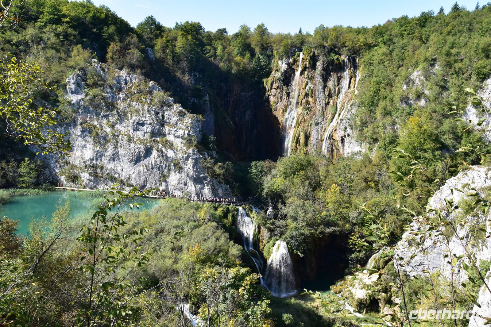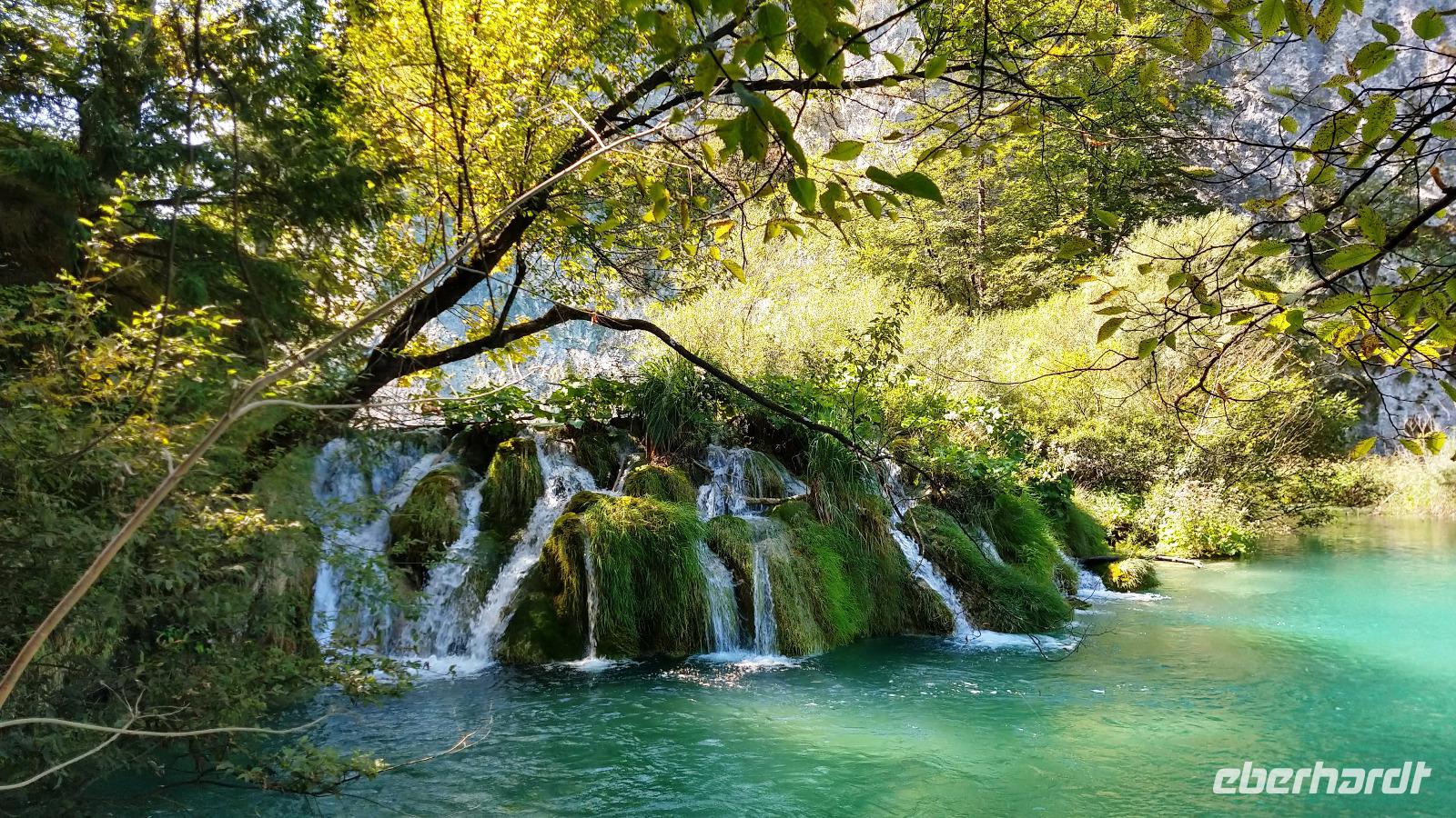 Mirjana, die Mitarbeiterin des Nationalparks ist, führt uns durch die herrliche Natur mit ihren Seen und Wasserfällen, die durch die Bildung der Travertinterrassen entstanden sind. Zuerst besichtigen wir den unteren Teil mit dem größten Wasserfall, dem des Plitvicbaches mit einer Höhe von 76 m. Dann geht es die Schlucht aufwärts zum großen See und nach der Überfahrt erkunden wir den romantisch schönen Naturpark über die Höhenaussichten.