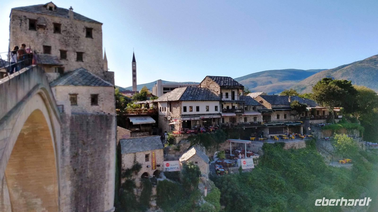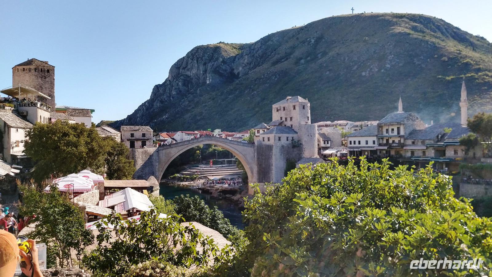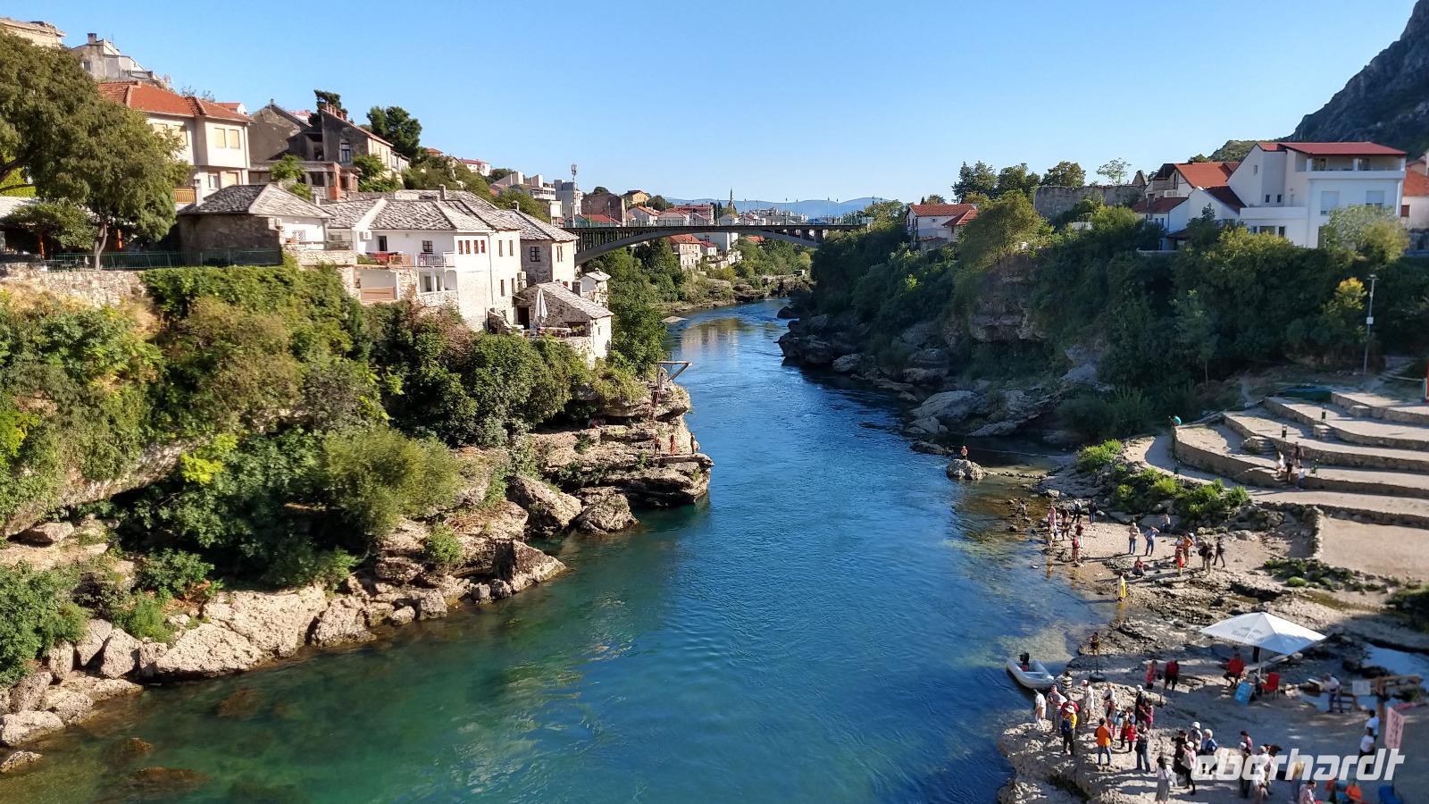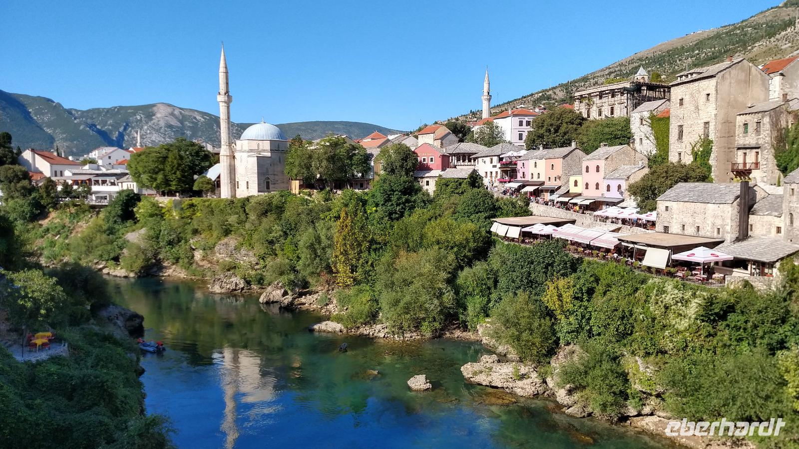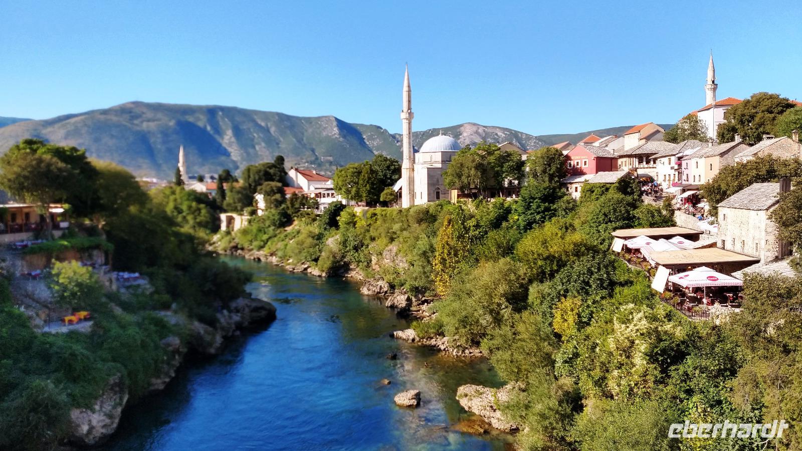 Nach kurzem Stopp in Neum, geht es ein Stück durch die Berge zum Grenzübergang, schließlich zurück ins Tal, und an der Neretva stromaufwärts, vorbei am historischen Festungsort Pocitelj. Durch die Grenzkontrolle erreichen wir leider nicht so pünktlich die im Bergtal gelegene Stadt mit der berühmten Alten Brücke.
