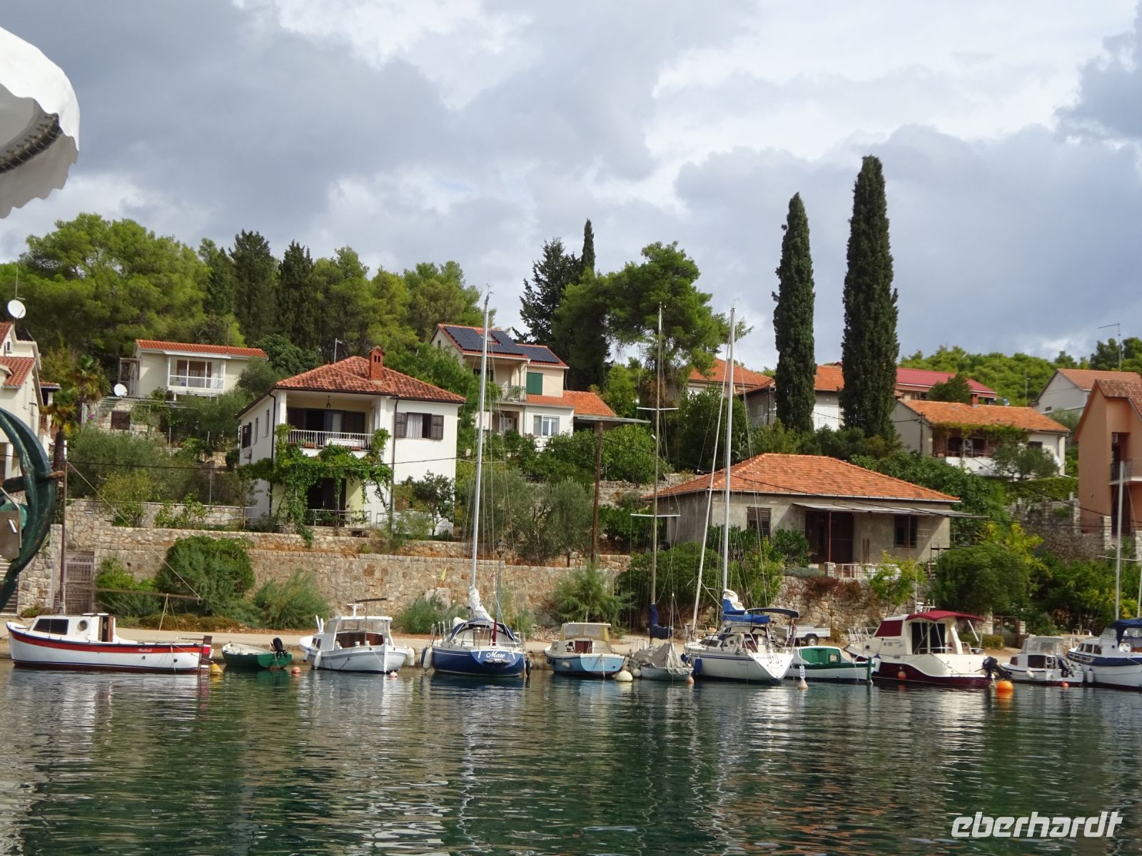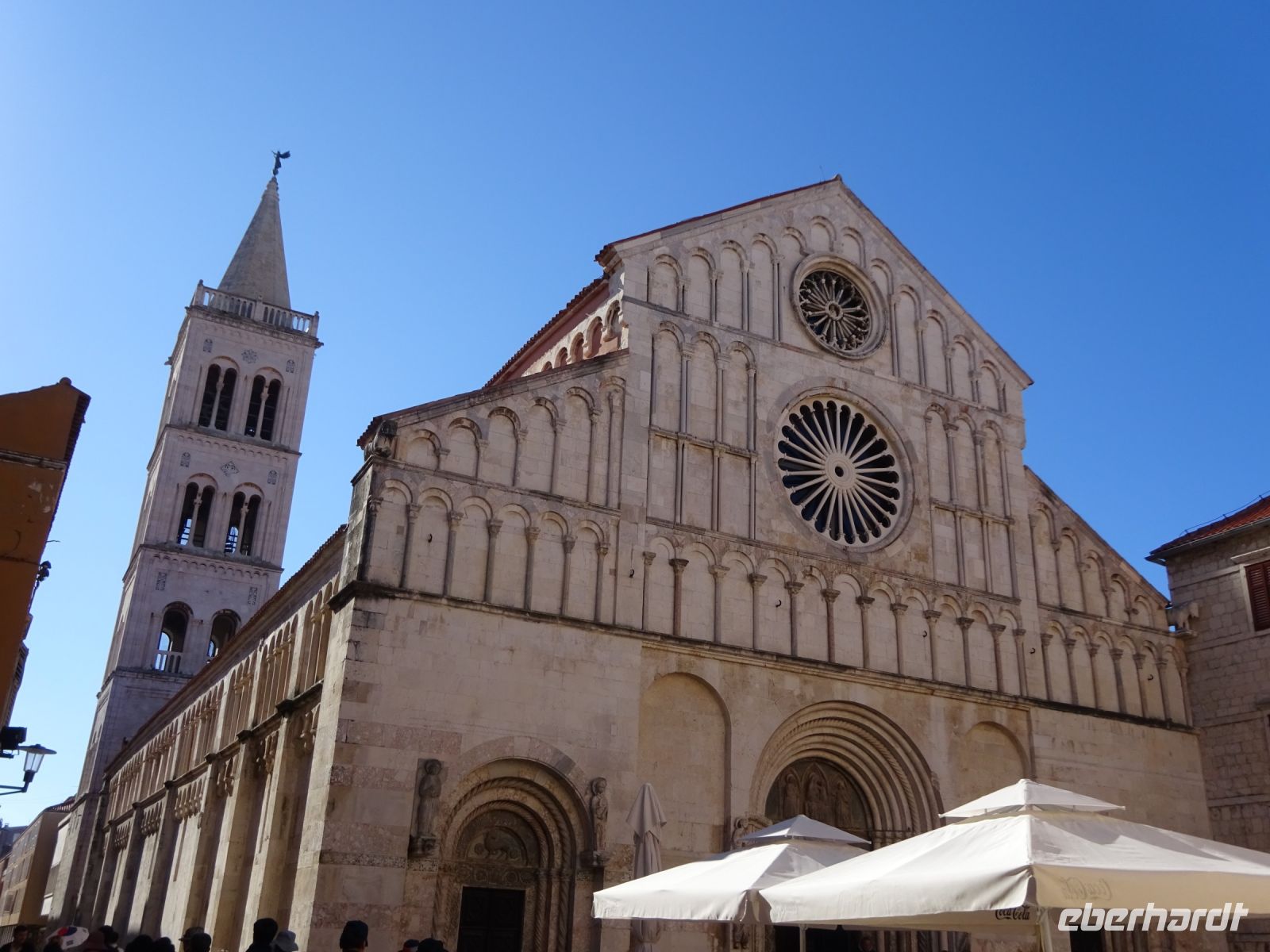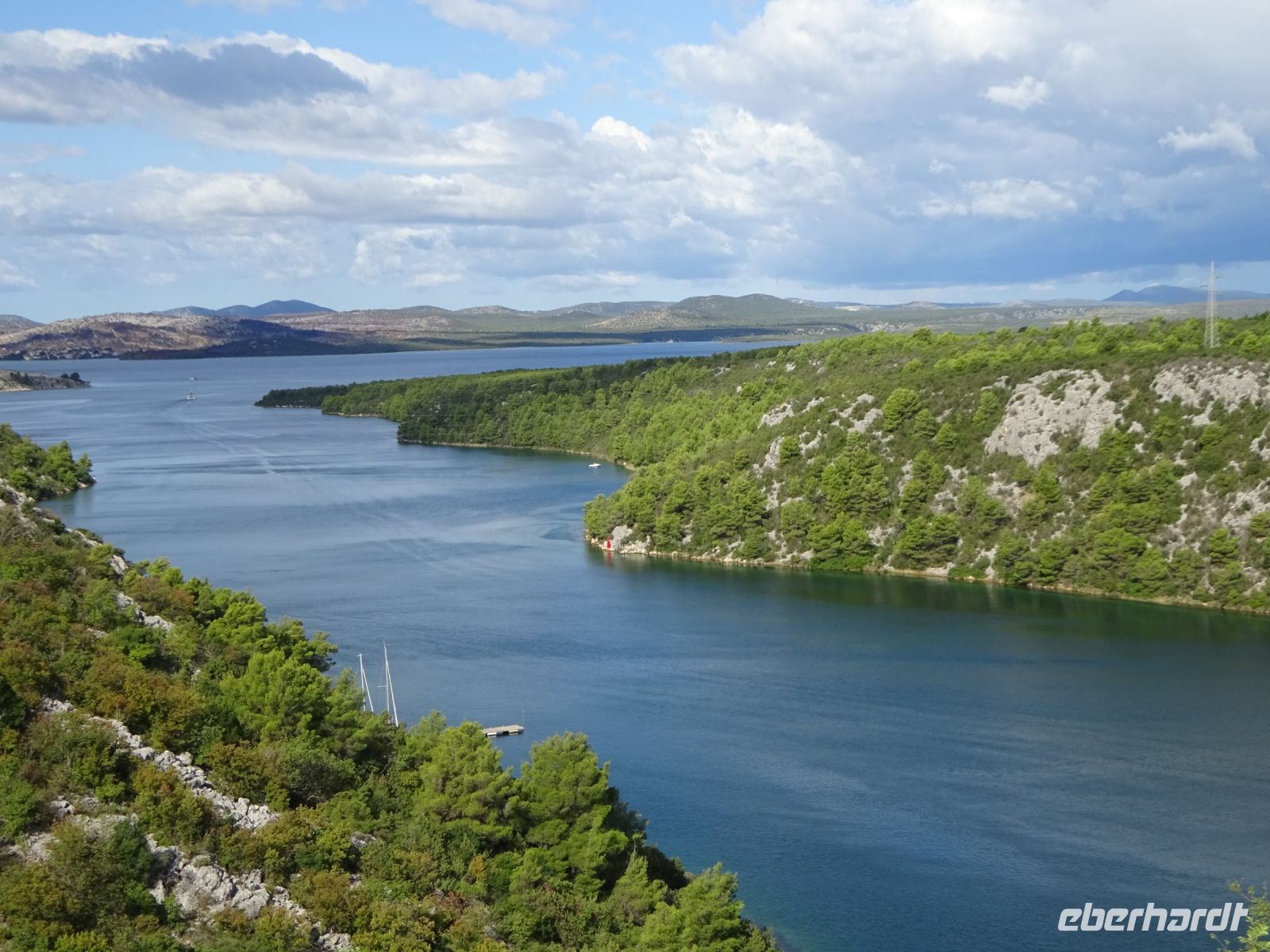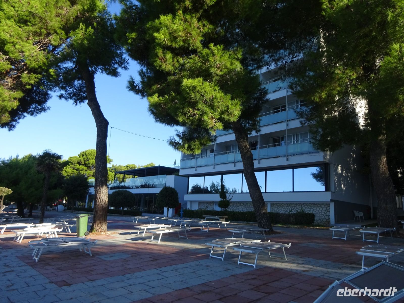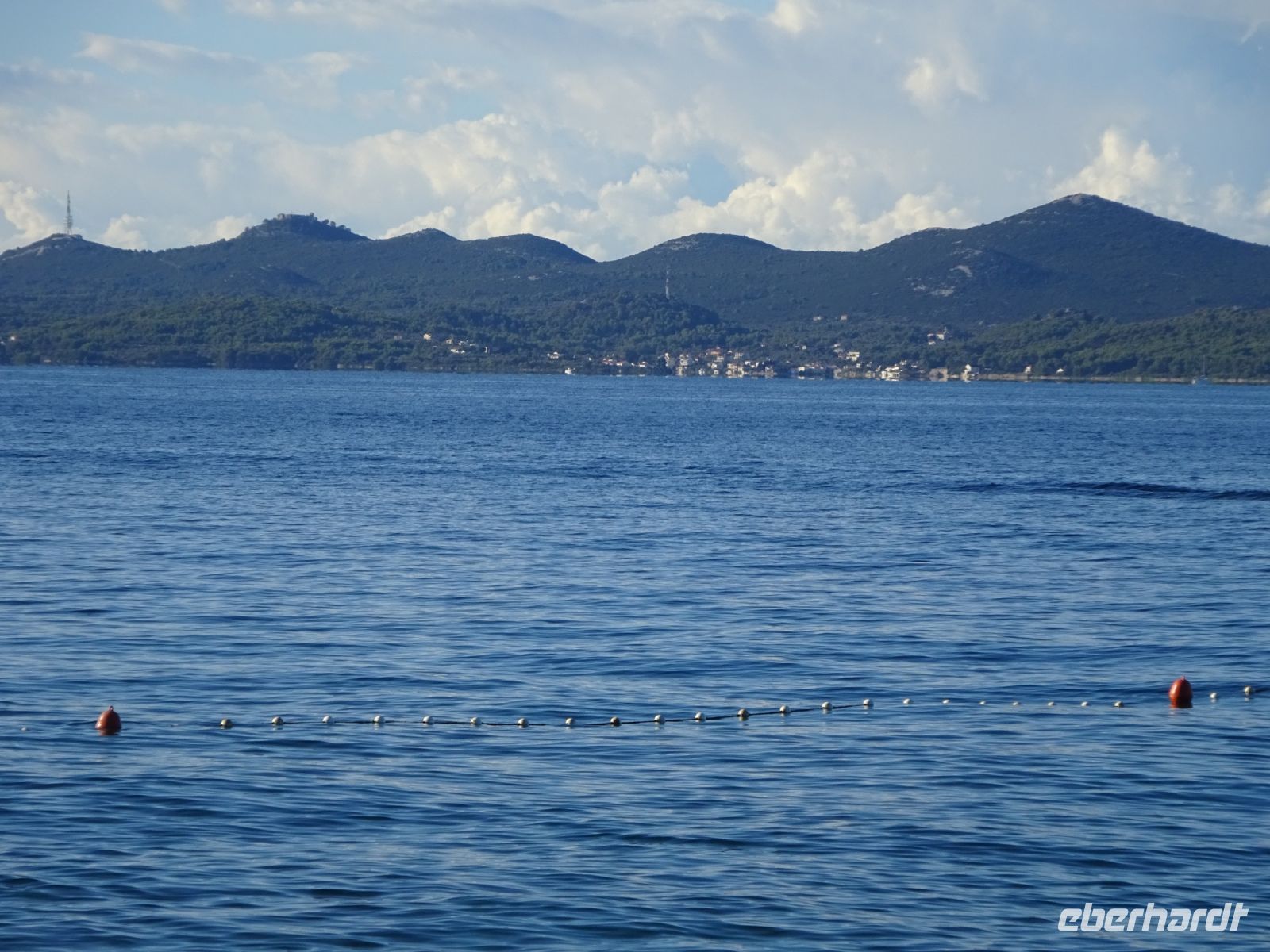 Der Reisetag begann für uns ziemlich früh, denn um 6.00 Uhr traf sich der größte Teil der Gruppe auf dem Flughafen BER. Die Formalitäten waren schnell erledigt. Über Wien ging es nach Split. Alles lief glatt. Unsere 3 Gäste aus Stuttgart waren sogar schon ein wenig früher da. Über die überdachte Brücke gingen wir zum Busbahnhof gleich neben dem Flughafengebäude. Dort wartete Boris, unser Busfahrer. Die Koffer waren schnell verladen, und los ging es zu unserem Hotel Pinija im Ort Petrcane unweit der Stadt Zadar. Unterwegs gab es schon einige Informationen zu den Orten an der Strecke. Was uns aber ordentlich Respekt einflößte, war die aufkommende Bora, der Fallwind, eine äußerst tückische Angelegenheit. Unser Busfahrer Boris hielt das Lenkrad fest in der Hand. Und von ihm erfuhren wir eine Menge über die Bora, auch über die in einem solchen Fall zu erwartenden Straßensperrungen. Da gibt es klare Regeln und Vorschriften. Schließlich kamen wir wohlbehalten in unserem Hotel Pinija an, genossen das sehr gute Abendbuffet, erkundeten den Strand und die Pools schon ein wenig, freuten uns über die herrliche Aussicht und machten es uns dann in den gemütlichen Zimmern bequem. Ein wenig steckte uns doch der Reisetag in den Gliedern. Und die nächsten Tage waren gut gefüllt mit Sehenswürdigkeiten in Städten und auch in der Natur. Da wollten wir fit sein.