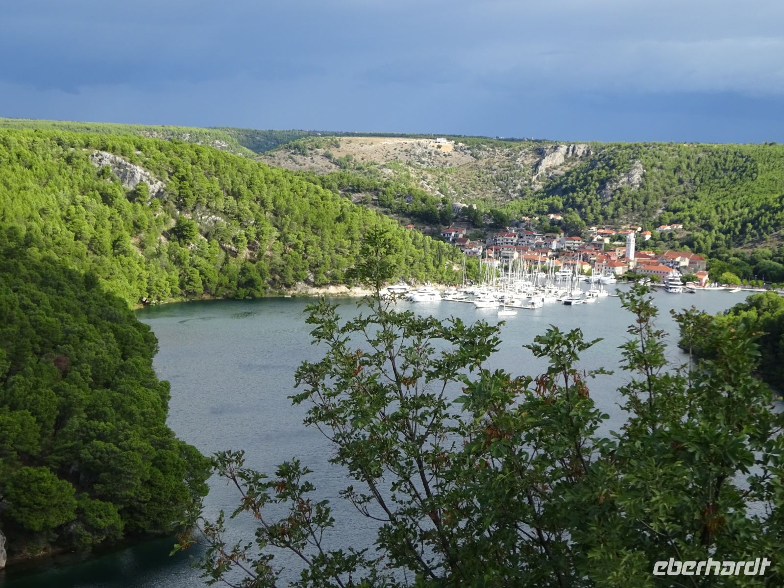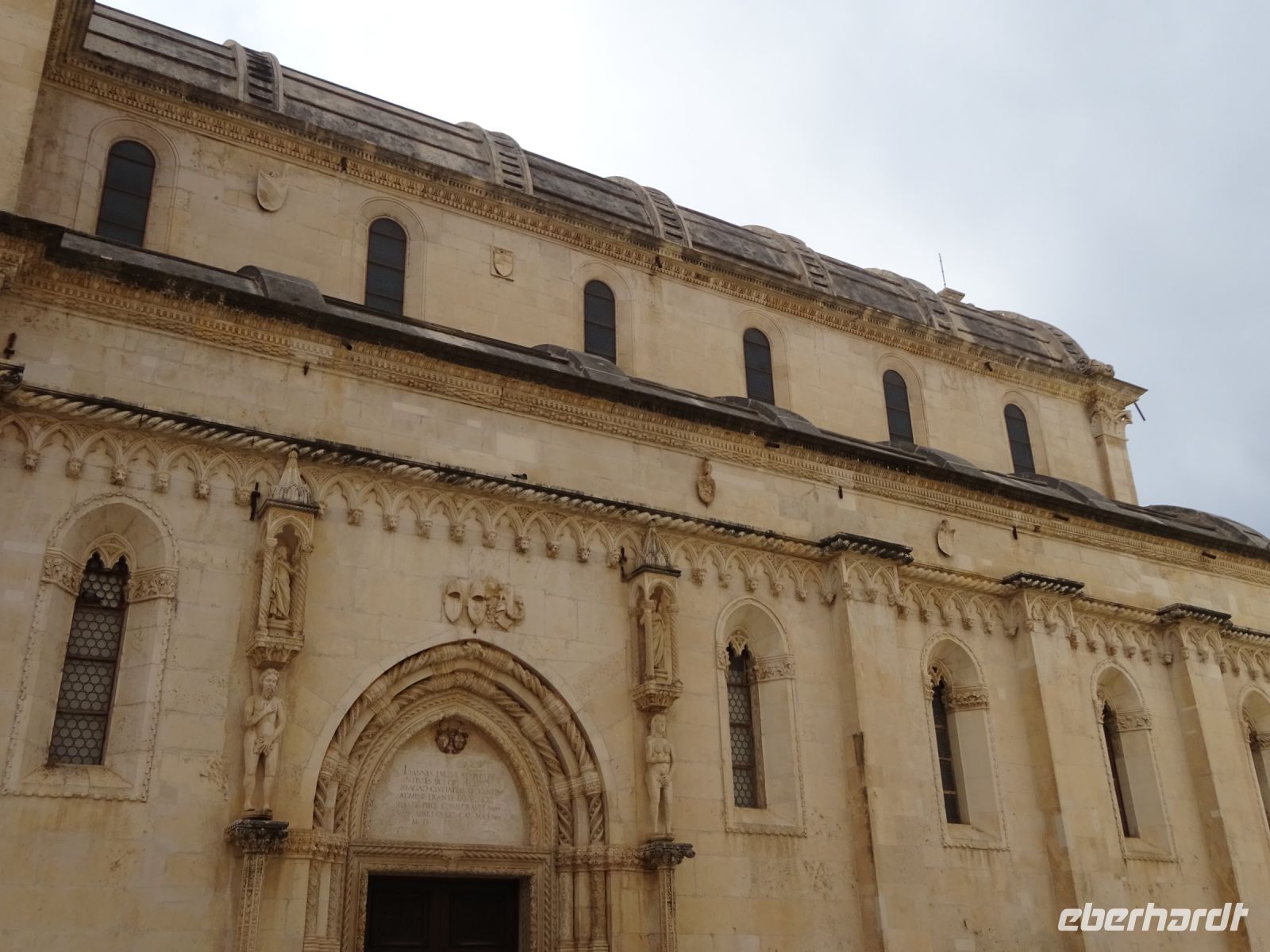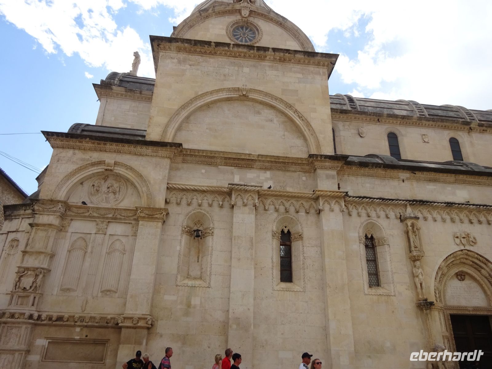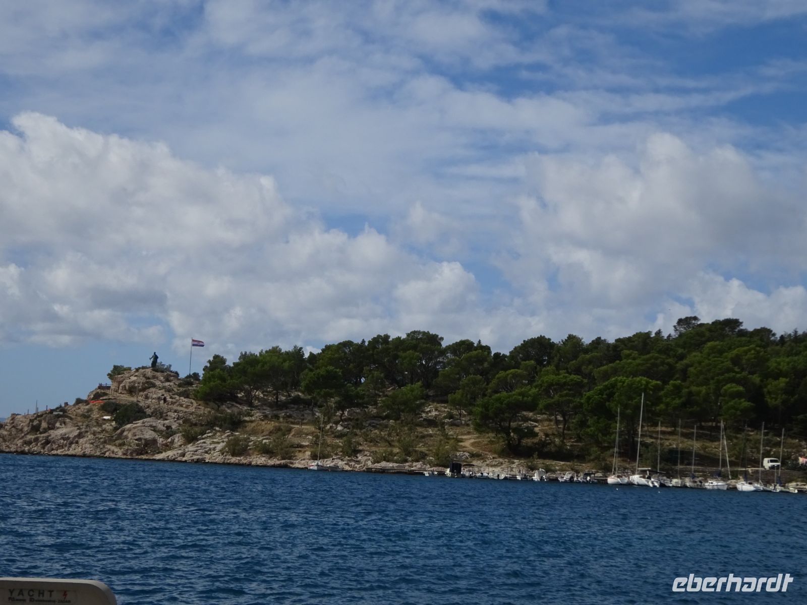 Heute stand am Vormittag der Besuch im Krka-Nationalpark auf dem Programm, ein ganz besonderes Erlebnis. Schon die Fahrt dorthin ist beeindruckend. Bereits von der Autobahnbrücke über die Krka gewinnen wir einen ersten Eindruck. Der Fluss hat sich hier durch eine tiefe Schlucht den Weg gebahnt. Die Eintrittskarten sind am Eingang schnell geholt, Boris fährt uns noch ein Stück, dann beginnen wir unseren Rundgang. Wir gehen über markierte Wege, bleiben immer wieder stehen, um alles möglichst im Foto festhalten zu können. Die Krka fließt hier kilometerweit durch eine Schlucht und bildet auf dem Weg zum Meer sowie beim Durchbruch durch das Gestein zahlreiche Seen und Wasserfälle. Natürlich hatte es uns der große Wasserfall angetan. Aber auch die Mühlen und die sogen. „Wäscherei“ waren sehenswert. Es ist ein großartiges Erlebnis, zu dem heute als Zugabe auch ein ordentlicher Regenguss gehört. Einige hatten Glück und fanden rechtzeitig Unterschlupf, andere waren wirklich pitschnass geworden. Aber das konnte unsere Stimmung nicht trüben. Hier scheint auch schnell die Sonne wieder, wie wir lernen konnten. Es gab sogar einen Regenbogen. Boris holte uns mit dem Bus am Treffpunkt ab, und weiter ging es zum Nachmittagsprogramm nach Šibenik, wo uns unsere Stadtführerin Marina schon erwartete. Auch diese Stadt, gelegen an der verbreiterten Mündung des Krka-Flusses, hat allerhand zu bieten. Das wurde uns schnell klar. Marina nahm uns mit auf einen interessanten Rundgang in diese wirklich sehenswerte Altstadt mit ihren verwinkelten Gassen und der Festung St. Anna. Den größten Eindruck machte auf uns aber die Kathedrale St. Jacob, ein einzigartiges Bauwerk, was ganz ohne Mörtel gebaut ist und nur durch den direkten Verbund der Steine hält und, wie könnte es anders sein, zum UNESCO-Weltkulturerbe gehört. Der geniale Baumeister dieses Kunstwerkes ist Juraj Dalmatinac. Einige von uns sahen sich die Kathedrale auch noch innen an, besonders die einzigartige Taufkapelle. Noch etwas individuelle Freizeit in dieser schönen Stadt, ein Spaziergang durch den Park und dann vorbei an der Hafenpromenade, und wir trafen uns alle im Bus, um zurück in unser Hotel zu fahren.