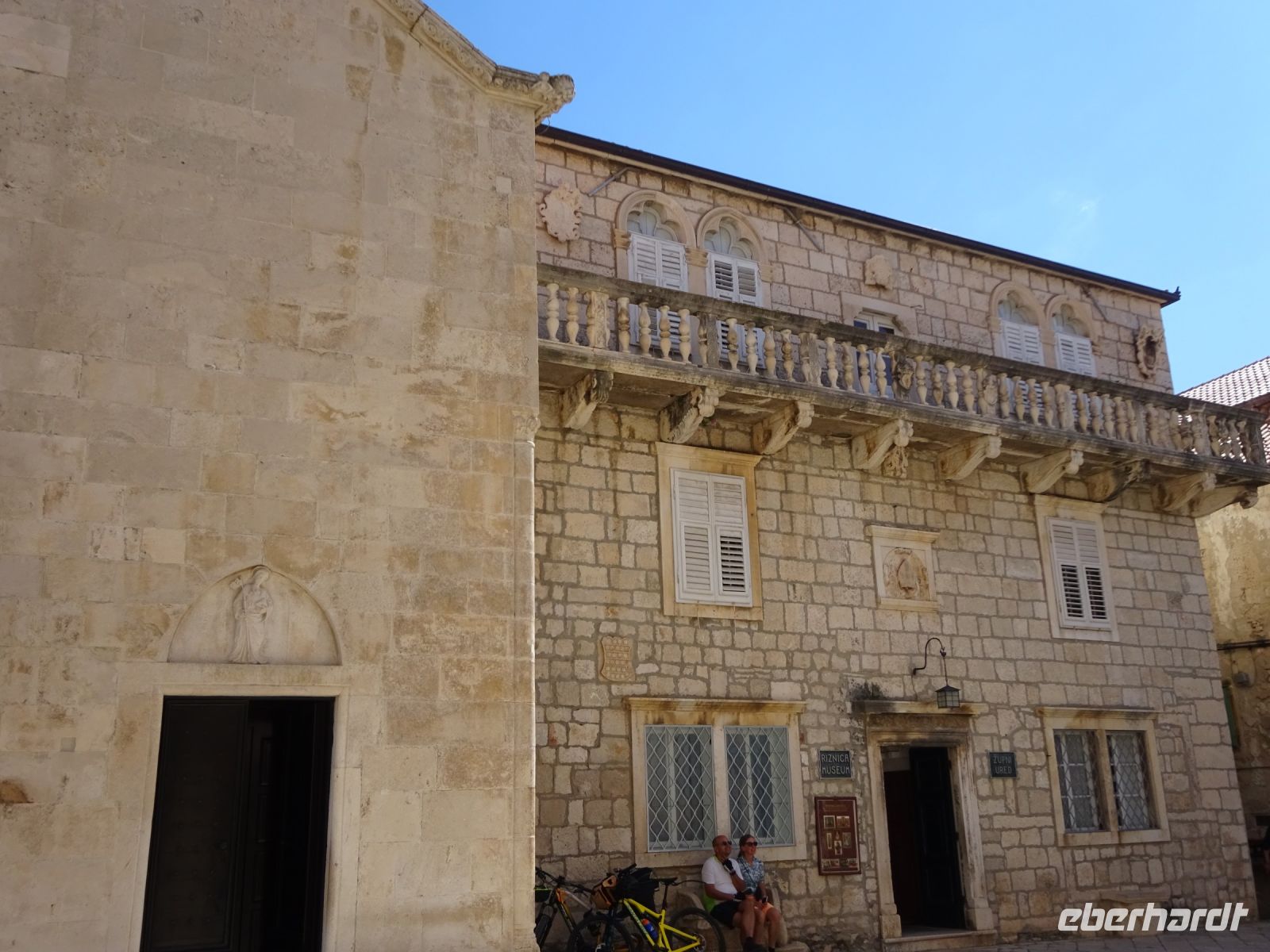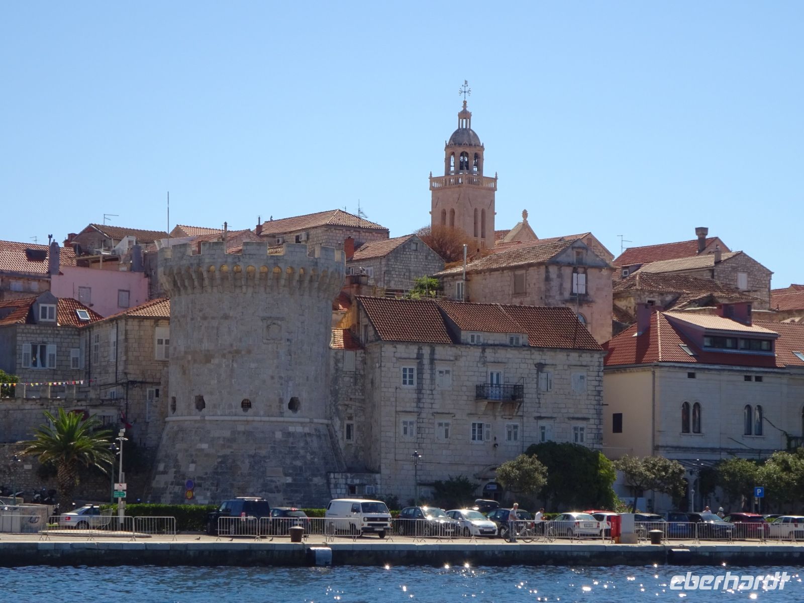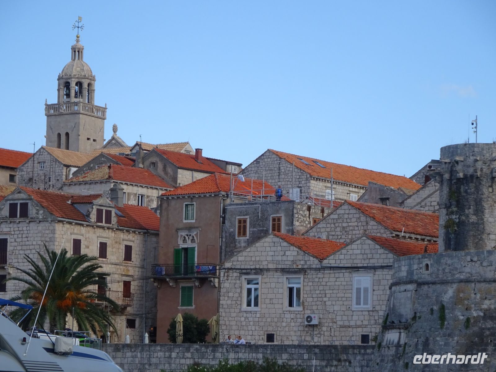 Der heutige Tag steht ganz im Zeichen von Insel und Inselhauptstadt Korcula. Zunächst fahren wir mit dem Bus auf die zweitgrößte Halbinsel Kroatiens nach Pelješac. Mit der Fähre geht es dort vom Ort Ostrebic hinüber zur Inselhauptstadt von Korcula, nach Korcula-Stadt. Schon von der Fähre aus haben wir einen wunderbaren Blick auf diese majestätische Stadt, bekannt geworden u.a. auch durch Marco Polo. Am Fähranleger wartet unsere örtliche Stadtführerin Stanka schon. Es geht auch gleich los mit der Geschichte und den wichtigsten Sehenswürdigkeiten dieser wehrhaften Stadt mit einem geschlossenen mittelalterlichen Stadtbild. Dazu haben wir mal wieder Sonne satt. Man spürt, dass Stanka von ihrer Heimatstadt begeistert ist. Natürlich ist Korcula die schönste Insel Kroatiens. Das hat uns Stanka gleich beigebracht. Und wir müssen ihr zustimmen. Die Stadt wurde im 13. Jh. im Fischgrätengrundriss angelegt, um Platz zu sparen. Über eine schöne Treppe gehen wir in die Stadt hinein. Enge Gassen, schöne Plätze prägen Korcula-Stadt. Ein herausragendes Kulturdenkmal ist die Kirche St. Markus. Zahlreiche Türme der Stadtbefestigung sind noch heute erhalten. In der anschließenden Freizeit durchstreifen wir die Gassen, umrunden die Stadt sogar entlang der Mauer, haben genügend Zeit, die Mittagspause zu genießen, bevor wir uns dann alle am Fähranleger treffen und die Rückfahrt antreten, zunächst mit der Fähre bis Orebic, dann weiter mit dem Bus. Im Hotel in Neum wartet wieder ein schmackhaftes Abendessen auf uns. Auch eine Runde im Pool oder im Meer sind noch möglich. Es ist einfach toll!