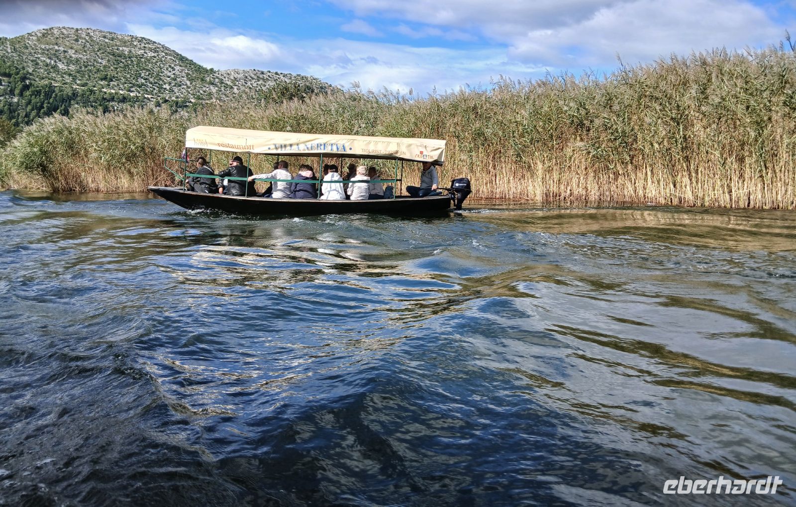 Heute erwartete uns ein ganz besonderes Erlebnis: die Bootsfahrt im Neretva-Delta. Traditionelle Holzboote glitten durch die Kanäle, rechts und links hingen Mandarinen schwer von den Ästen, während Reiher und andere Vögel über den Schilffeldern kreisten. Es war, als ob wir eine kleine Oase durchstreiften. An Bord wurden wir herzlich mit Schnaps und Feigen begrüßt. Beim anschließenden Mittagessen in der Villa Neretva kosteten wir bei einheimischer Musik regionale Spezialitäten und spürten die herzliche Gastfreundschaft.