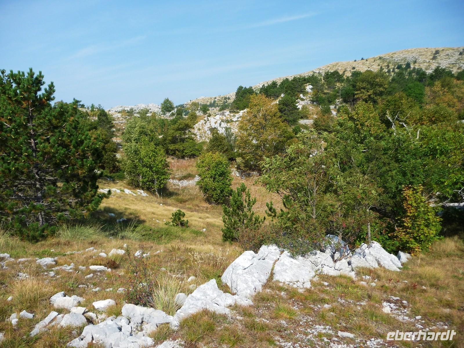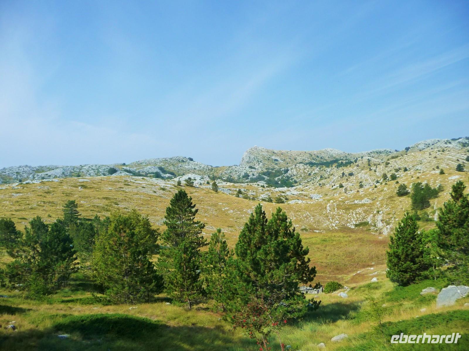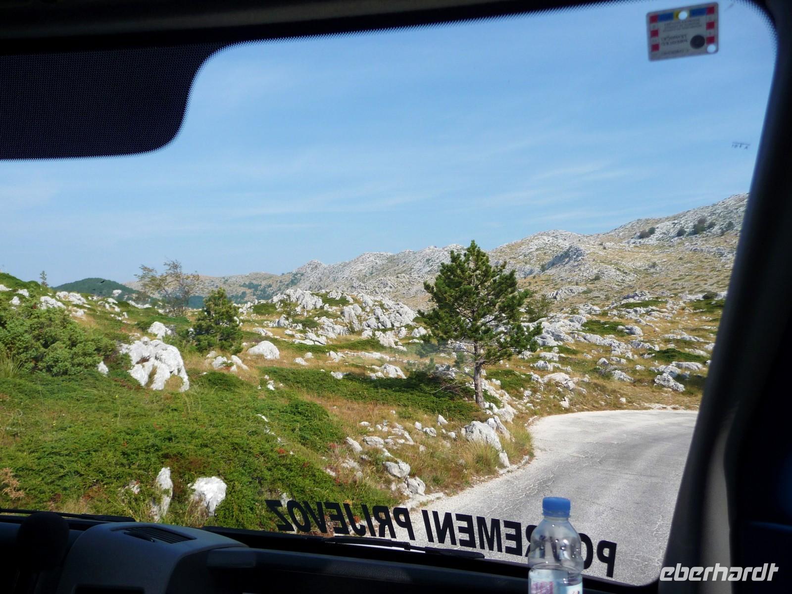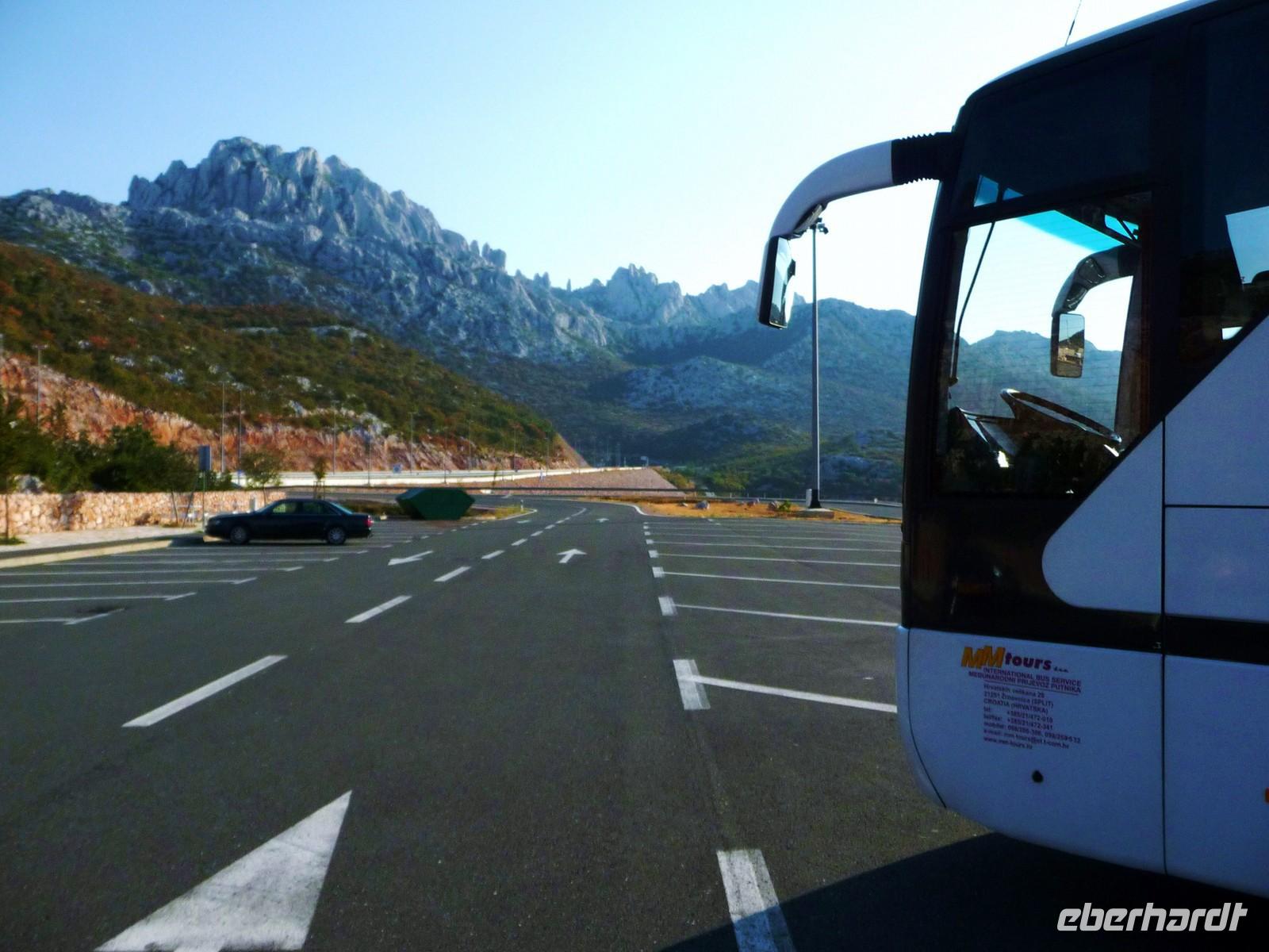 8:00 Uhr Abfahrt zum NP Plitwicer Seen und nach Auffahrt zum Velebit-Gebirge Fotostopp am Rasthaus rechts, schöner Blick auf die Küste und auf die Felsen des Velebit-Gebirges; schöne Fahrt durch die Gebirgslandschaft des Velebit;
