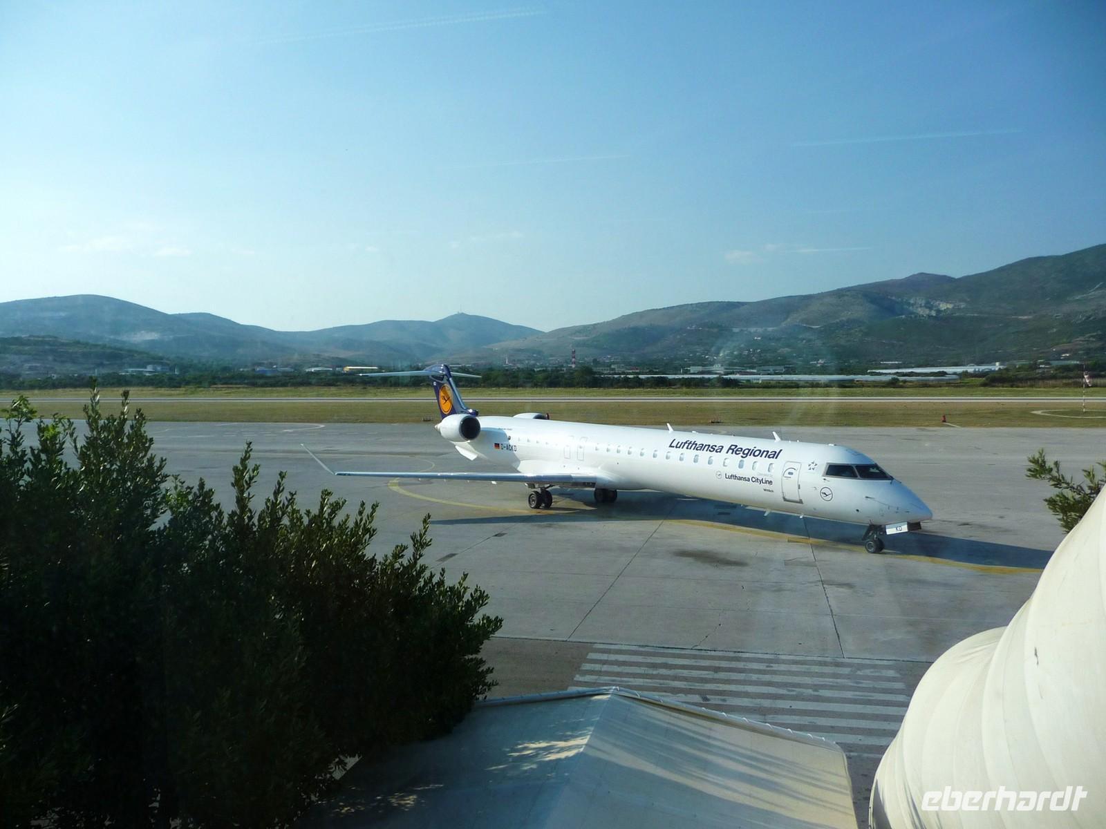 Gemeinsamer Weg zum Weiterflug am Gate 61, Ausweiskontrolle, Toiletten und Check Inn in die Lufthansa-Maschine nach Split, Ankunft 16:10 Uhr in Split, bei Sonnenschein und 30ºC;