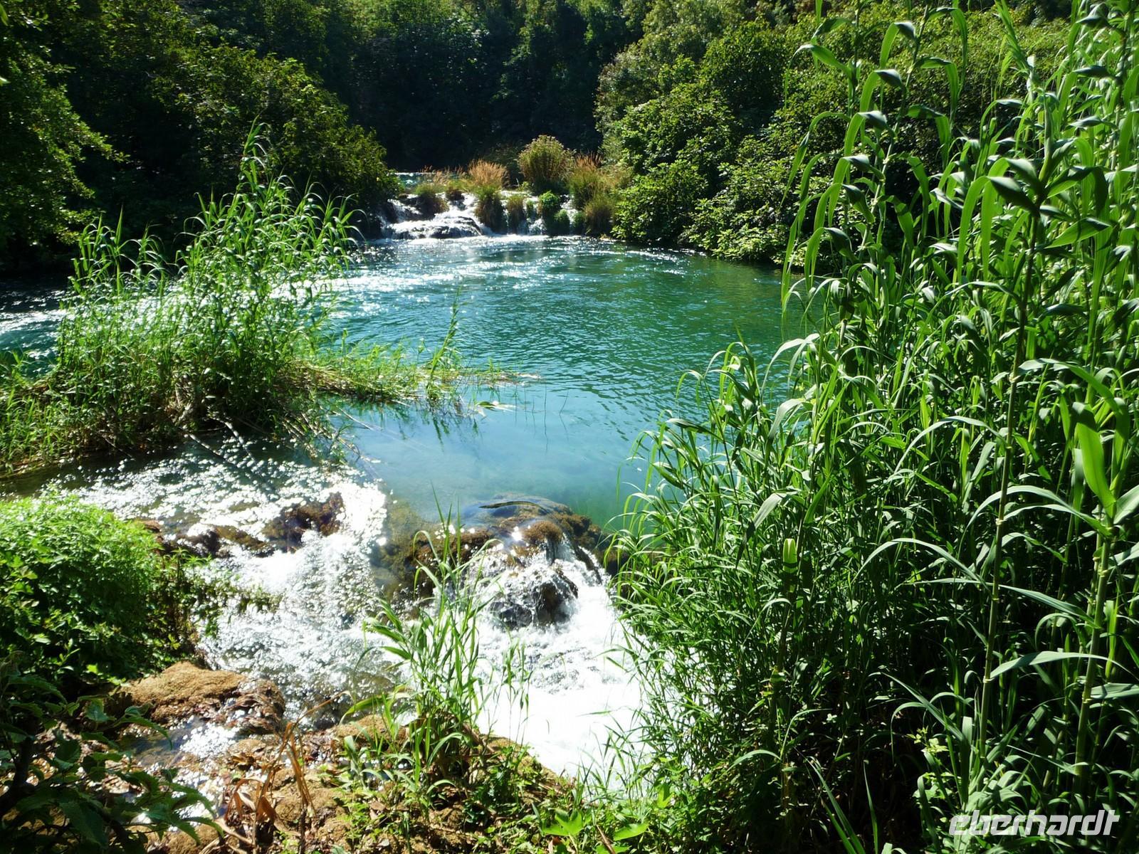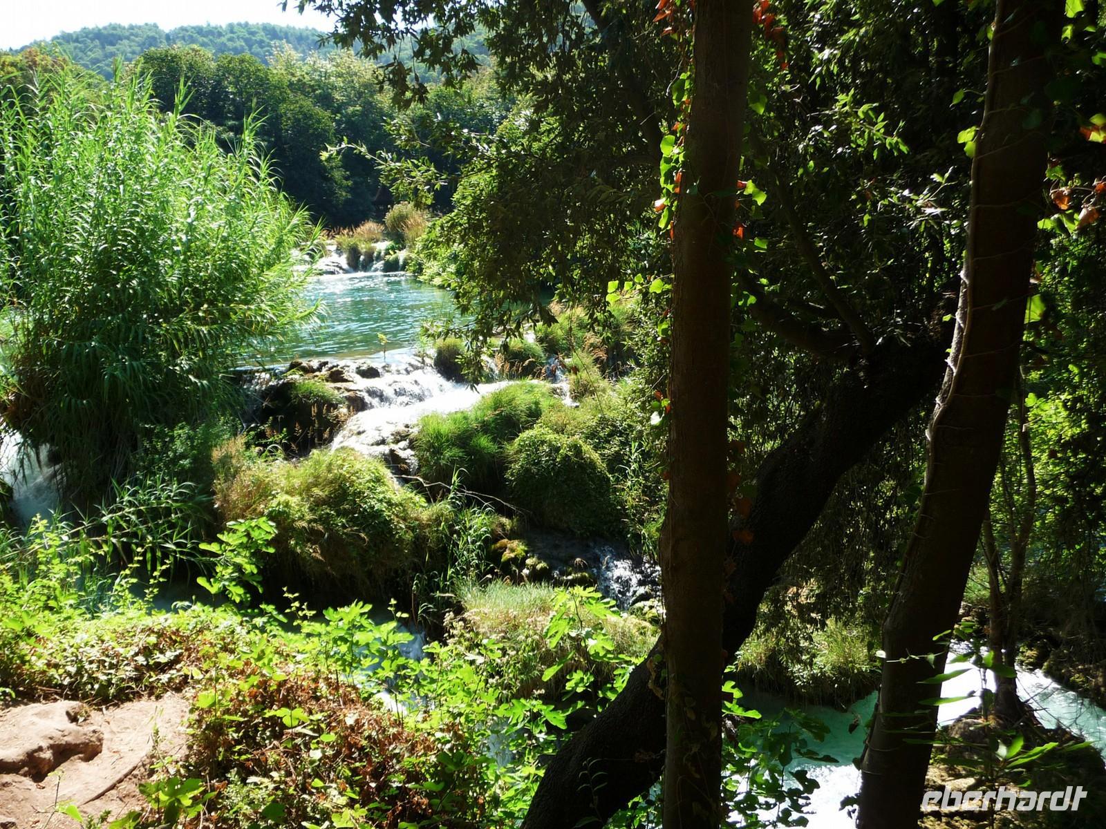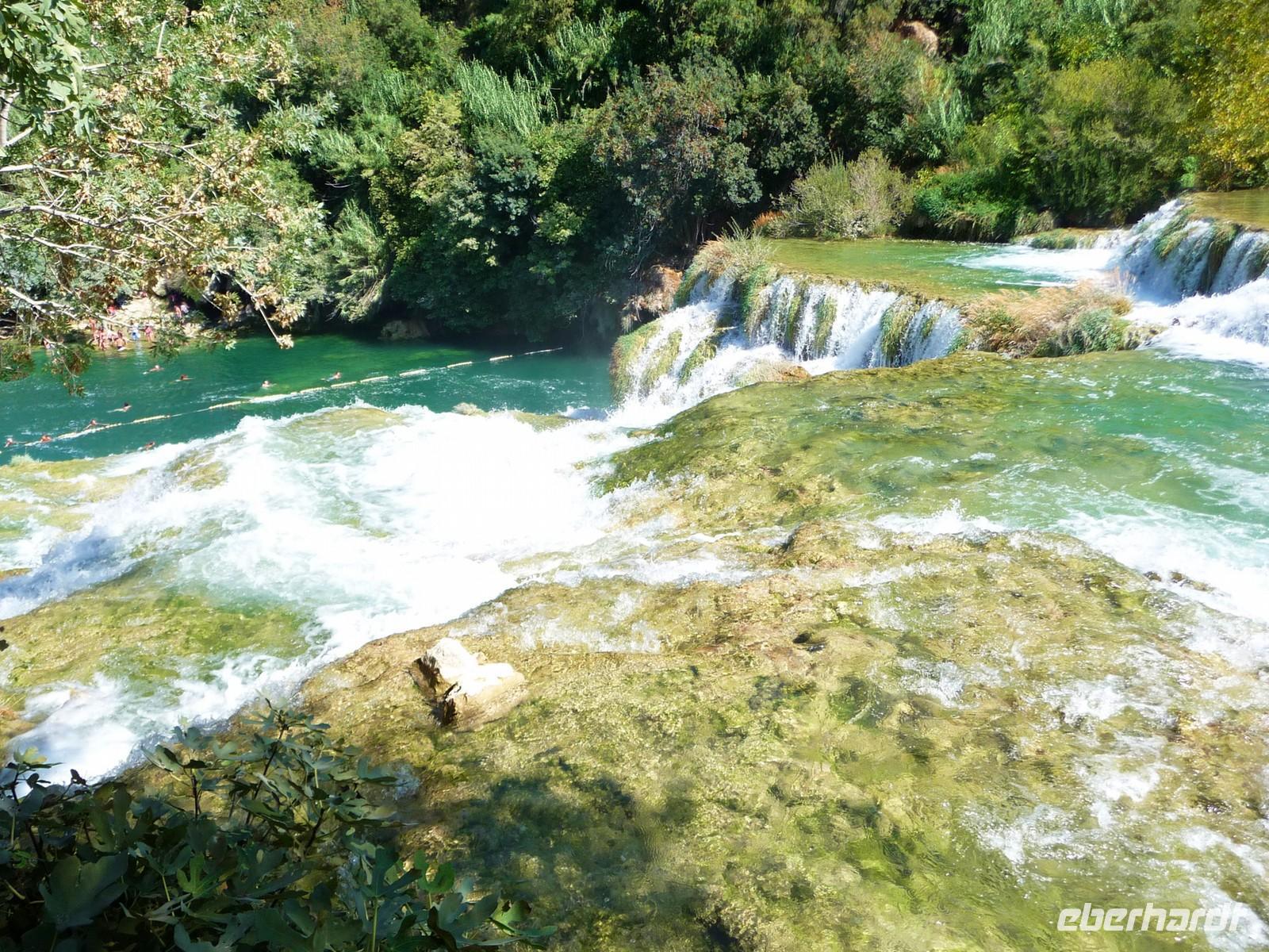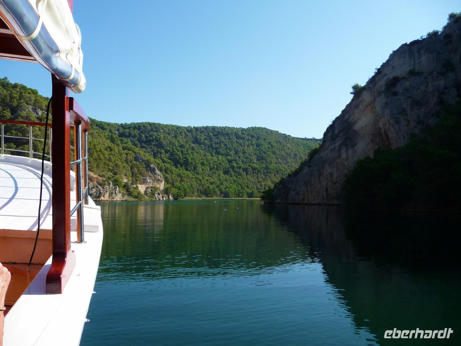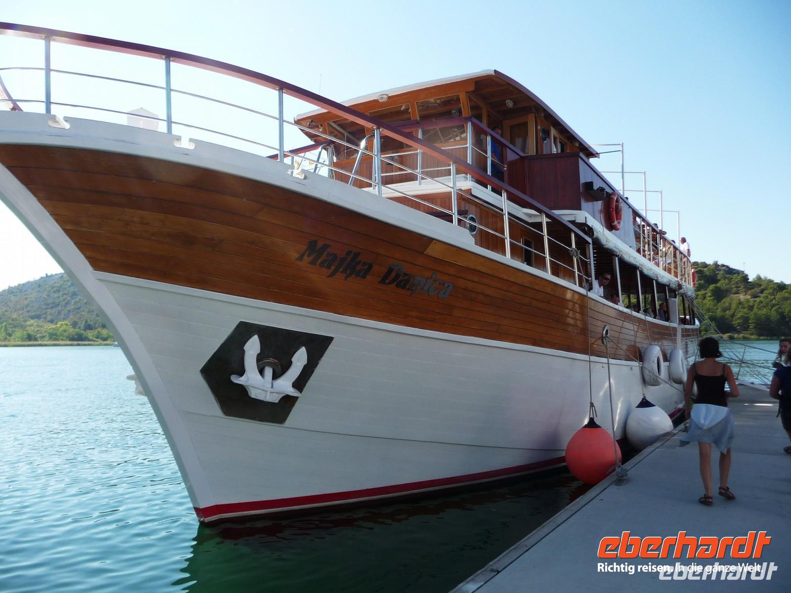 10 Uhr Ablegen und Fahrt die Krka hinauf bis zum Schiffsanleger, dahinter Kassenhäuschen - Eintrittskarten und Prospekte für alle Gäste;