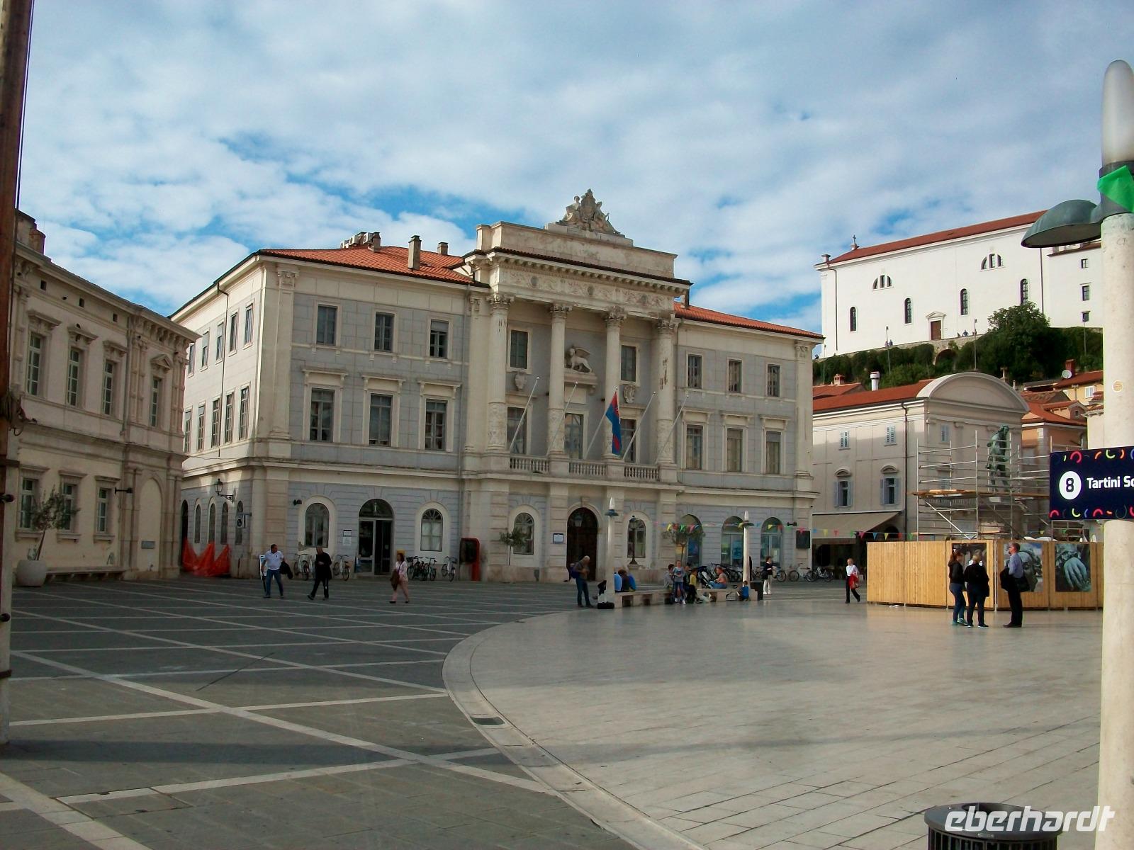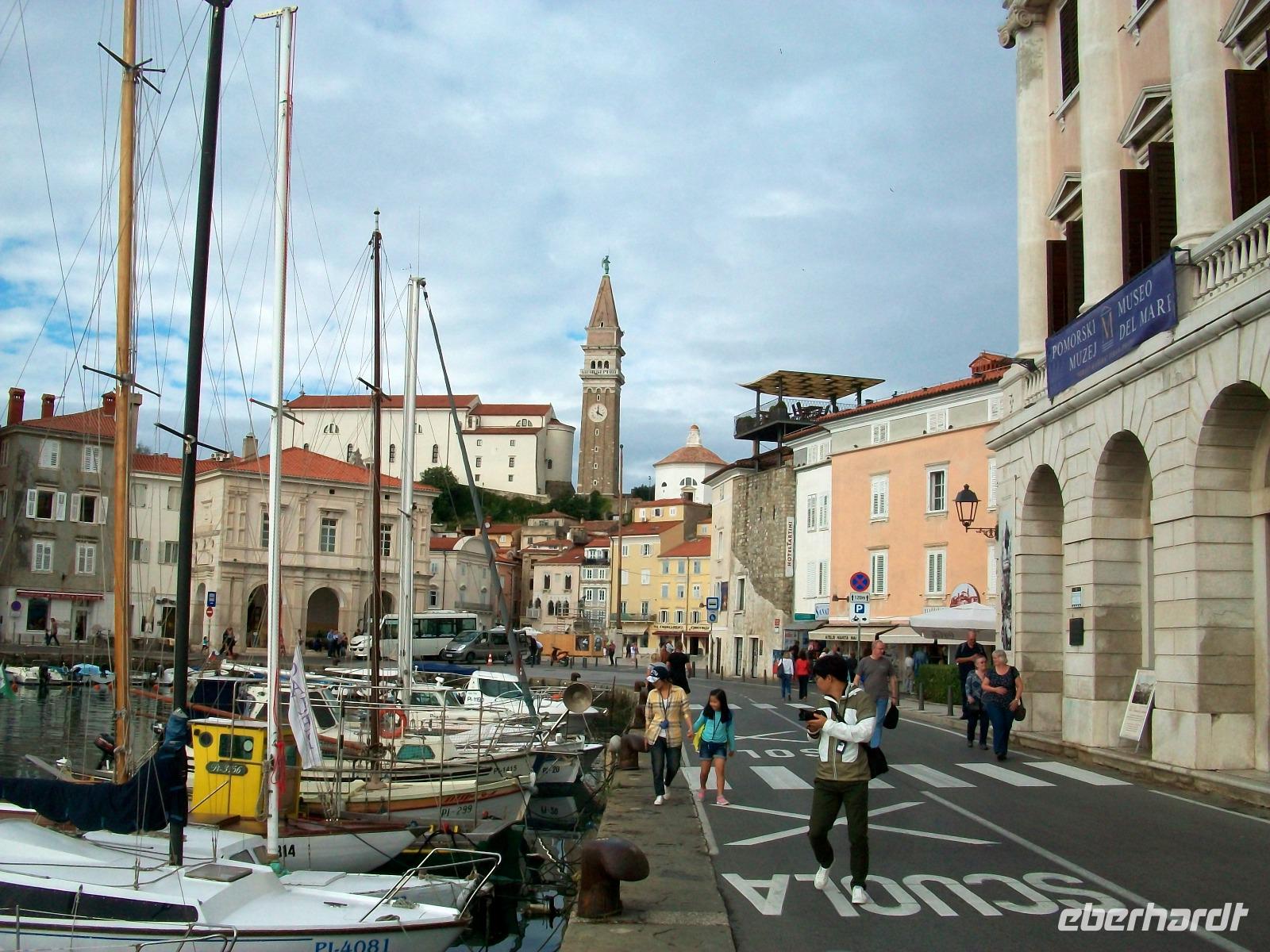 Bald ändert sich das Bild; wir gelangen aus den Bergen herab und nach einem Tunnel sehen wir dann plötzlich die Adria und die Hafenanlagen von Koper. Hier hat sich das Wetter nun endgültig zum Guten gewandelt; wir gelangen durch eine üppige Vegetation direkt zu einer der schönsten Ecken der Halbinsel Istrien. Die Straße senkt sich ab auf das Meeresniveau und bald kommen die uralten Häuser von Piran in Sicht. Das ist nun das Kontrastprogramm zum Vormittag im Gebirge; entlang der Promenade erreichen wir das schlagende Herz dieser Stadt den Tartini - Platz. Hier wurde dieser berühmte Geiger geboren und von dem nach ihm benannten Platz steigen die Häuser an, ganz oben befindet sich die Kirche. Von da hat man einen phantastischen Blick auf die kleine Halbinsel auf welcher dicht gedrängt die Häuser bis an das Meer reichen und direkt daran schließt sich die mächtige Wasserfläche der Adria an, einige Schiffe ziehen dort langsam ihre Bahn, ein wirklich romantischer Anblick! Piran hat selbst einen kleinen Hafen, hier sind zahlreiche Segler fest gemacht.