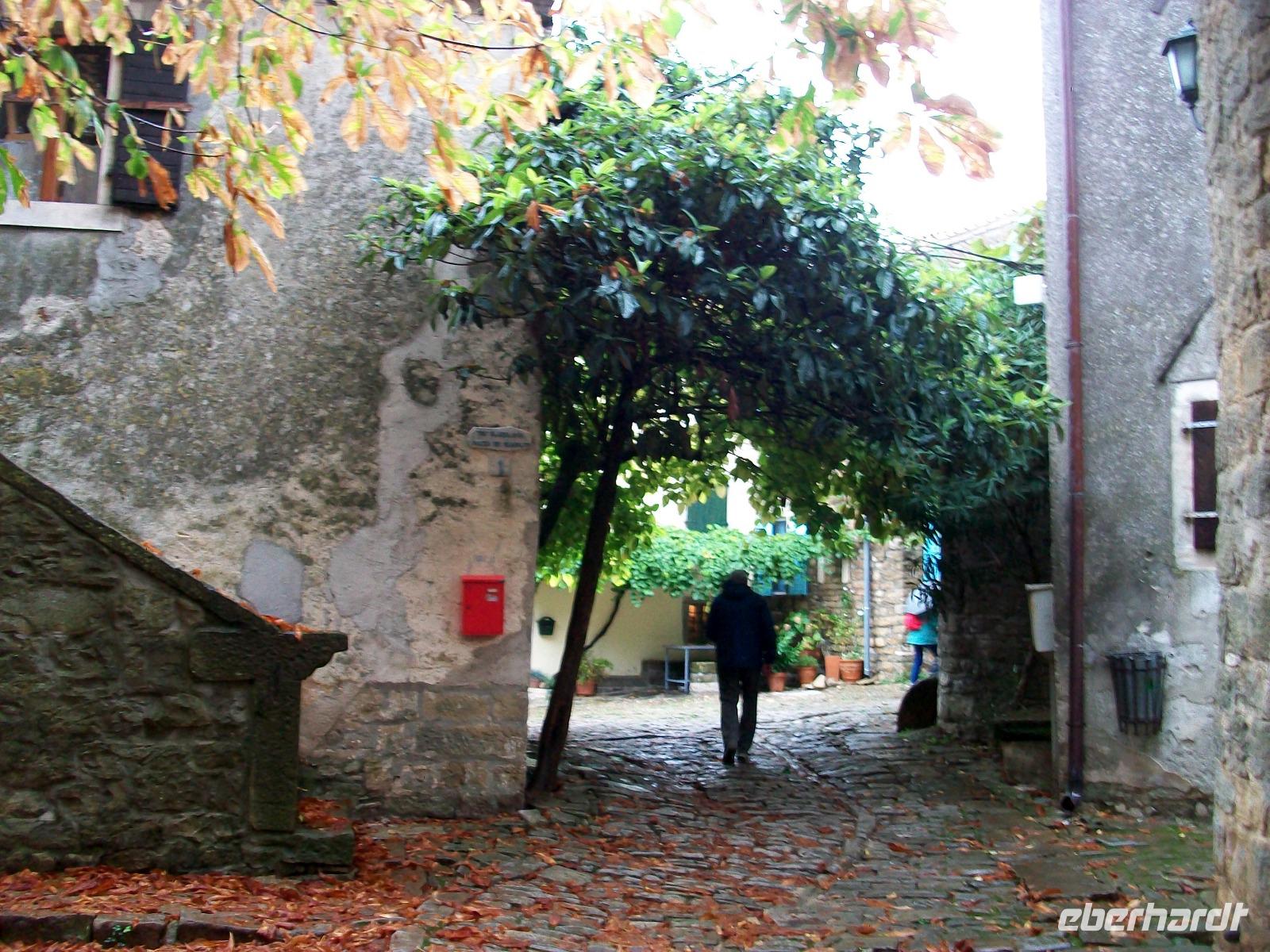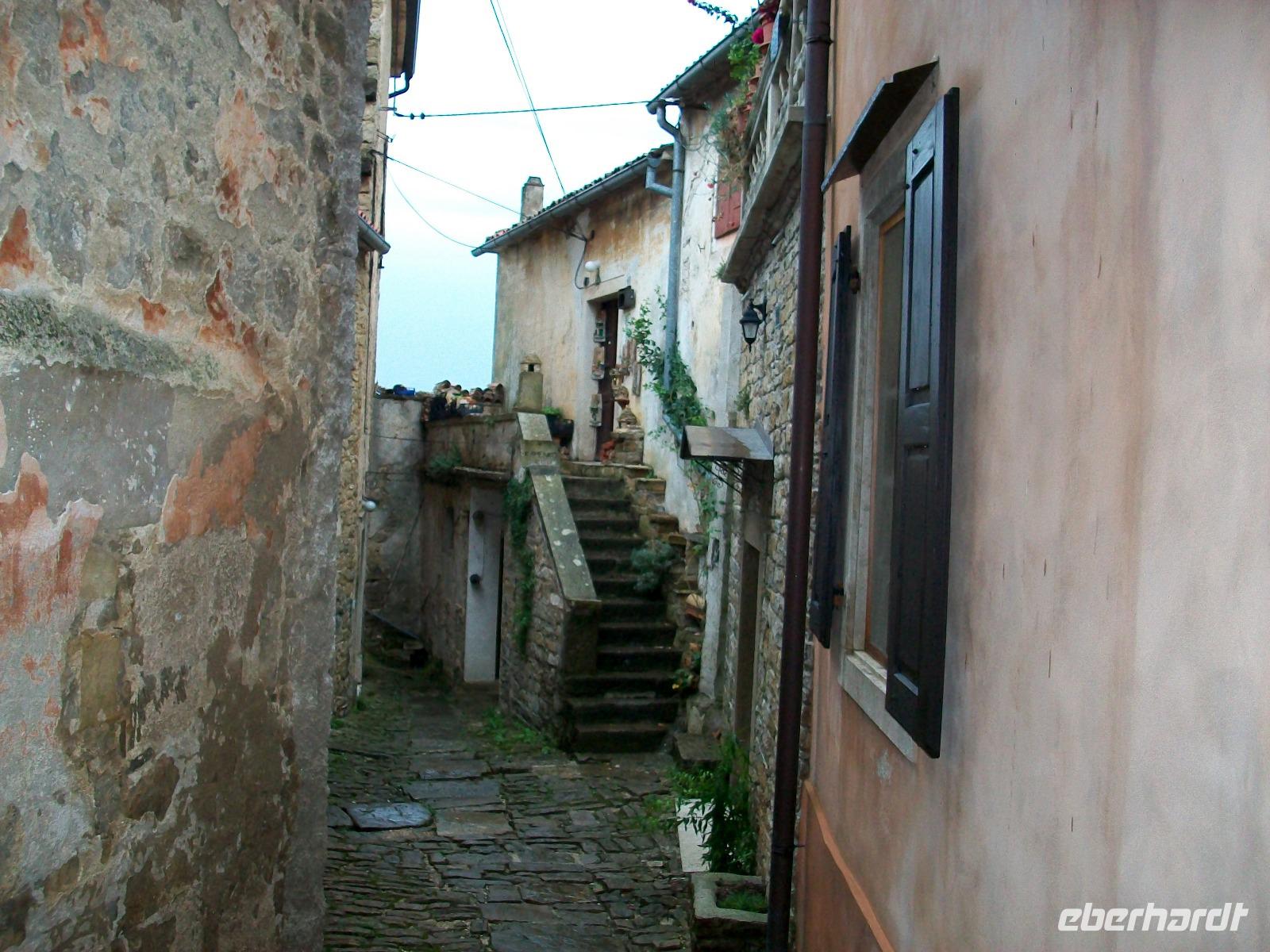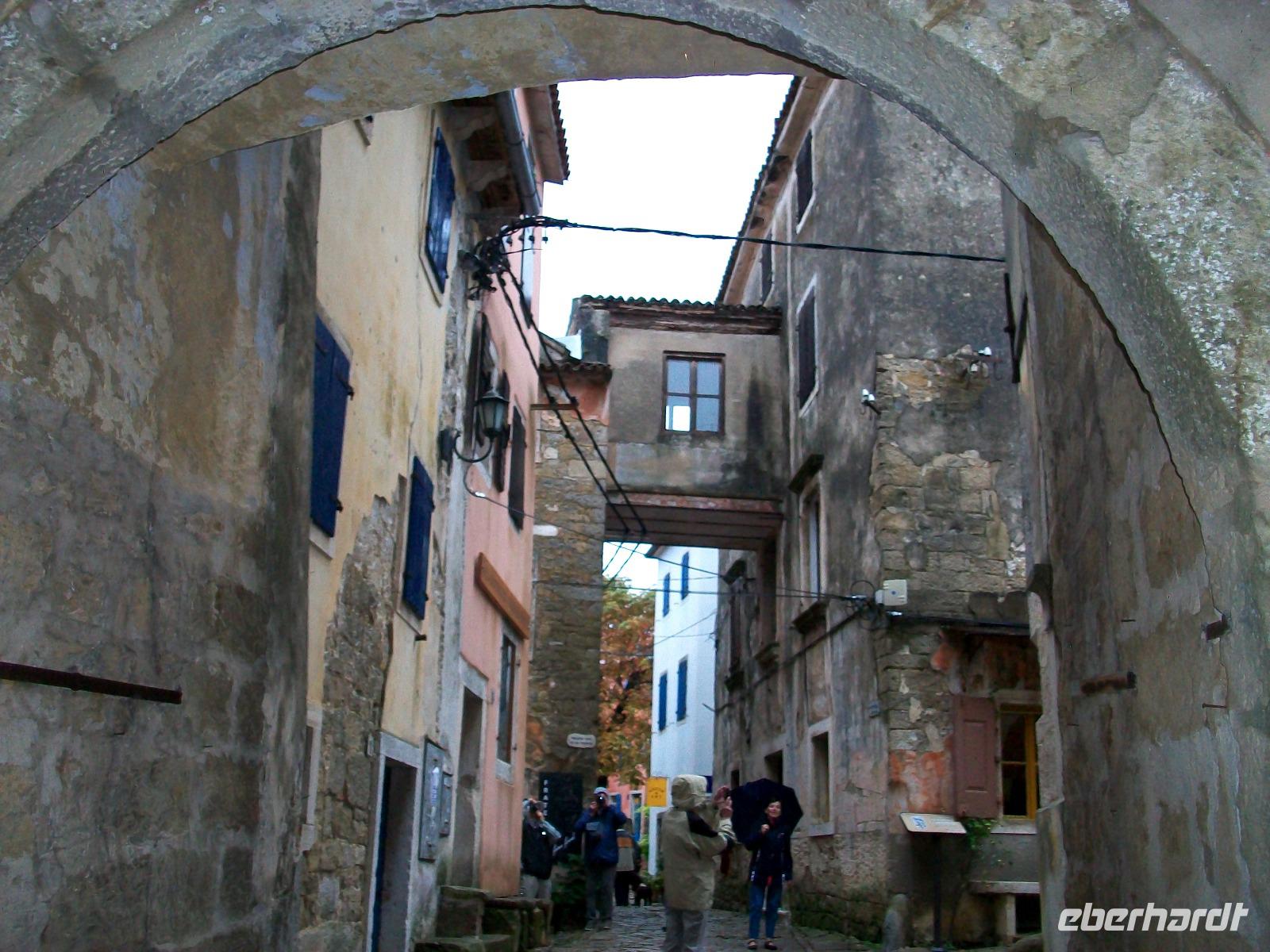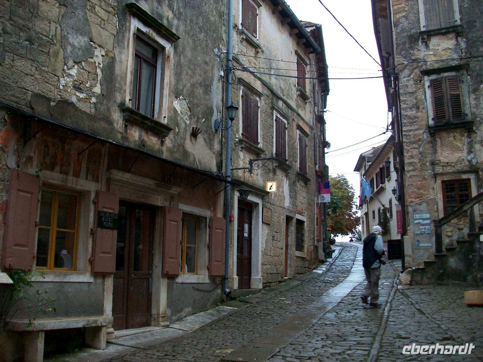 Wir gelangen nach Kroatien und sind fortan im hügeligen Land Istriens unterwegs. Als wir unser erstes Ziel, das Künstlerdorf Grožnjan erreichen, regnet es leicht; wir lassen uns davon aber nicht entmutigen und bummeln durch dieses wirklich reizvolle Nest mit den zahlreichen Galerien in den romantischen schmalen Gassen.