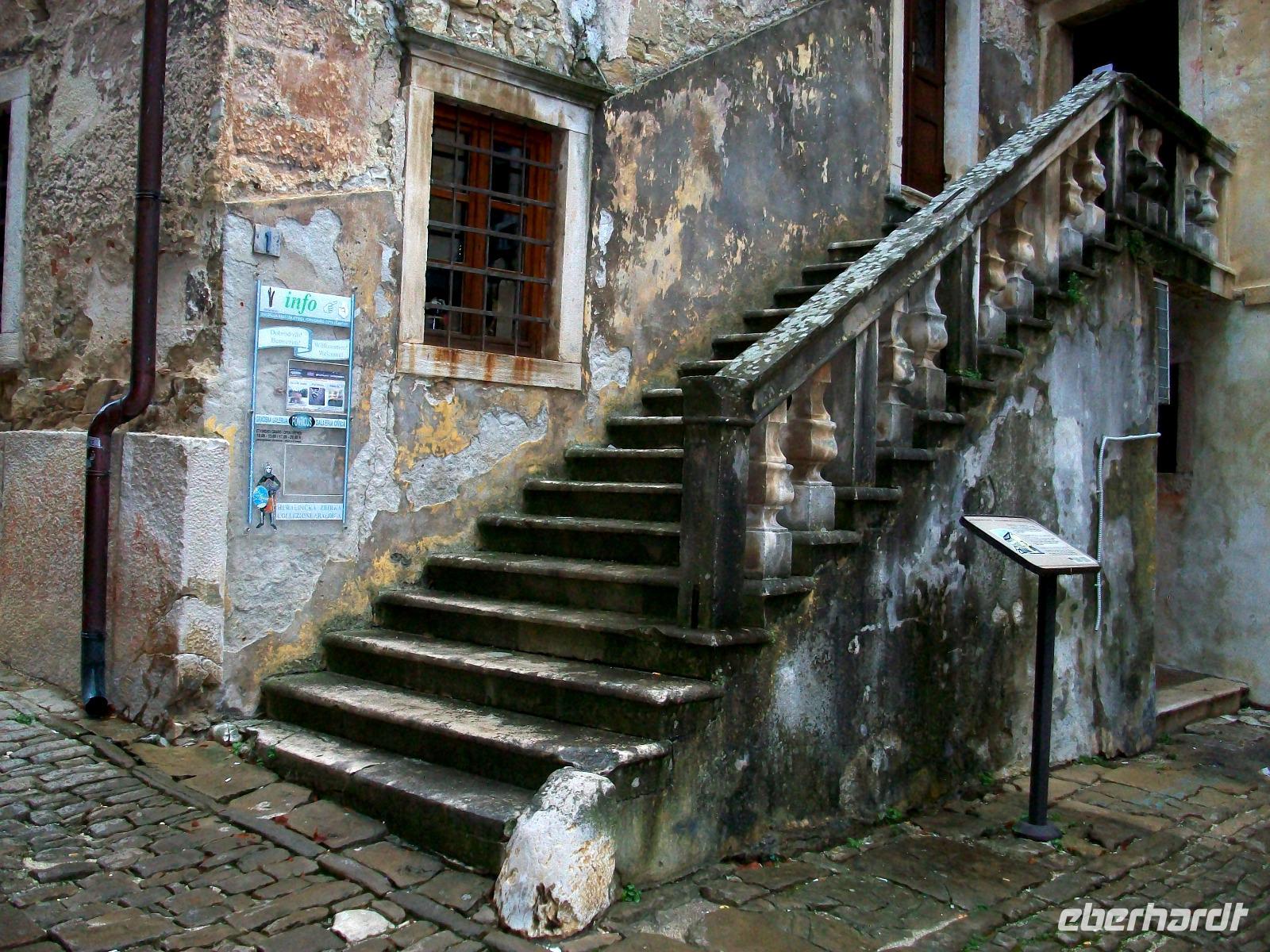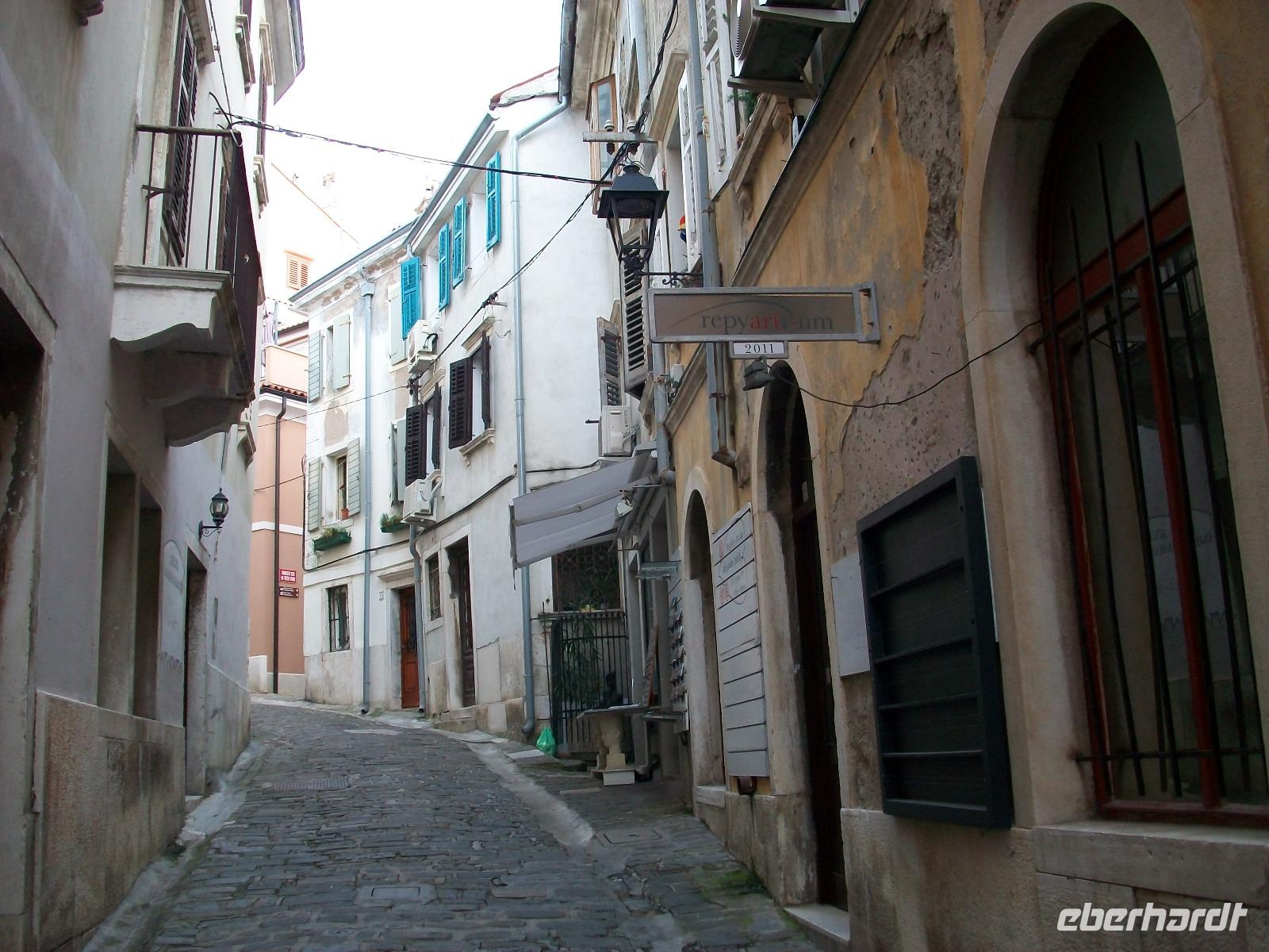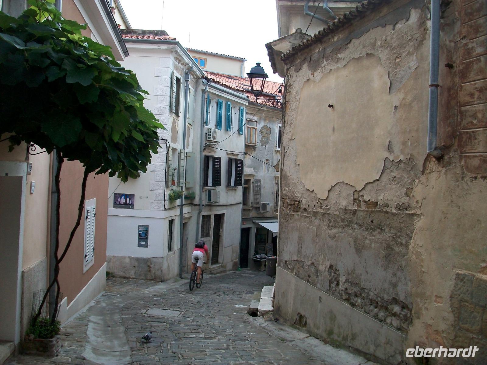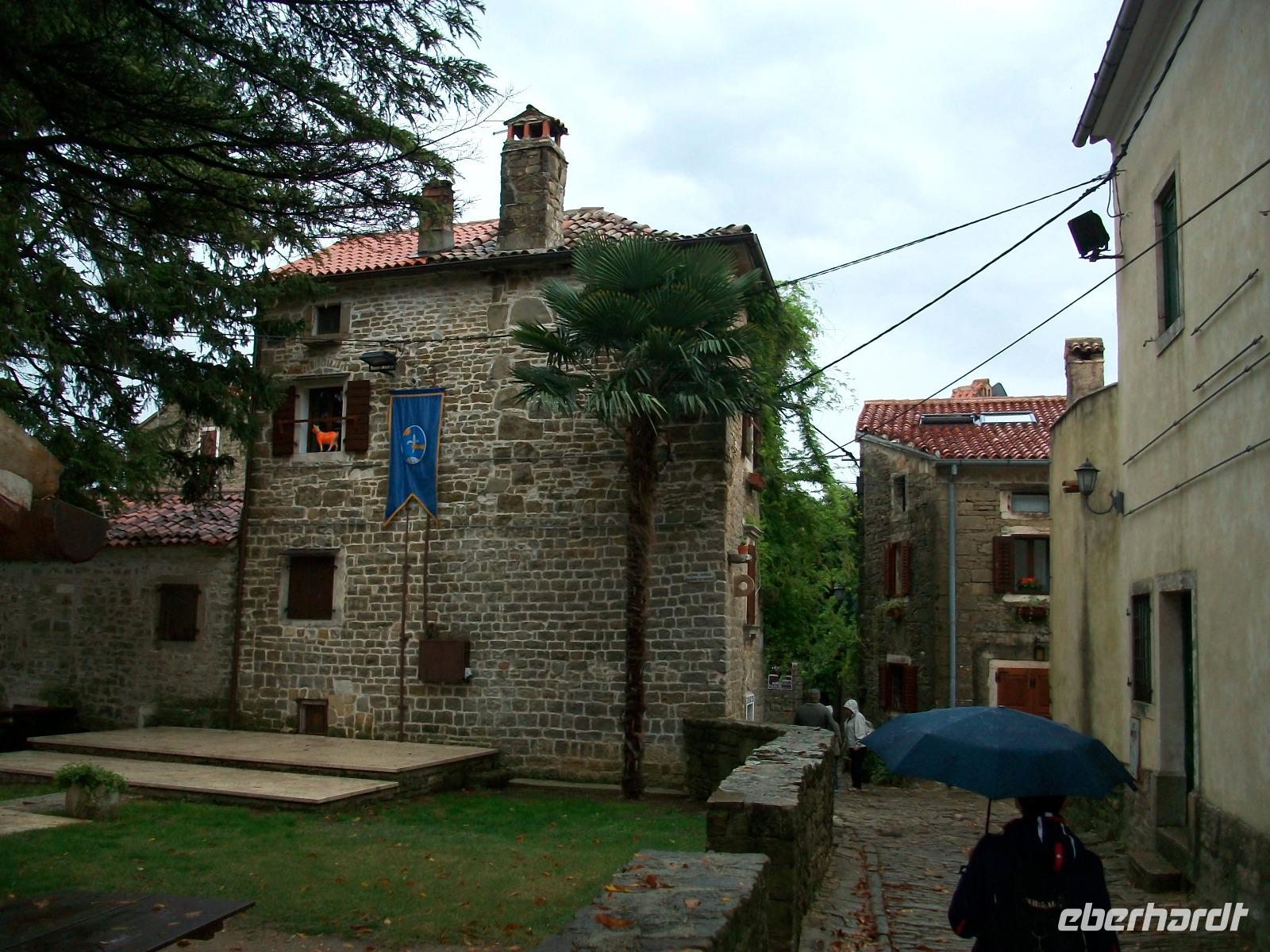 Wir gelangen nach Kroatien und sind fortan im hügeligen Land Istriens unterwegs. Als wir unser erstes Ziel, das Künstlerdorf Grožnjan erreichen, regnet es leicht; wir lassen uns davon aber nicht entmutigen und bummeln durch dieses wirklich reizvolle Nest mit den zahlreichen Galerien in den romantischen schmalen Gassen.