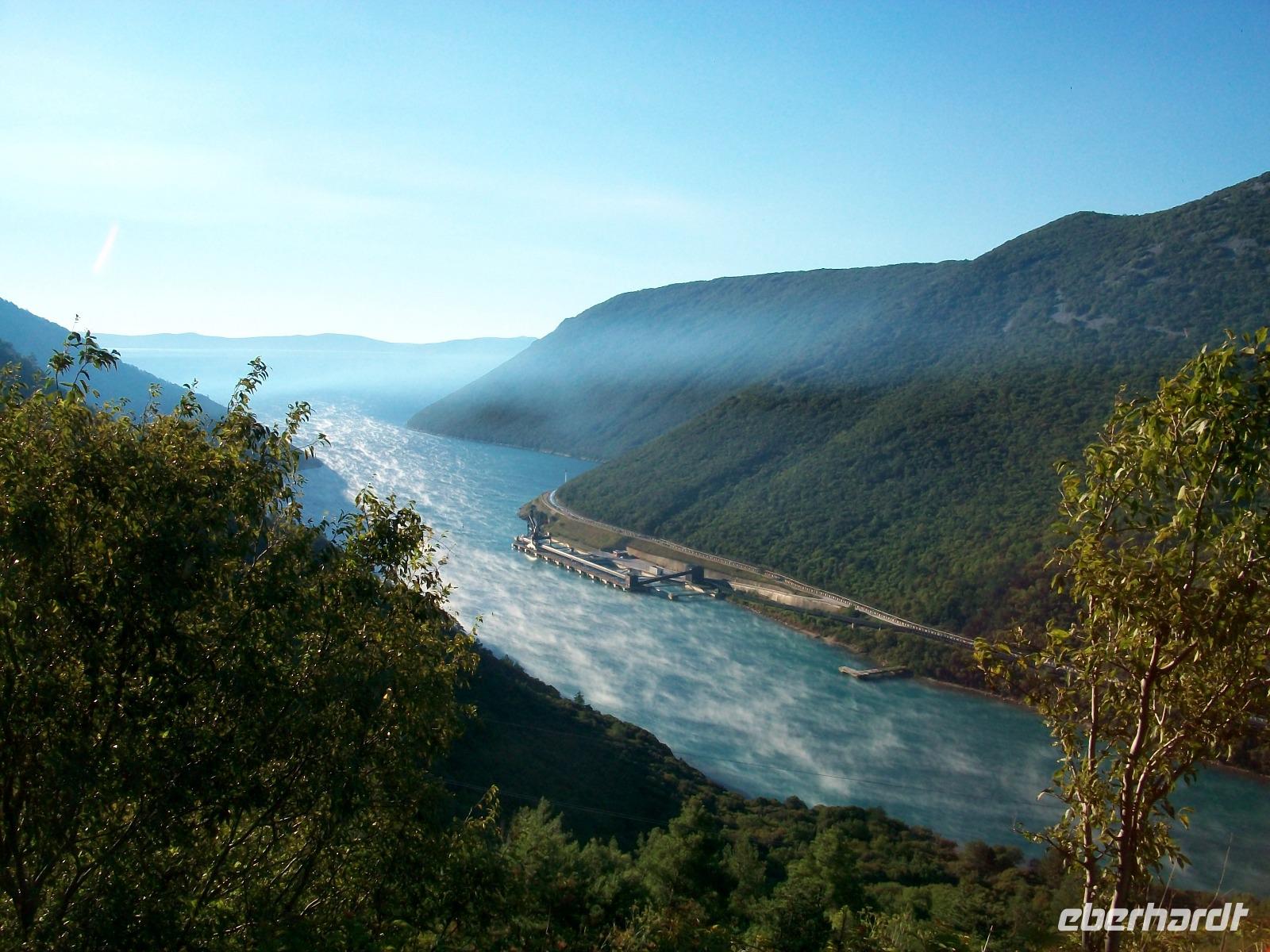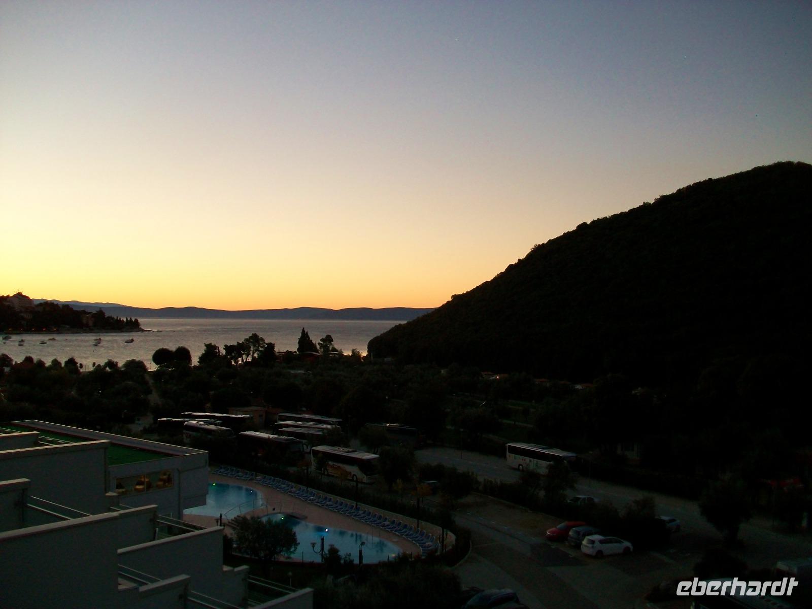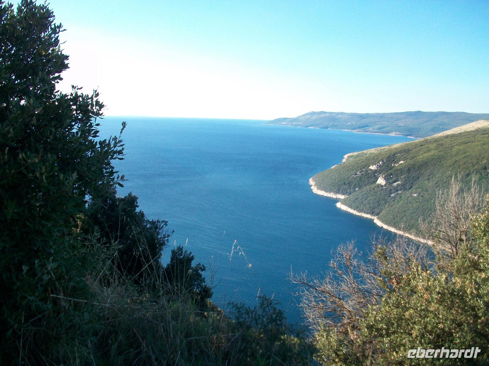 4.10.2016. Strahlender Sonnenschein begleitet uns am frühen Vormittag. Als wir uns aufmachen ist die Luft klar und wir freuen uns auf das schöne Tagesprogramm welches vor uns liegt. Zunächst führt uns die Straße hinauf in die istrischen Berge; tief unter uns ist der Plomin - Kanal zu sehen über dem sich kleine Dunstwolken gebildet haben, ein reizvoller Anblick. Dann führt uns der Weg immer entlang der Küste; wir durchfahren den Ort Lovran, sehen von oben den berühmten Kurort Opatija und schwenken hinter Rijeka ein auf die Jadranska Magistrala, die Uferstraße an der Adria.