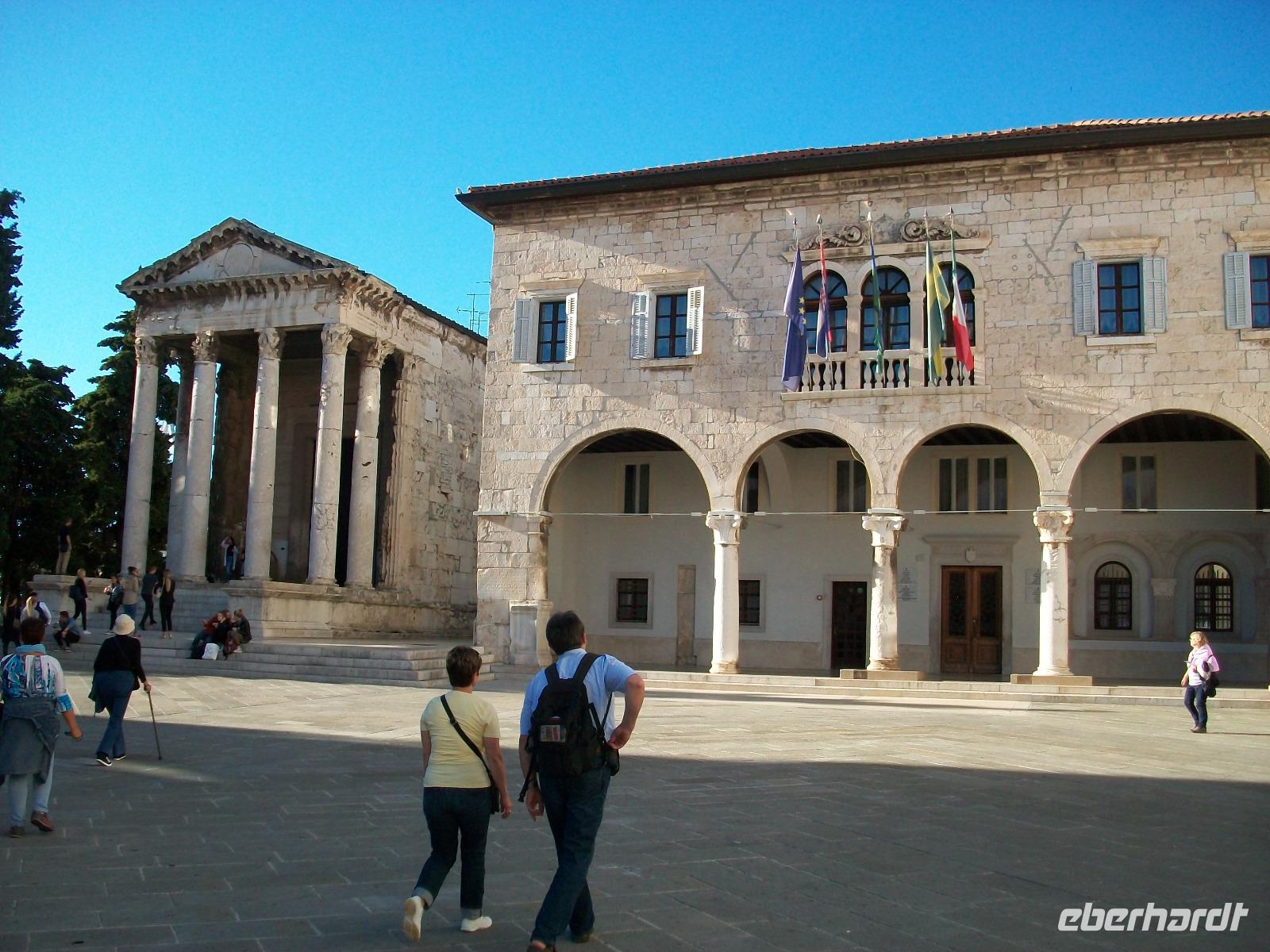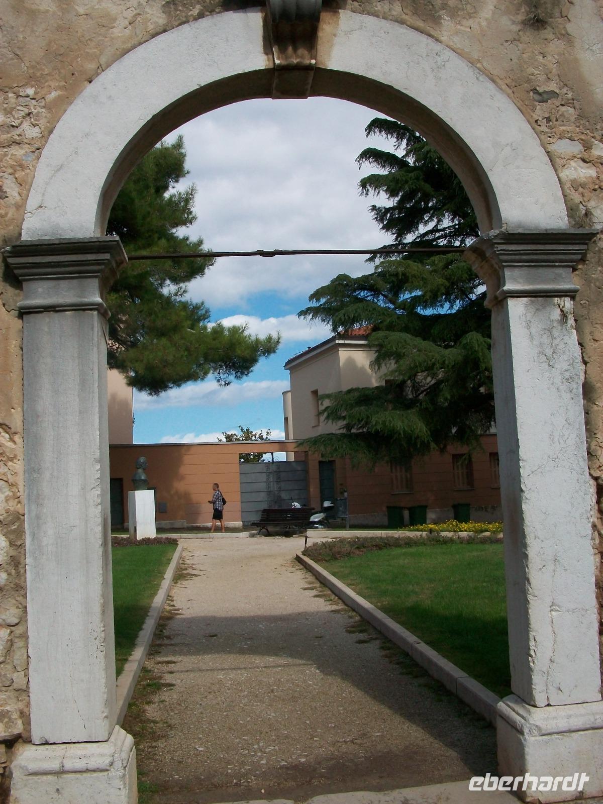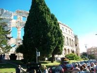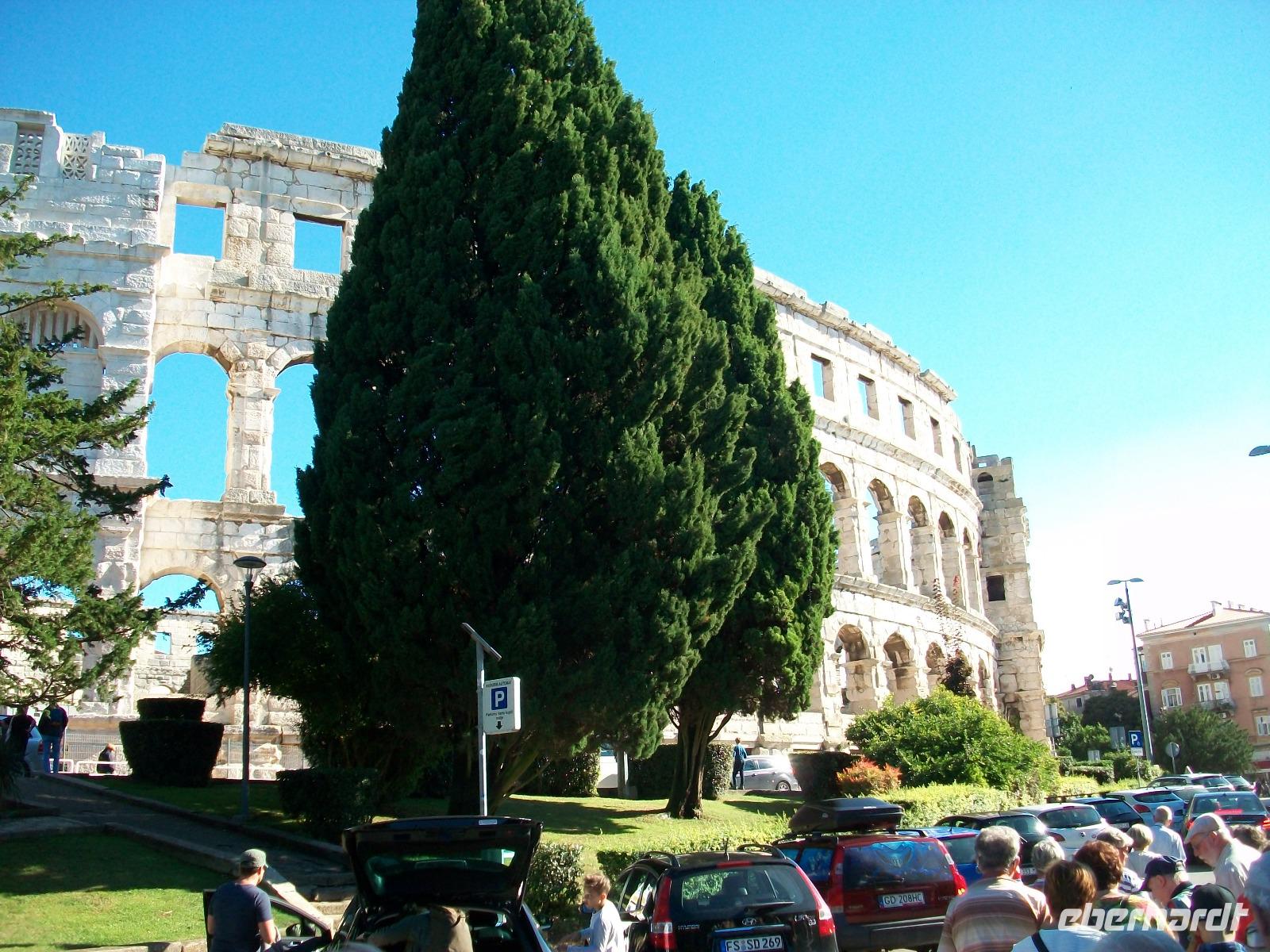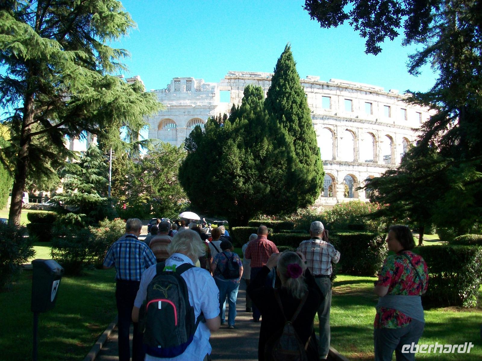 Dann geht die Fahrt weiter unserem für heute letzten Besichtigungsziel entgegen. Es ist die Stadt Pula; hier haben uns die Römer einen besonderen Schatz hinterlassen, die Arena, also ein ehemaliges Amphitheater. Mit unserer Stadtführerin tauchen wir nun ein in diese Historie, wir erfahren so manches Detail der grausamen Spiele dieser Zeit und blicken dabei in das Innere der Arena. Dann machen wir einen Bummel durch den Ort, erleben hier das quirlige Leben dieser Hafenstadt und sehen dabei so manches Relikt aus römischen Zeiten.