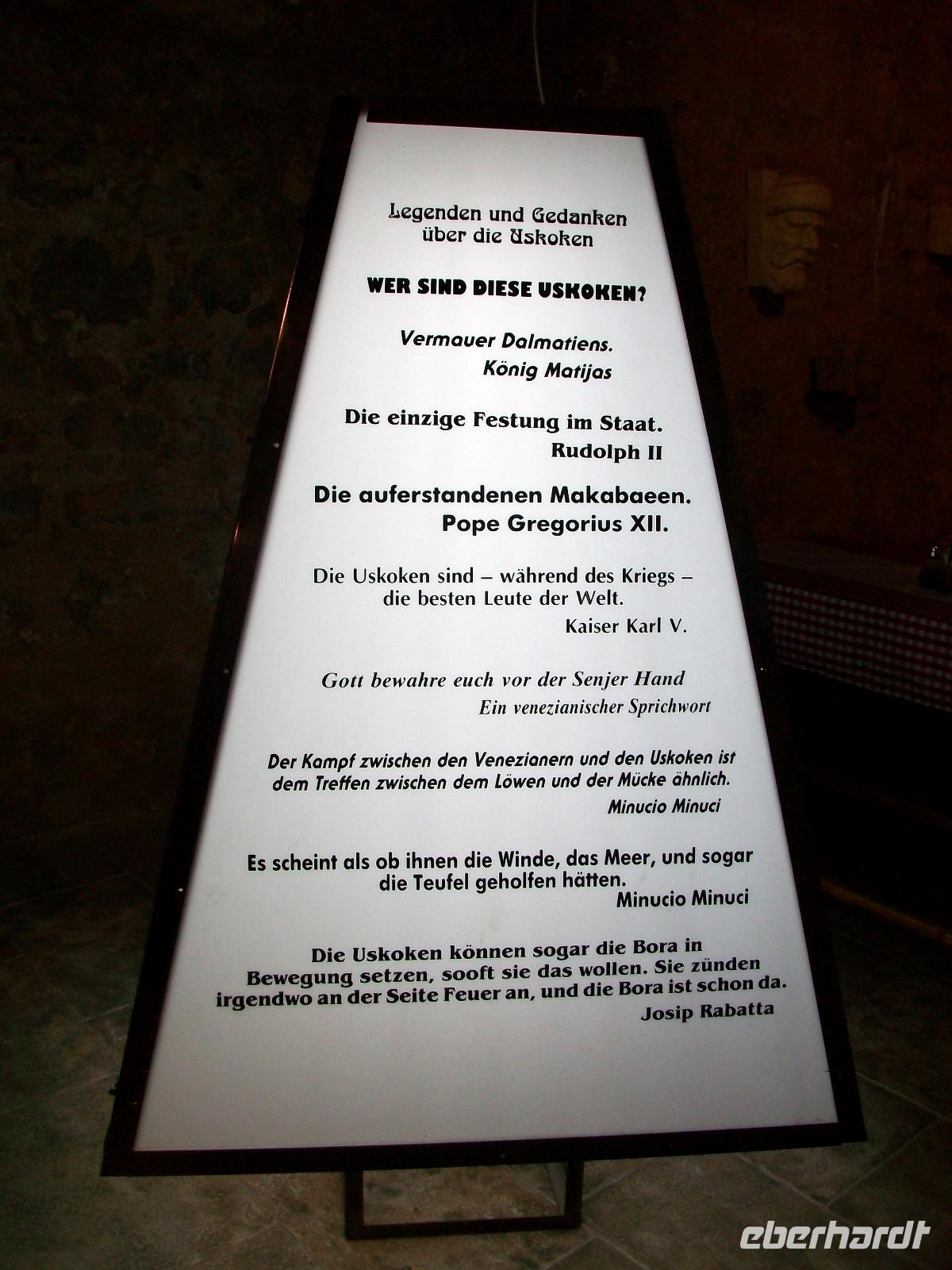 Bald taucht vor unseren Augen die Festung Nehaj auf, hier führten einst die Uskoken ihr Piratenleben, darüber wollen wir nun doch etwas mehr wissen. Unser Führer erwartet uns, schon und bald sind wir im Inneren dieser quadratischen Festung verschwunden, hier erfahren wir so manches Detail über das Leben und Treiben dieser Zeit.