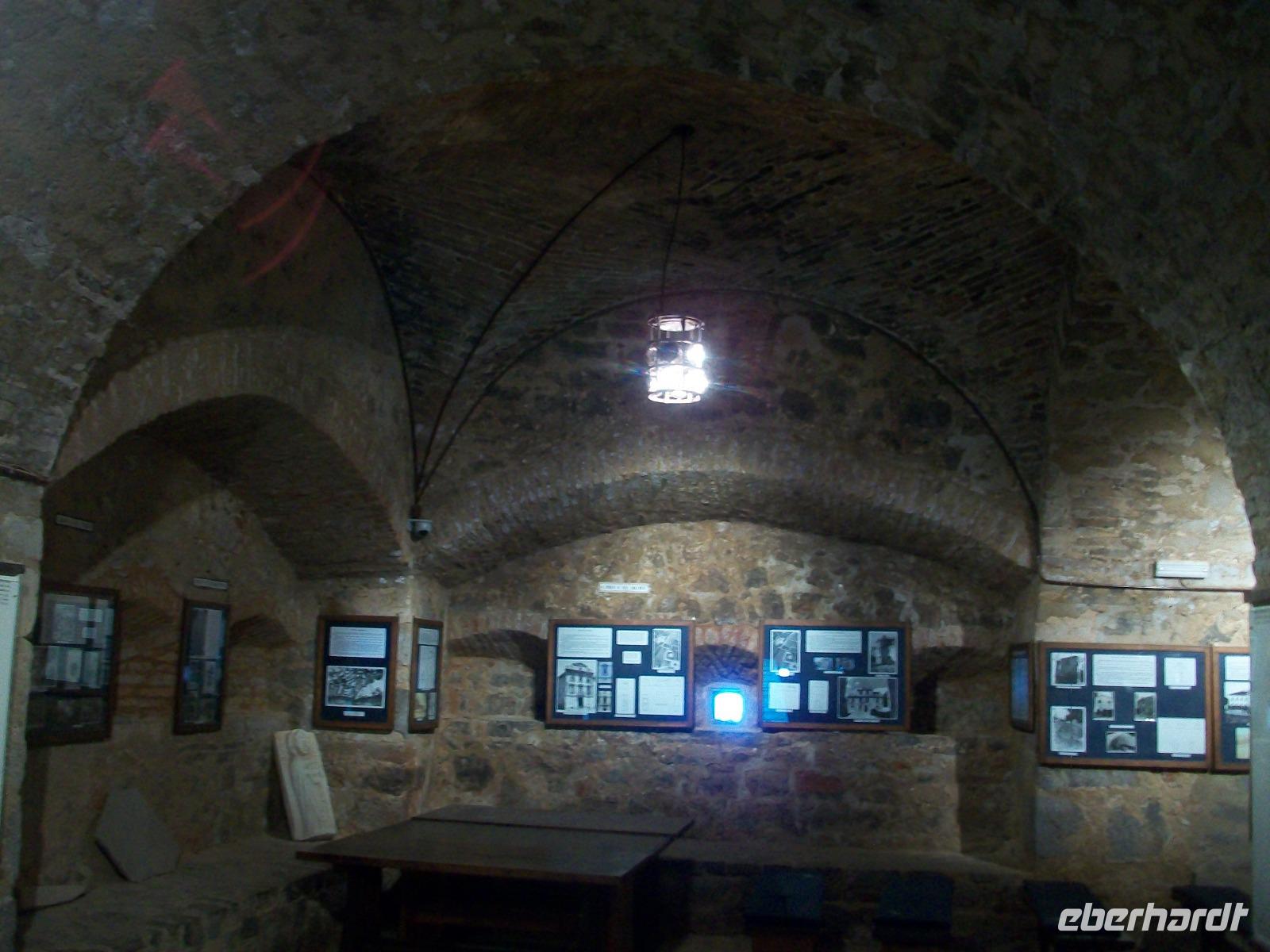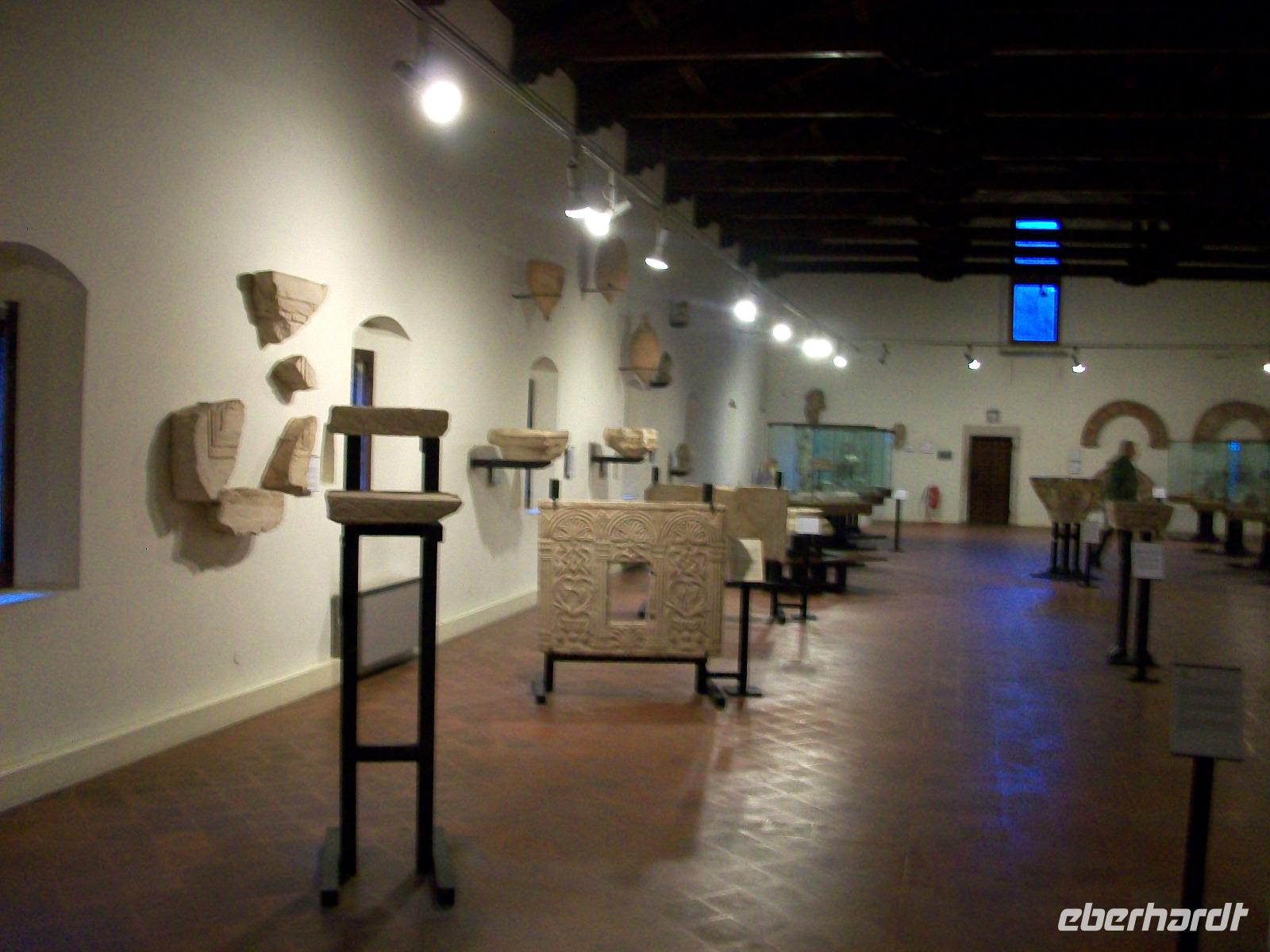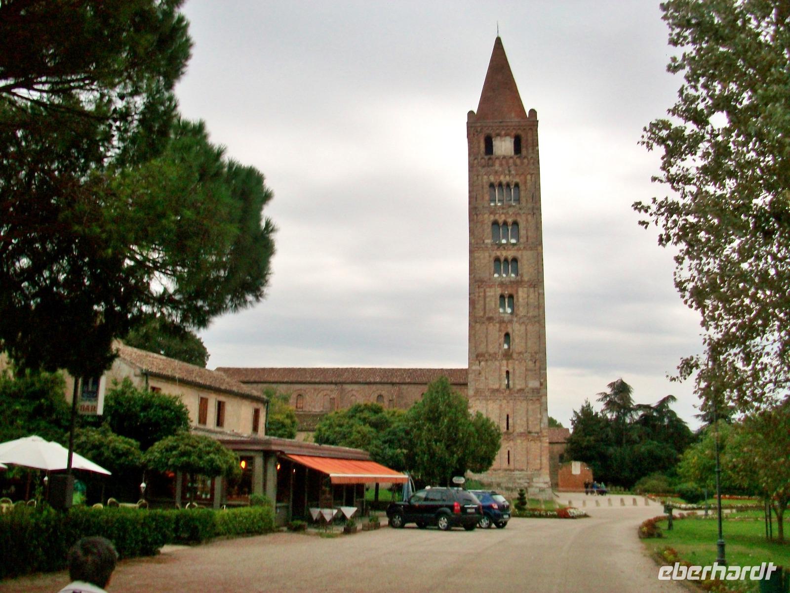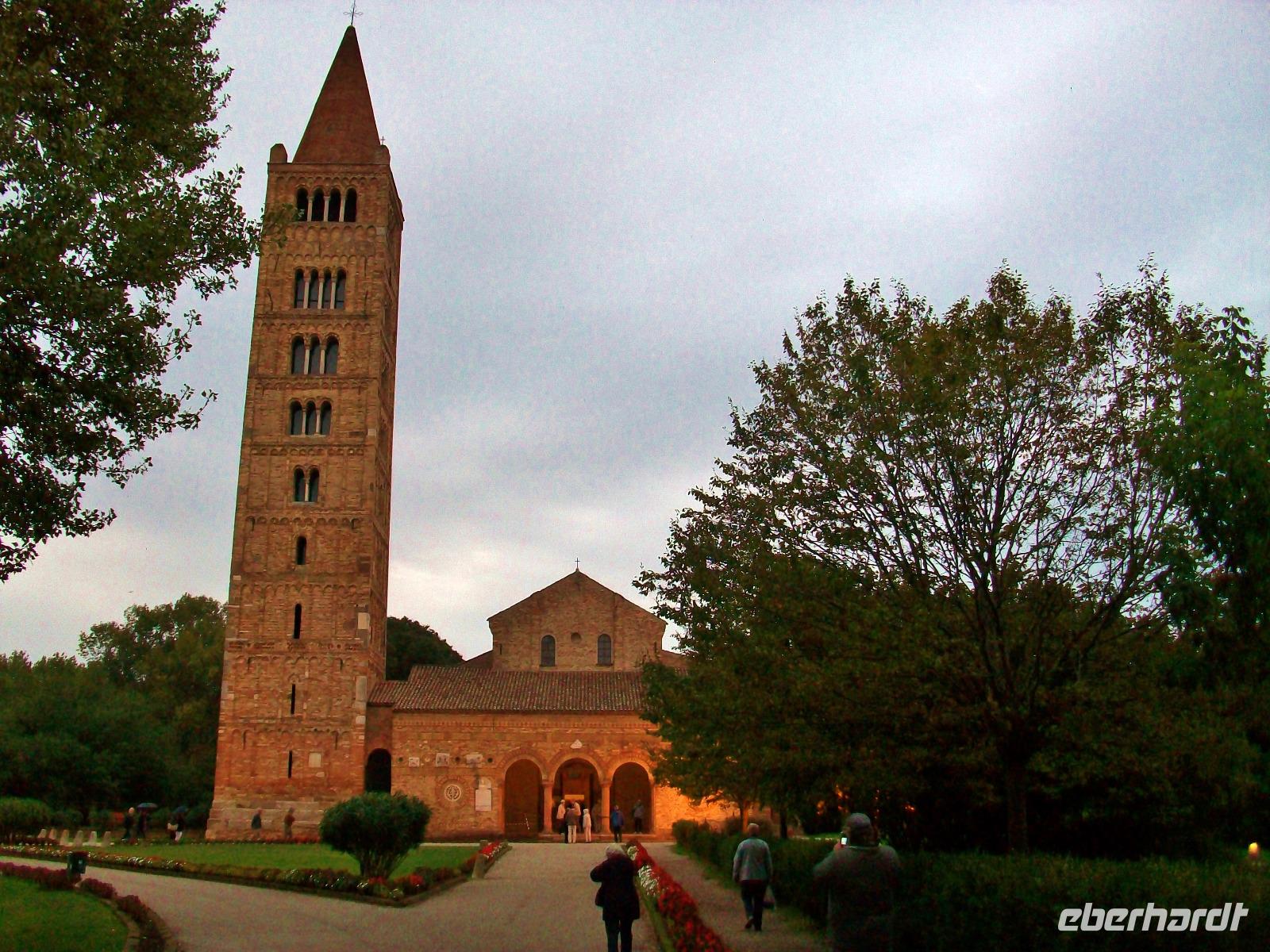 Noch ein letzter Höhepunkt steht am heutigen Tag an; weiter oben im Norden erwartet uns die bekannte Abtei Pomposa zu einem Besuch. Als wir gegen halb sechs hier anlangen ist es schon etwas dunkel geworden, aber den Besuch dieses Klosters stört das nicht. Am Kreuzgang vorbei gelangen wir in das Innere und an den Tafeln können wir ablesen welchen Zweck diese Räume einst hatten. Kurz bevor wir diesen feierlichen Ort verlassen erfreut uns noch ein schönes Glockenspiel vom dezent beleuchteten Kirchturm und damit endet dieser Besuch sehr feierlich.