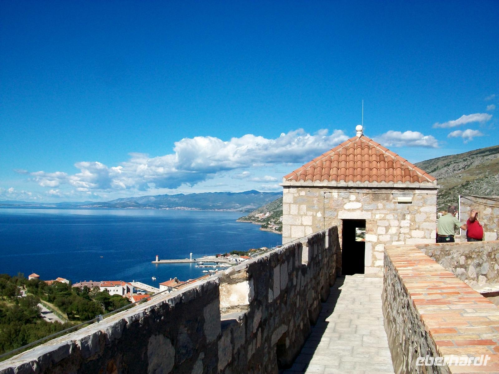 Besonders eindrucksvoll ist der Blick vom Dach der Festung, hier können wir den Blick weit schweifen lassen über die unendliche Wasserfläche der Adria und den Ort Senj der zu unseren Füßen liegt.