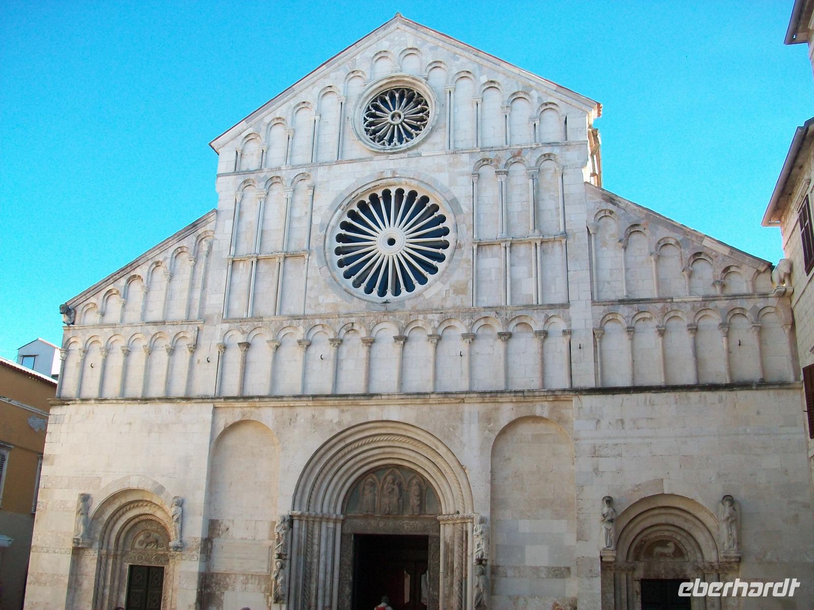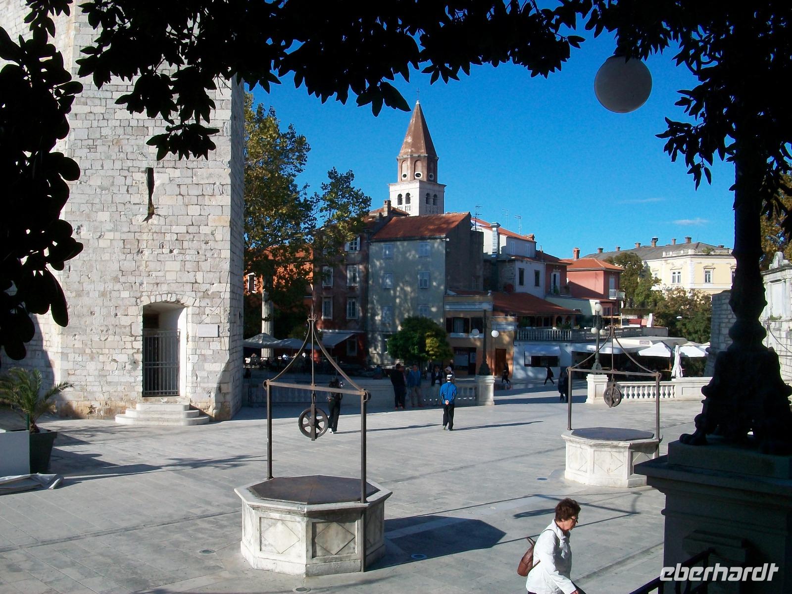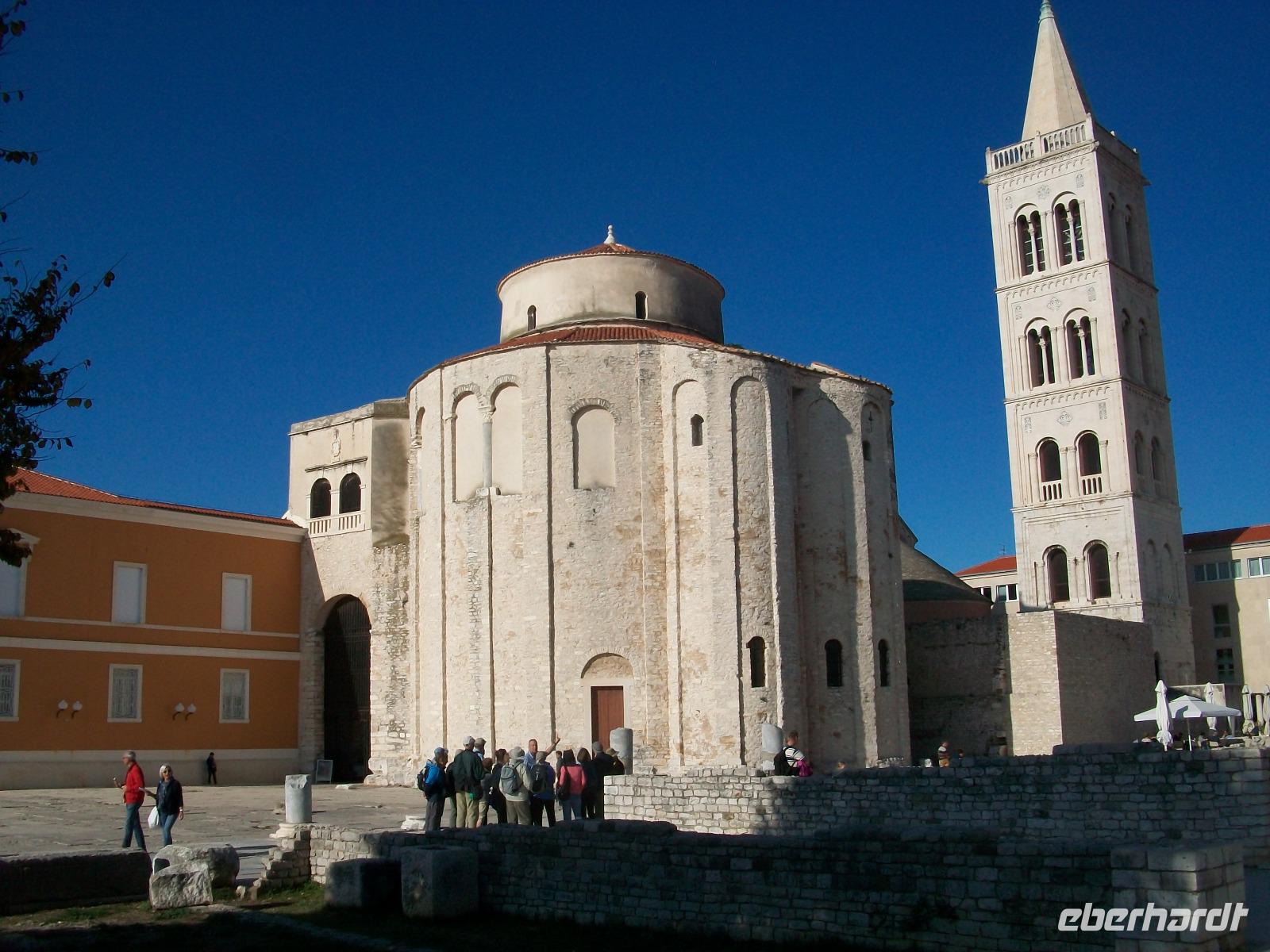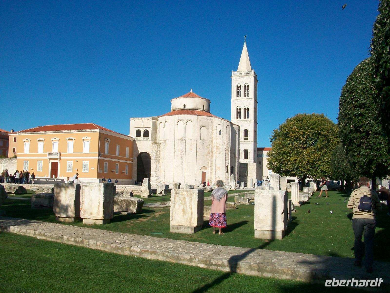 Wir werden weiterhin von der Sonne verwöhnt als wir dann nach Zadar gelangen. Hier werden wir schon von Meri erwartet, sie wird uns nun durch einen der reizvollsten Orte Norddalmatiens führen. Weit reicht auch hier die Geschichte zurück; wir sehen die römischen Überbleibsel des Forum Romanum, die ältesten Zeugnisse der Stadt, dahinter die Rotunde der Donatskirche und gleich daneben die Kathedrale.