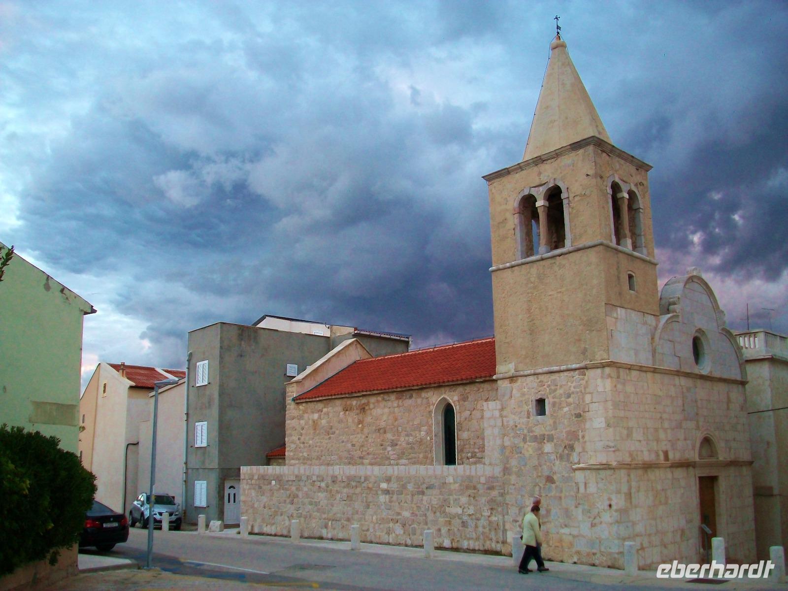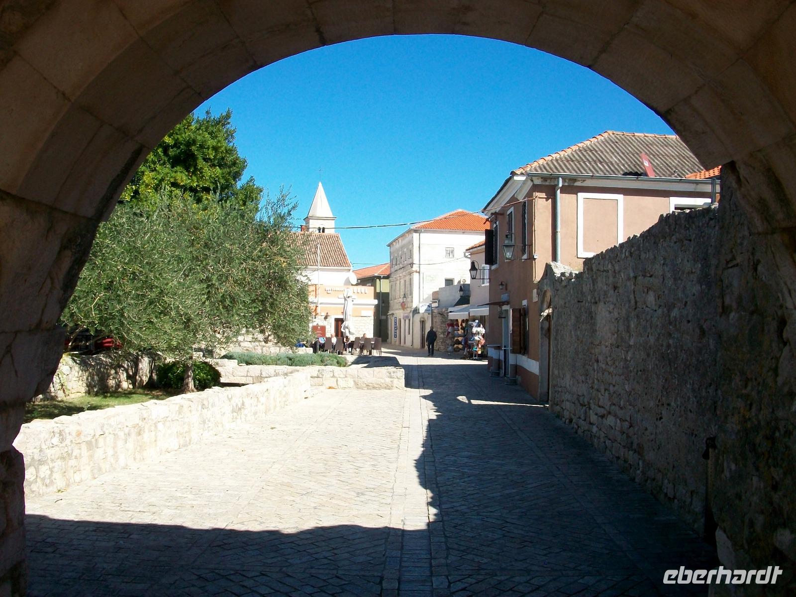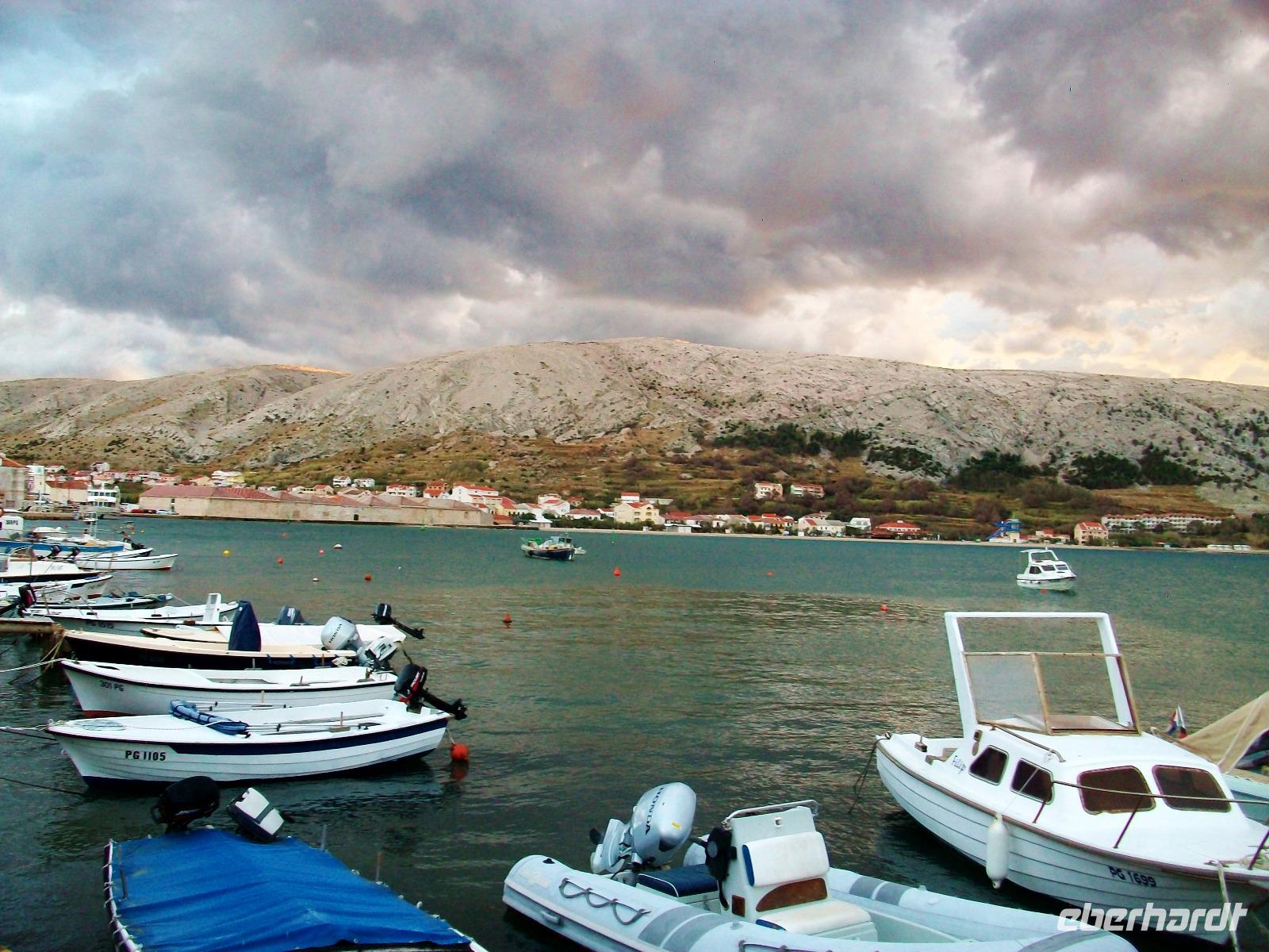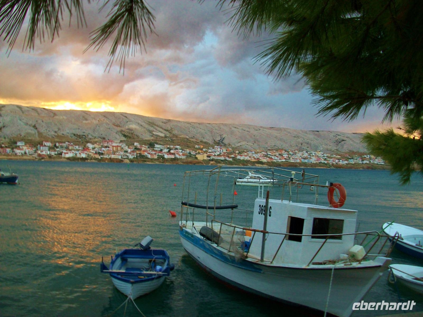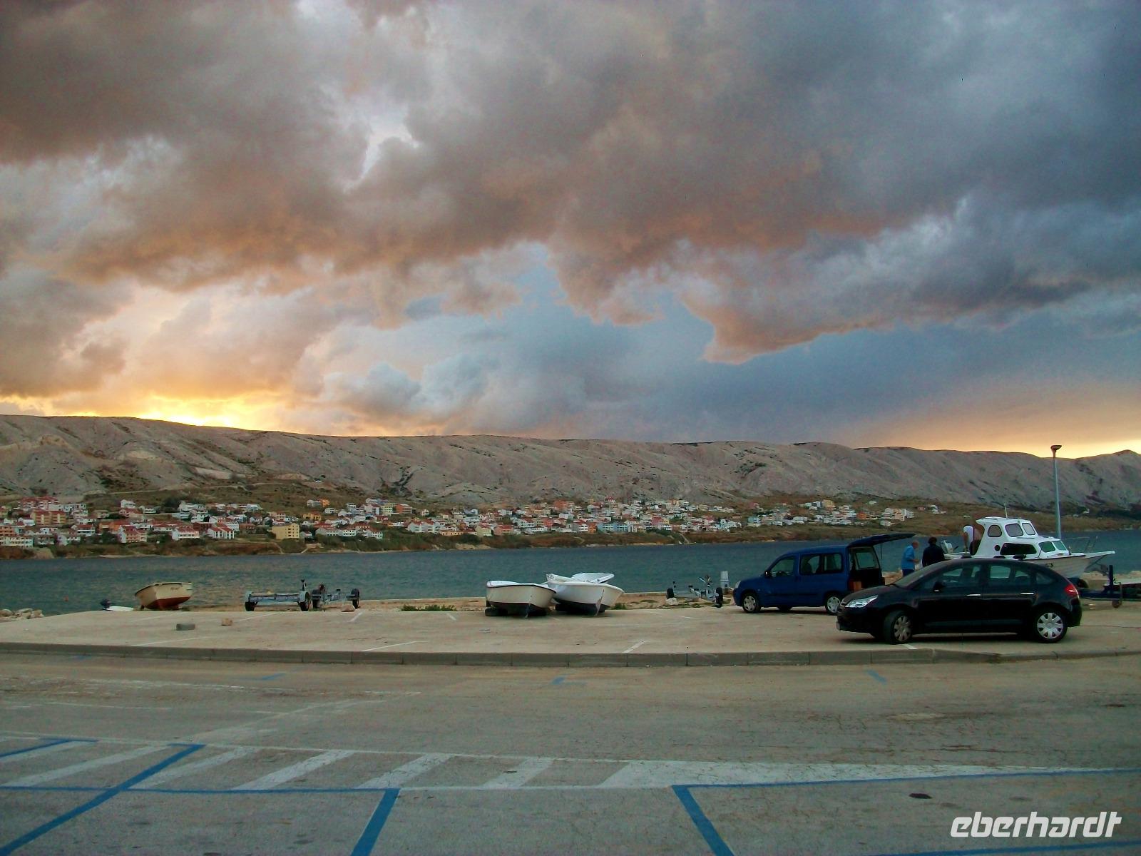 Ein schöner Fußweg führt uns dann hinunter und wir unternehmen auch hier einen kleinen Rundgang mit unserem Stadtführer, genießen an diesem sonnigen Nachmittag noch etwas Freizeit und nehmen dann unsere Fahrt wieder auf um, immer entlang der Küste mit Blick auf die kahlen Inseln, zur Autofähre nach Prizna zu gelangen. Bald können wir mit unserem Bus auffahren, die Fähre legt ab und wir genießen auf dem Oberdeck die schöne Überfahrt zur Insel Pag. Noch eine Fahrt über die Inselstraße und wir gelangen zu unserem Hotel fast im Zentrum des Ortes Pag der nach dem Abendessen noch zu einem Bummel einlädt.