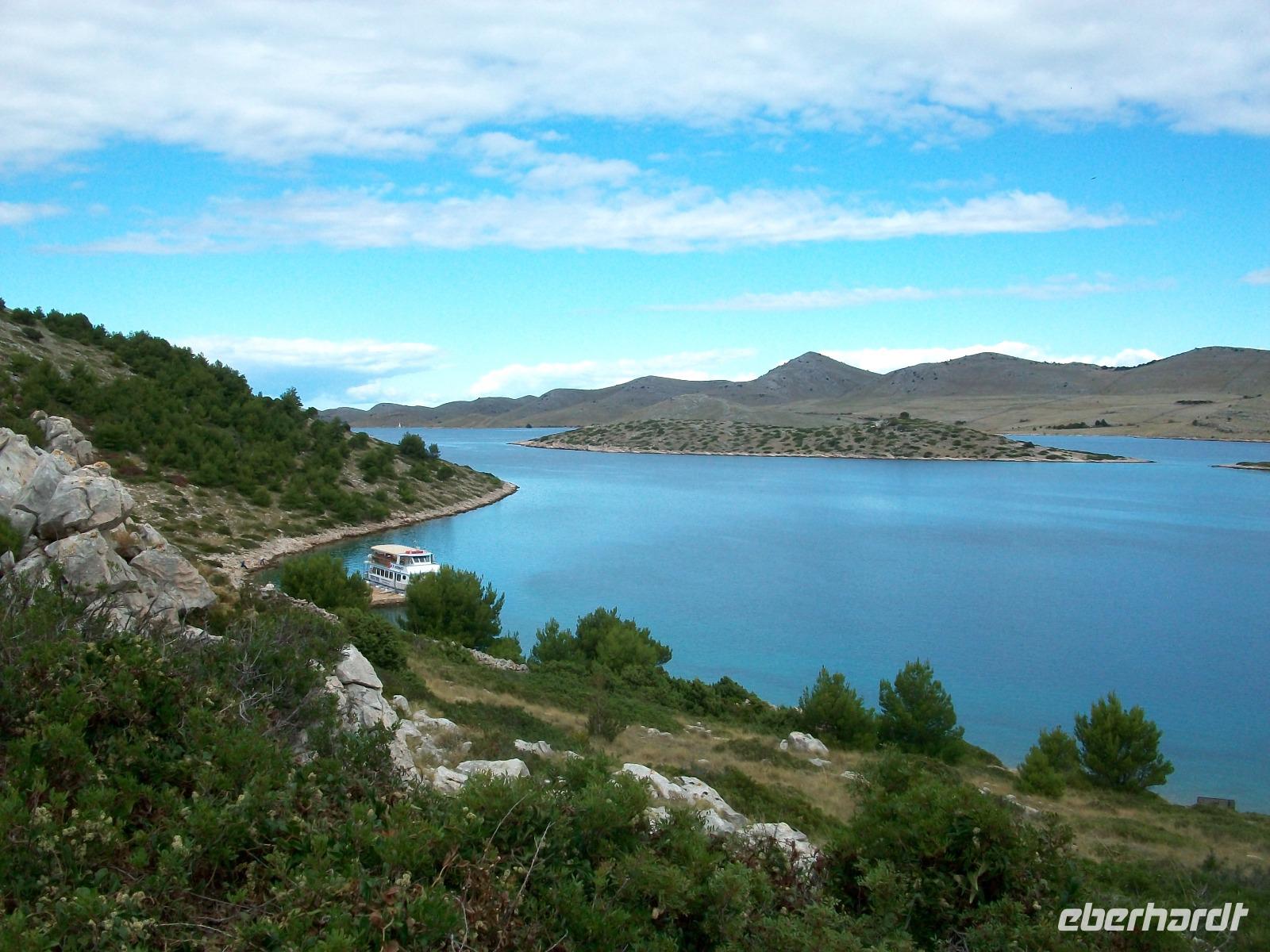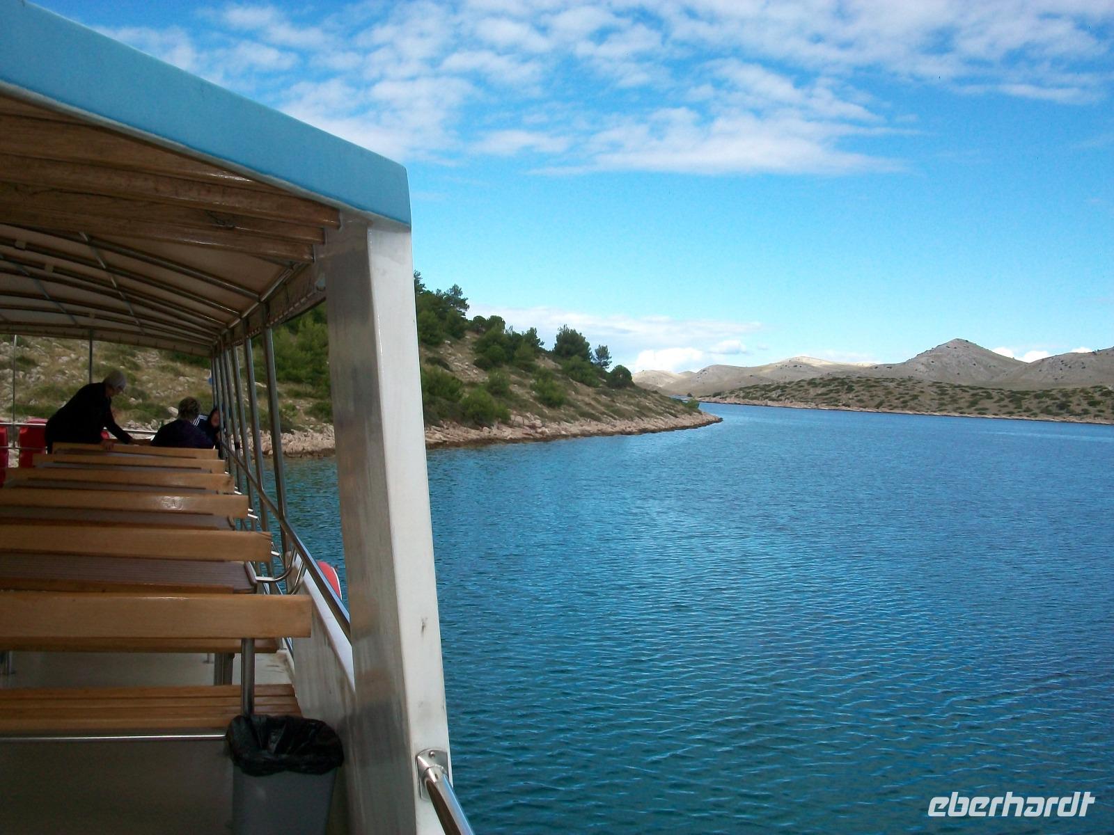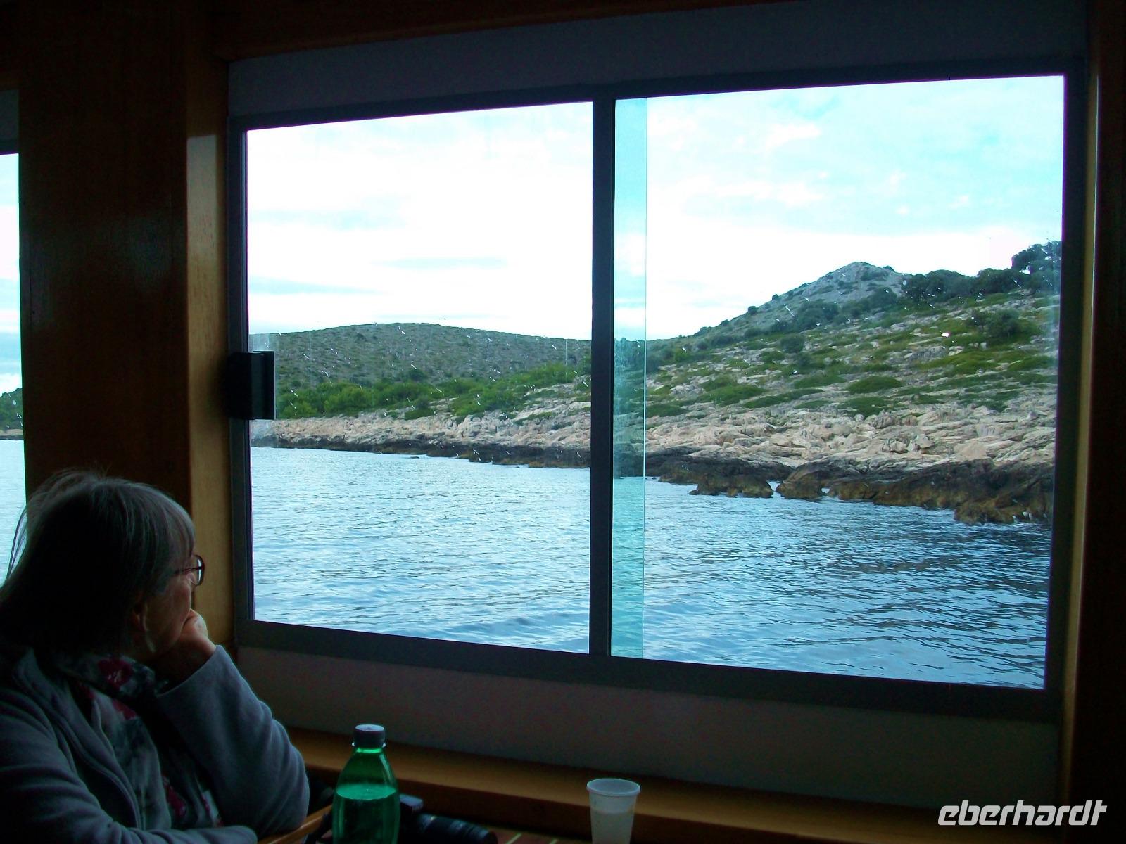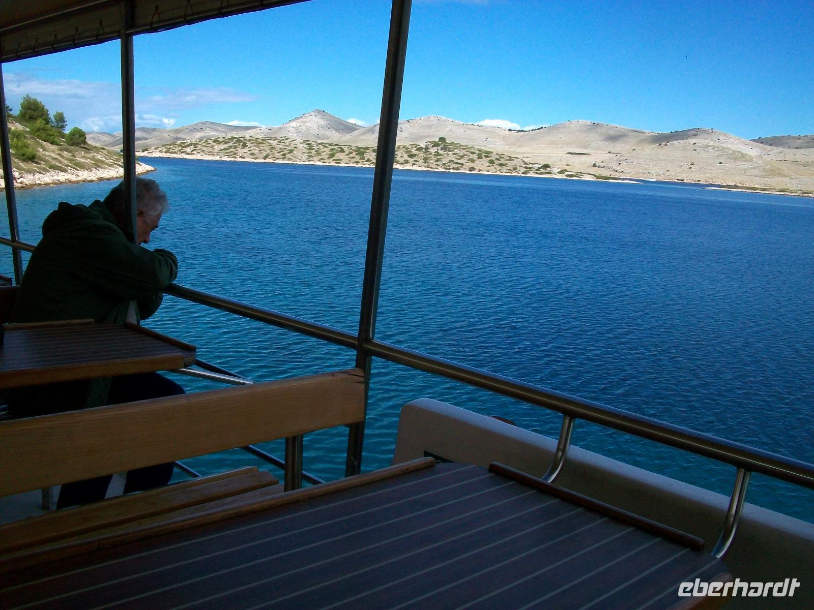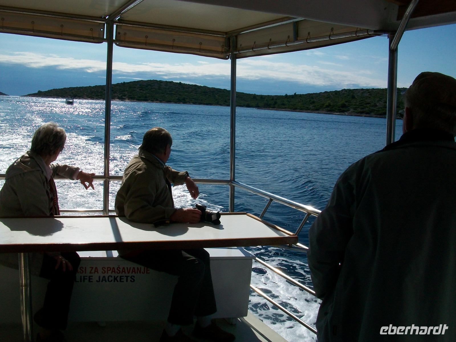 Wir starten zunächst bei etwas trüben Wetter und erreichen schon nach zwanzig Minuten den Hafen von Murter. Hier werden wir von der Crew des Schiffes begrüßt, schnell haben wir Platz genommen und gegen neun geht die Tour los. Leicht schaukelnd sucht sich das Schiff seine Bahn; die fast kahlen Inseln kommen näher und wir genießen die Fahrt durch das Labyrinth dieses reizvollen Archipels.