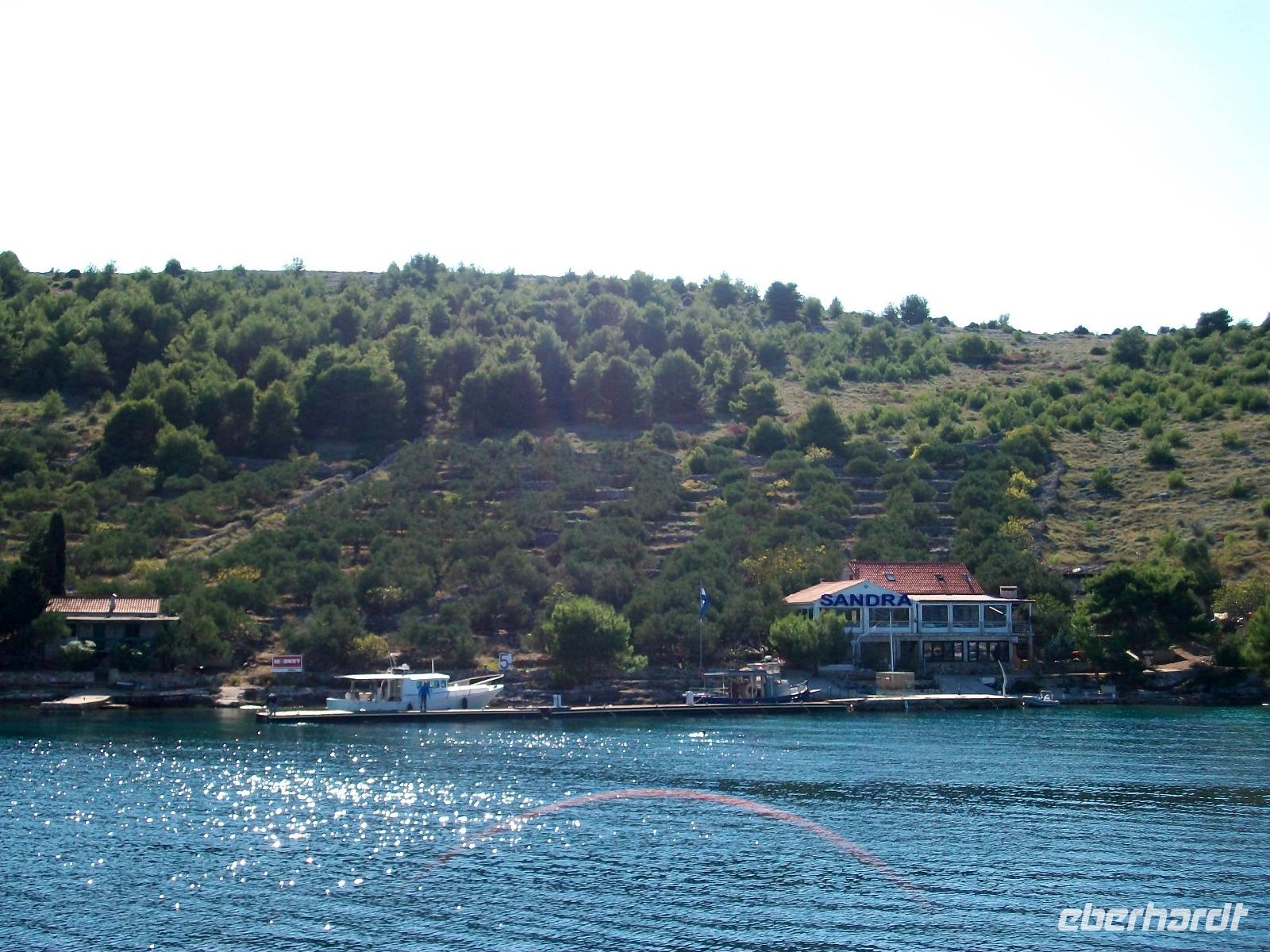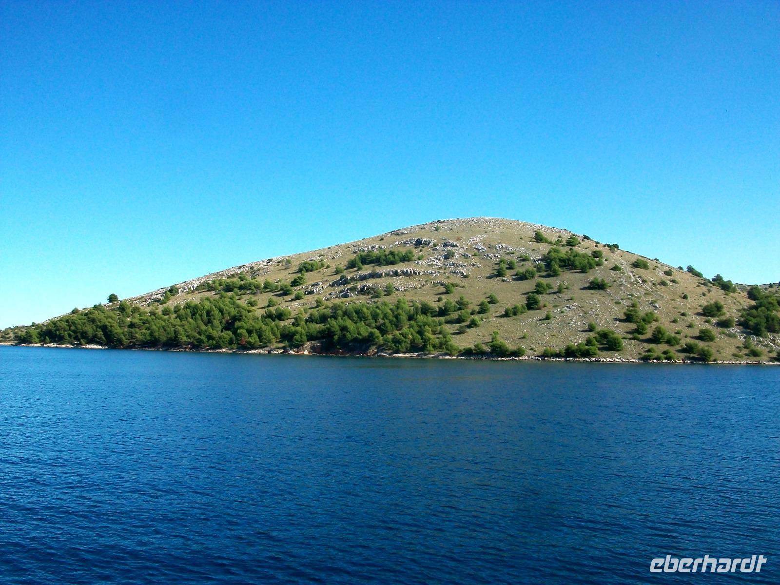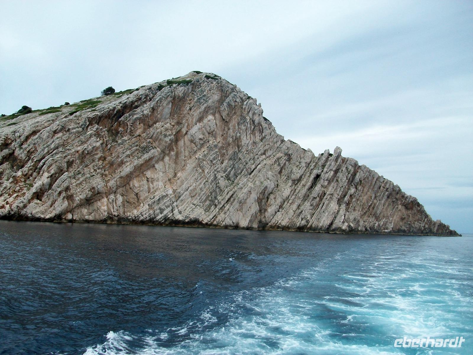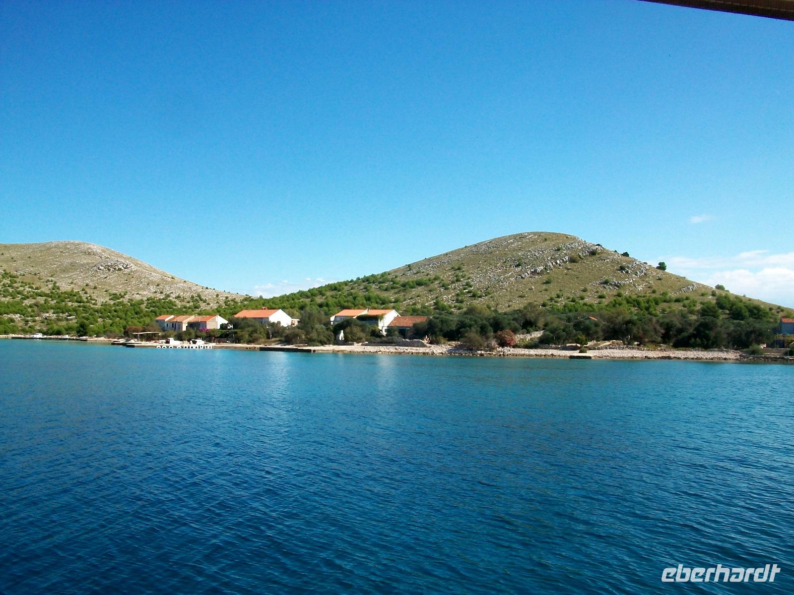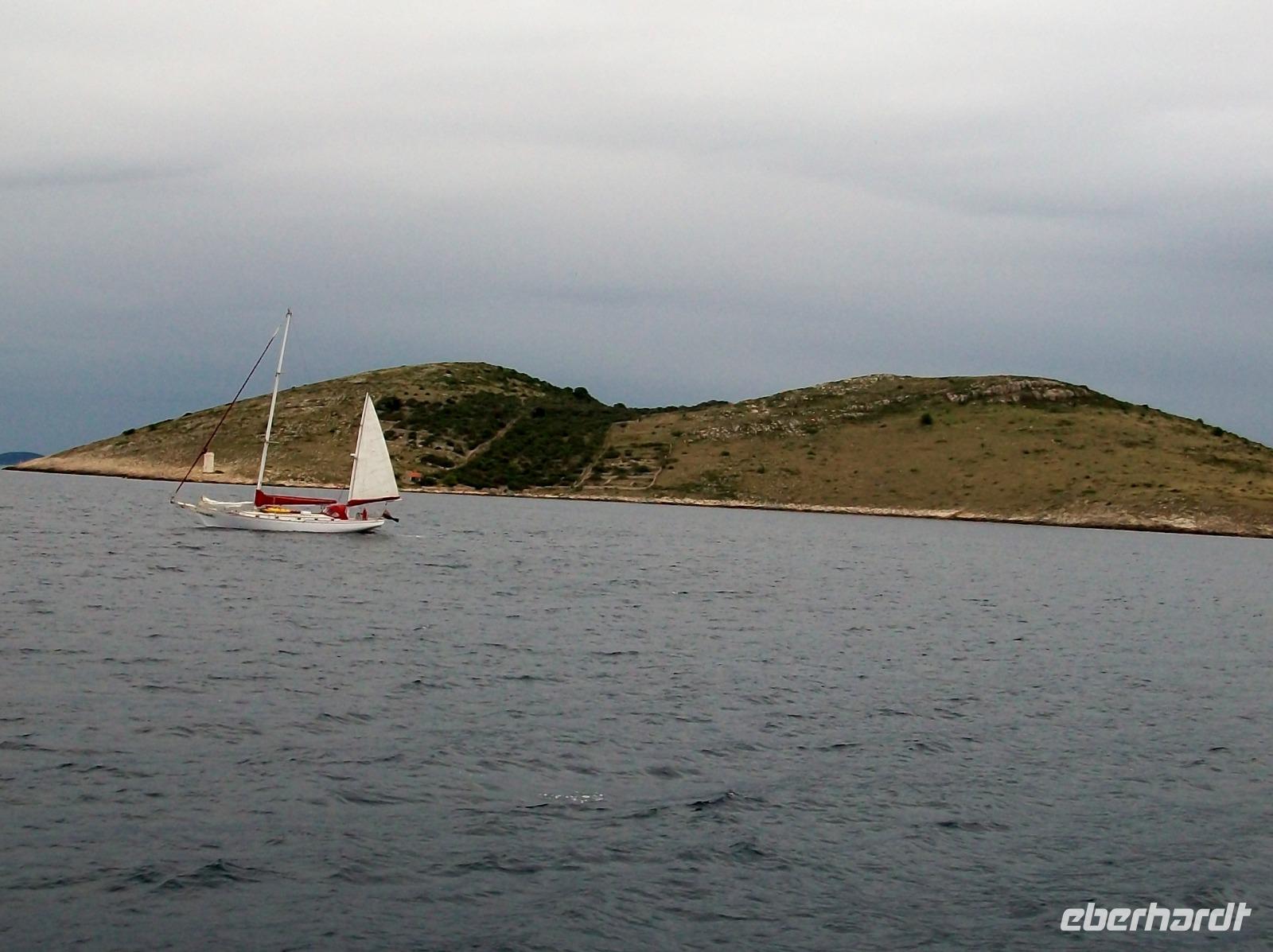 Wir starten zunächst bei etwas trüben Wetter und erreichen schon nach zwanzig Minuten den Hafen von Murter. Hier werden wir von der Crew des Schiffes begrüßt, schnell haben wir Platz genommen und gegen neun geht die Tour los. Leicht schaukelnd sucht sich das Schiff seine Bahn; die fast kahlen Inseln kommen näher und wir genießen die Fahrt durch das Labyrinth dieses reizvollen Archipels.