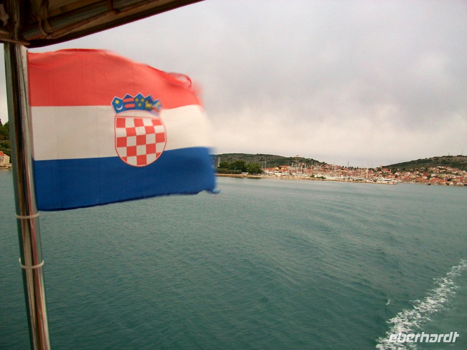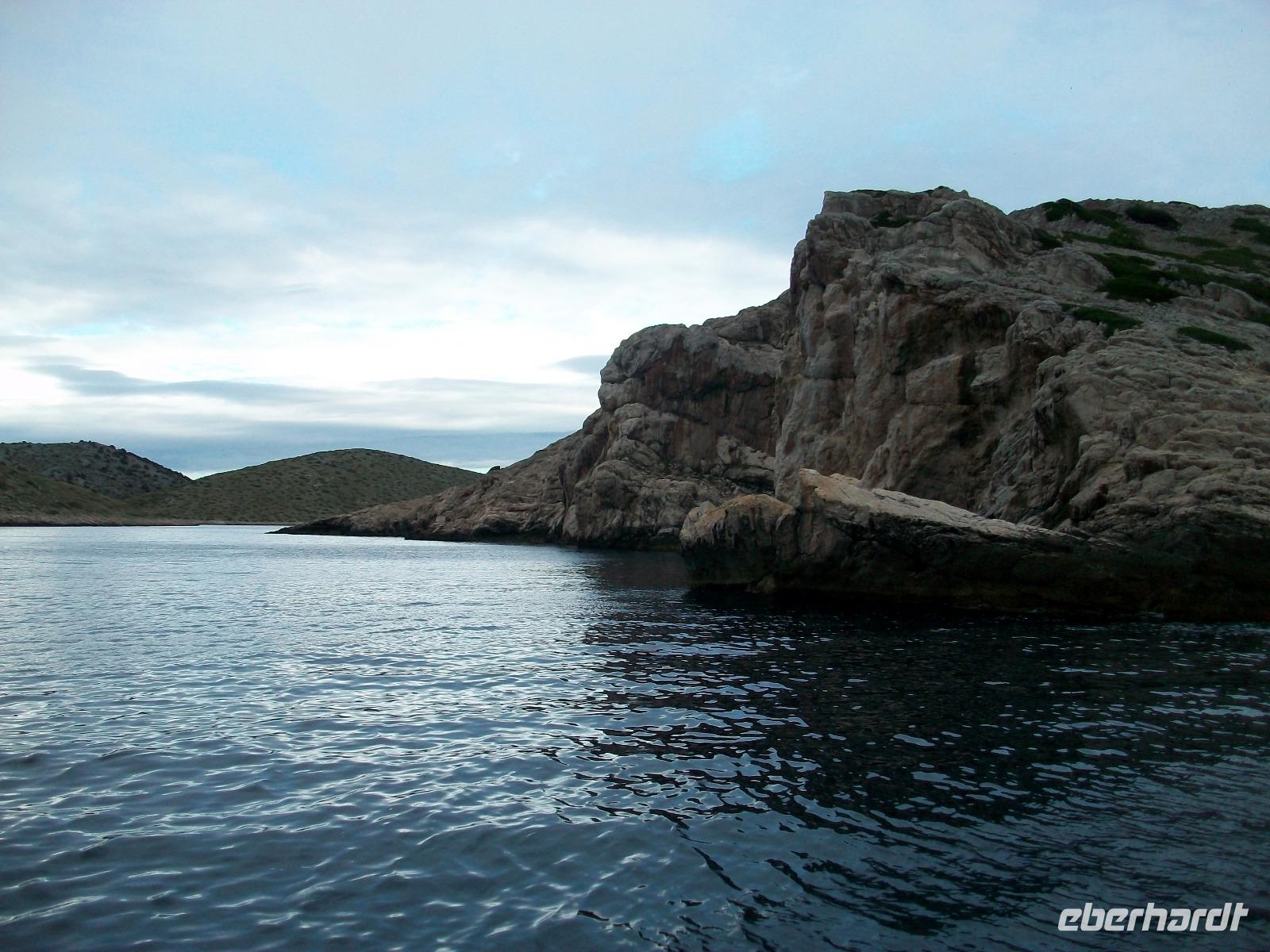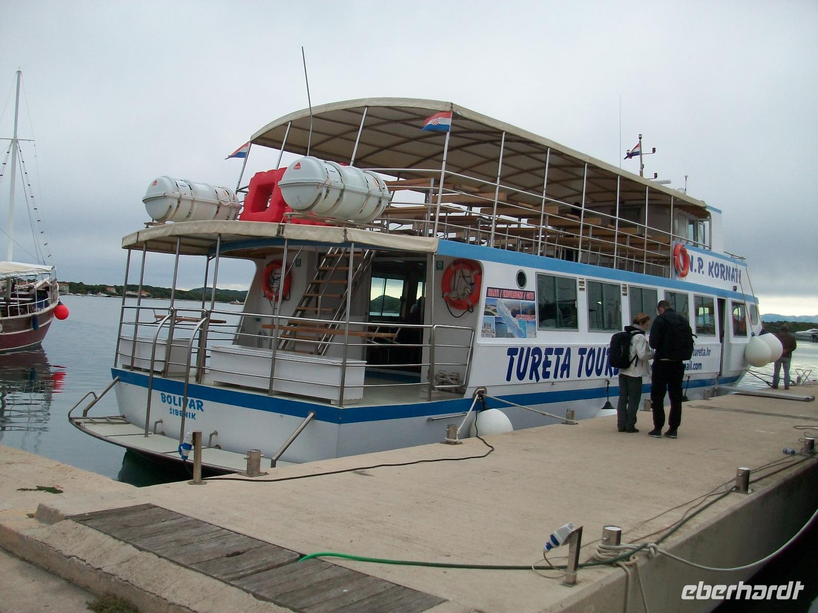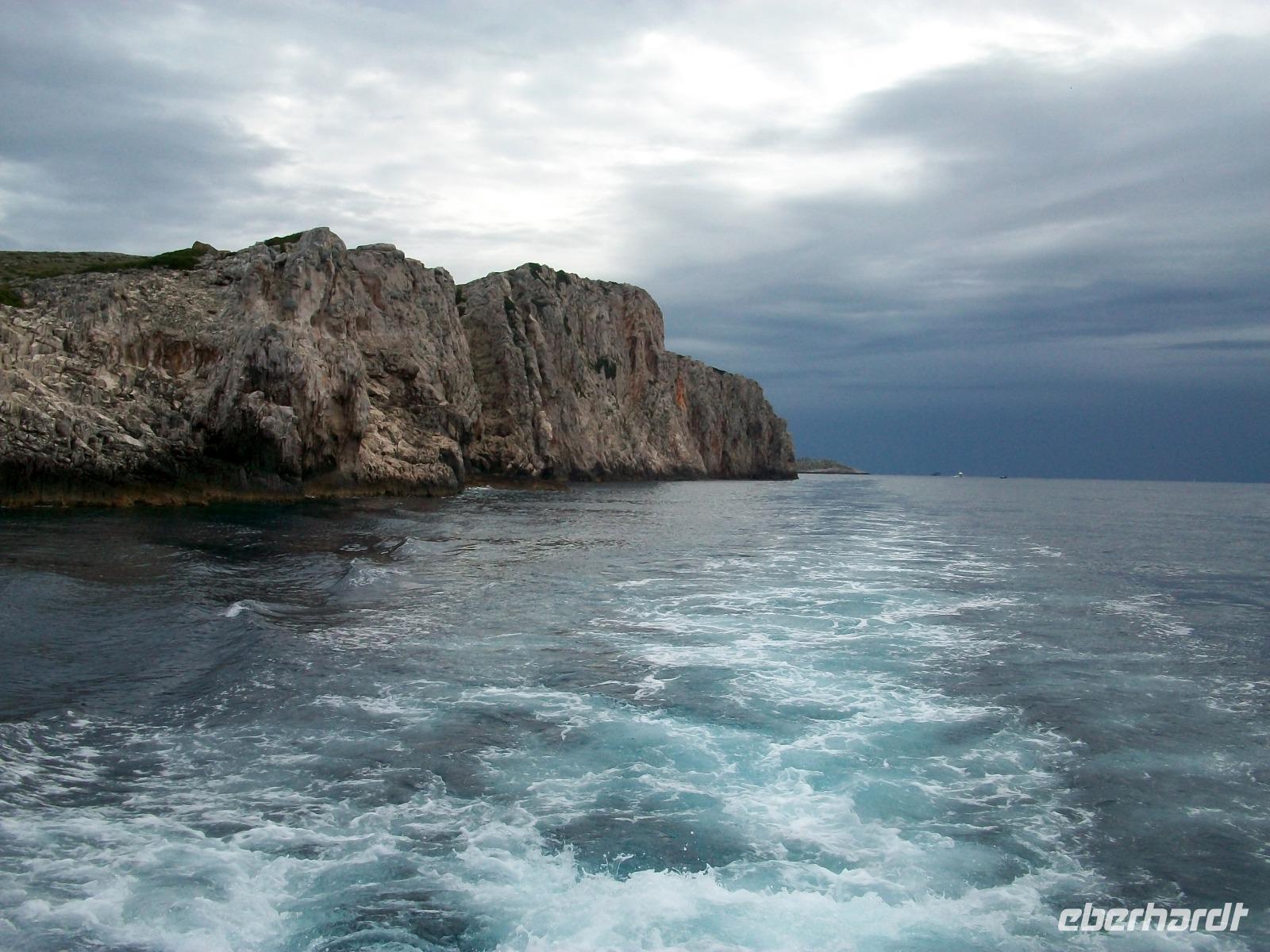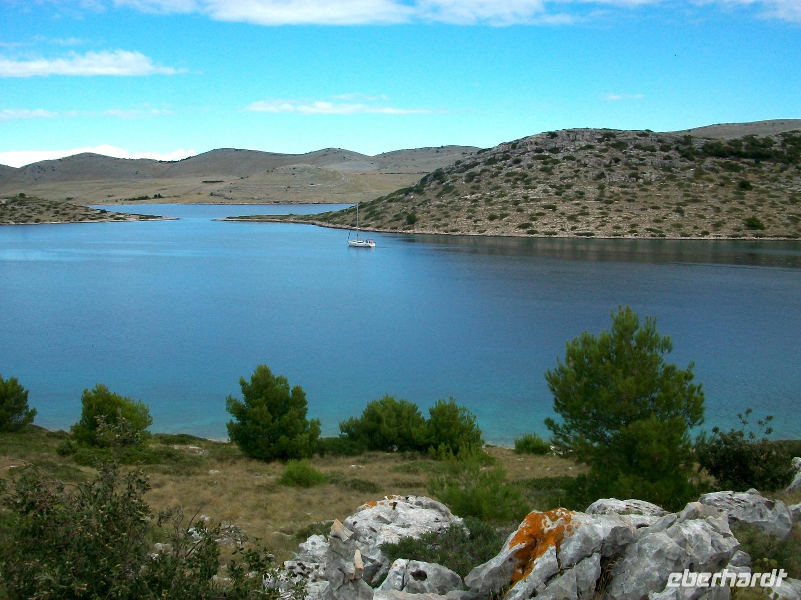 Wir starten zunächst bei etwas trüben Wetter und erreichen schon nach zwanzig Minuten den Hafen von Murter. Hier werden wir von der Crew des Schiffes begrüßt, schnell haben wir Platz genommen und gegen neun geht die Tour los. Leicht schaukelnd sucht sich das Schiff seine Bahn; die fast kahlen Inseln kommen näher und wir genießen die Fahrt durch das Labyrinth dieses reizvollen Archipels.