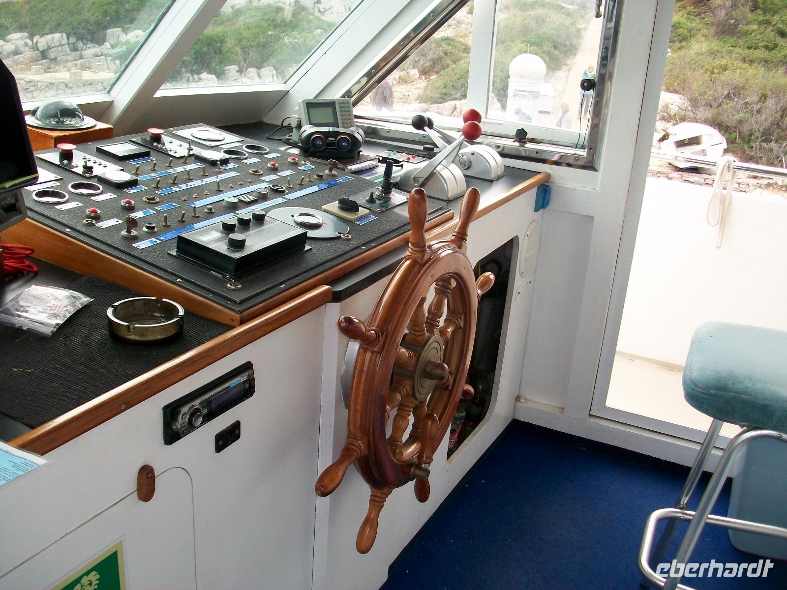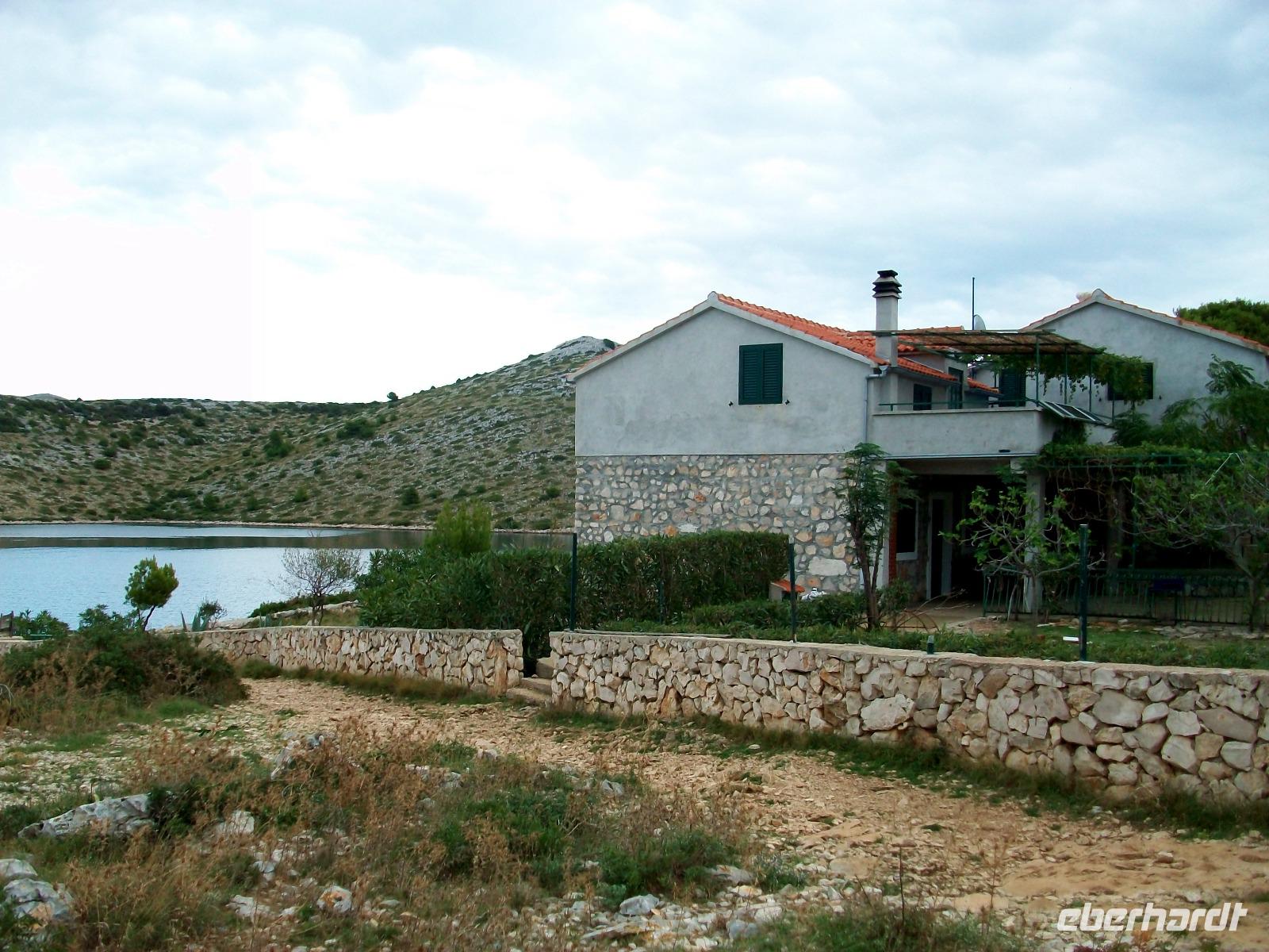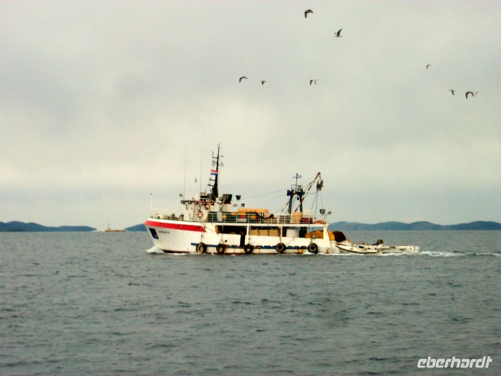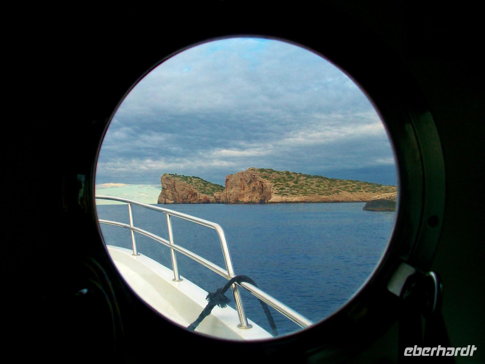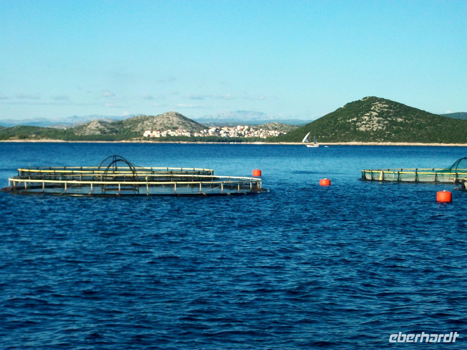 Wir starten zunächst bei etwas trüben Wetter und erreichen schon nach zwanzig Minuten den Hafen von Murter. Hier werden wir von der Crew des Schiffes begrüßt, schnell haben wir Platz genommen und gegen neun geht die Tour los. Leicht schaukelnd sucht sich das Schiff seine Bahn; die fast kahlen Inseln kommen näher und wir genießen die Fahrt durch das Labyrinth dieses reizvollen Archipels.