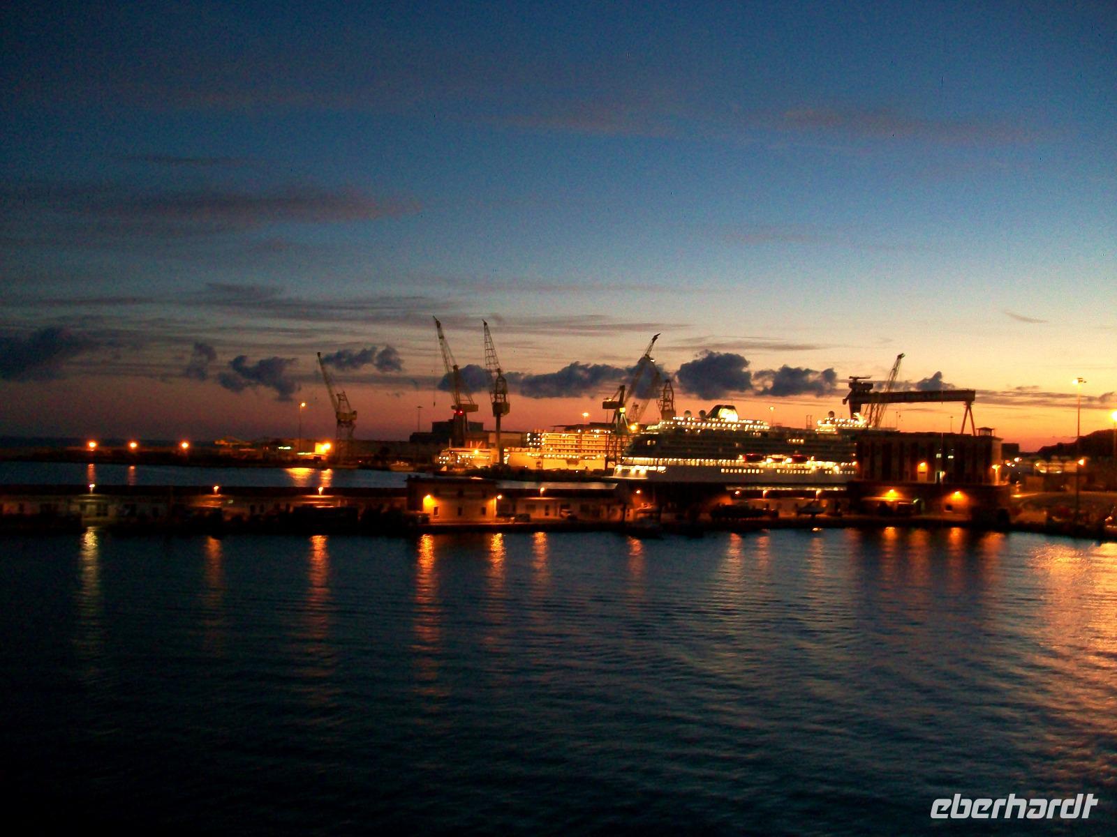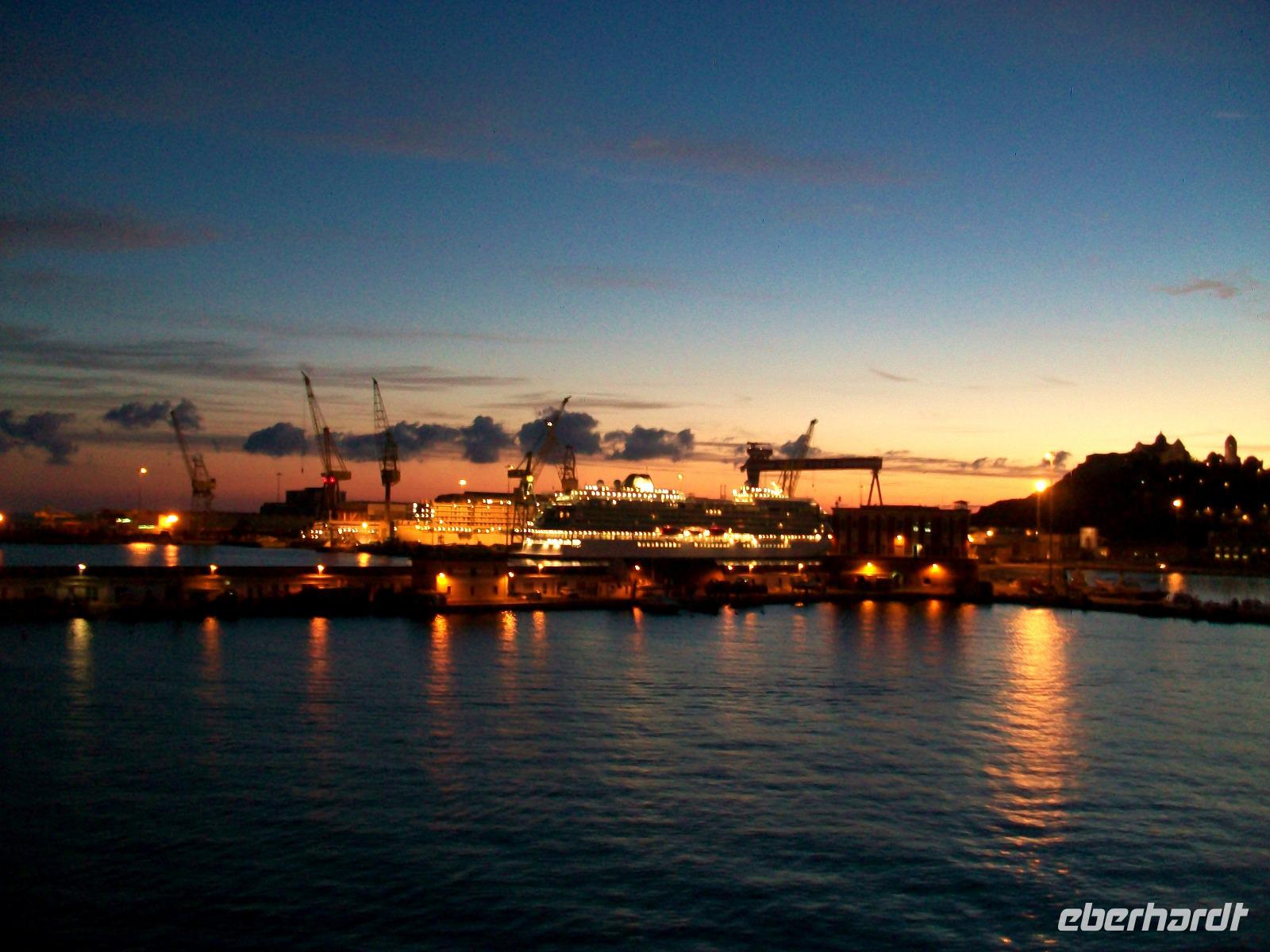 Gegen sechs treffen wir uns wieder; mit dem Bus gelangen wir zur Fähre, sie wird uns über Nacht nach Italien bringen. Als das Schiff ablegt ist es dunkel geworden; der schön beleuchtete Palast entschwindet langsam unseren Blicken, das Schiff nimmt Kurs in Richtung Westen, unserem nächsten Ziel entgegen.