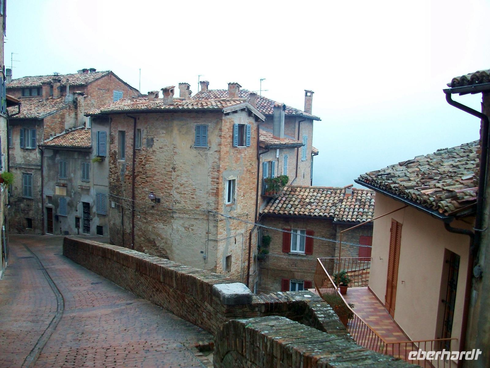Wir starten gegen acht und der Himmel weint, ein Tag könnte besser beginnen. Unterwegs hört der Regen aber auf und als wir zu unserem ersten Ziel kommen, können wir die Regenschirme im Bus lassen. Oben auf dem Berg sind die Häuser von Urbino zu sehen; ein kleiner Fußweg führt uns aufwärts und an der Piazza della Republica beginnt die Entdeckung dieser Renaissancestadt. Gewaltig sind die Häuser mit ihren hohen Ziegelmauern anzuschauen, verschlungen die Gassen und wunderschön die zahlreichen Ausstellungen dieses Ortes; das war ein gelungener Auftakt des Tages!