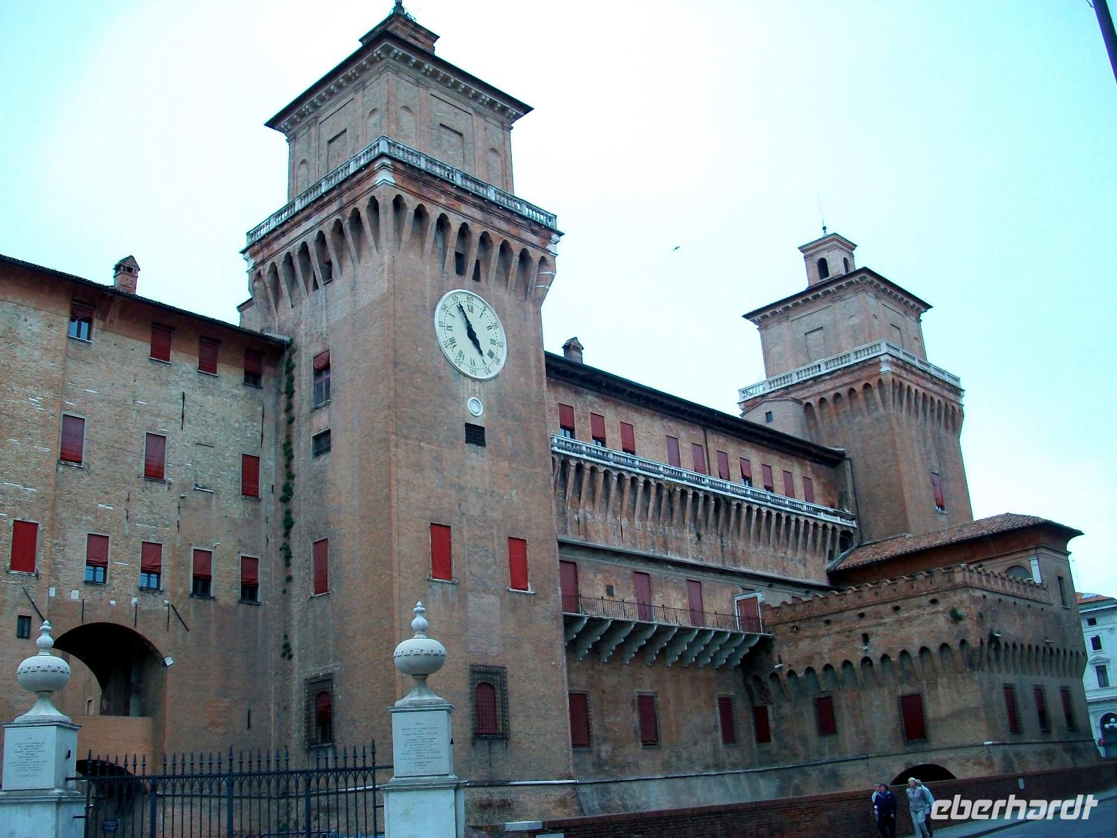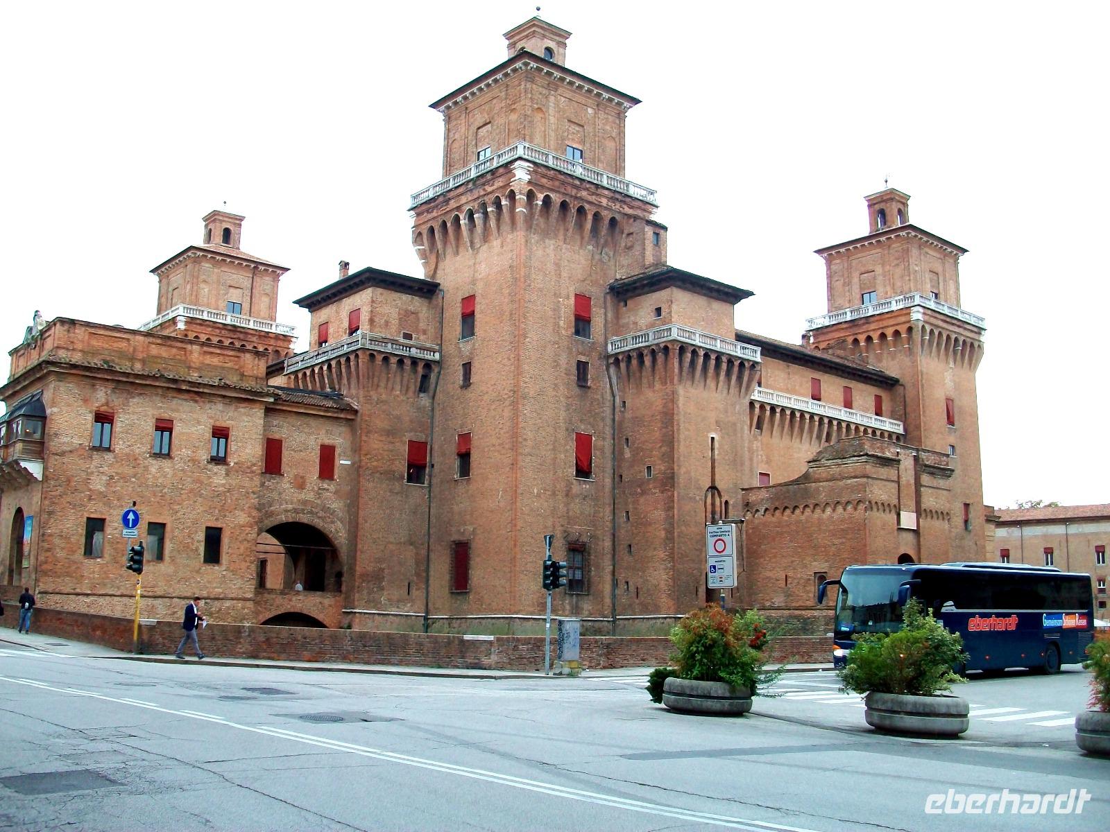 Weit dehnen sich die fruchtbaren Felder der Emilia Romagna aus als wir mit unserem Bus in dieser schönen und von der Landwirtschaft geprägten Gegend unterwegs sind. Am Nachmittag langen wir in Ferrara an, der Bus bringt uns in das Zentrum dieser Stadt und hier gönnen wir uns noch ein gutes Stündchen Aufenthalt. Vor uns breiten sich die mächtigen Mauern des Wasserschlosses der Familie Este aus. Dieses Geschlecht ist schon seit Jahrhunderten ausgestorben, unsterblich haben sie sich hier in ihrem Palast verewigt der in seiner Architektur ein Glanzstück der Renaissance darstellt. Das sind Bauten für die Ewigkeit und nur die Zukunft wird es zeigen ob auch unsere Epoche durch solche Monumente die Nachkommen in späteren Jahrhunderten in gleicher Art begeistern kann.