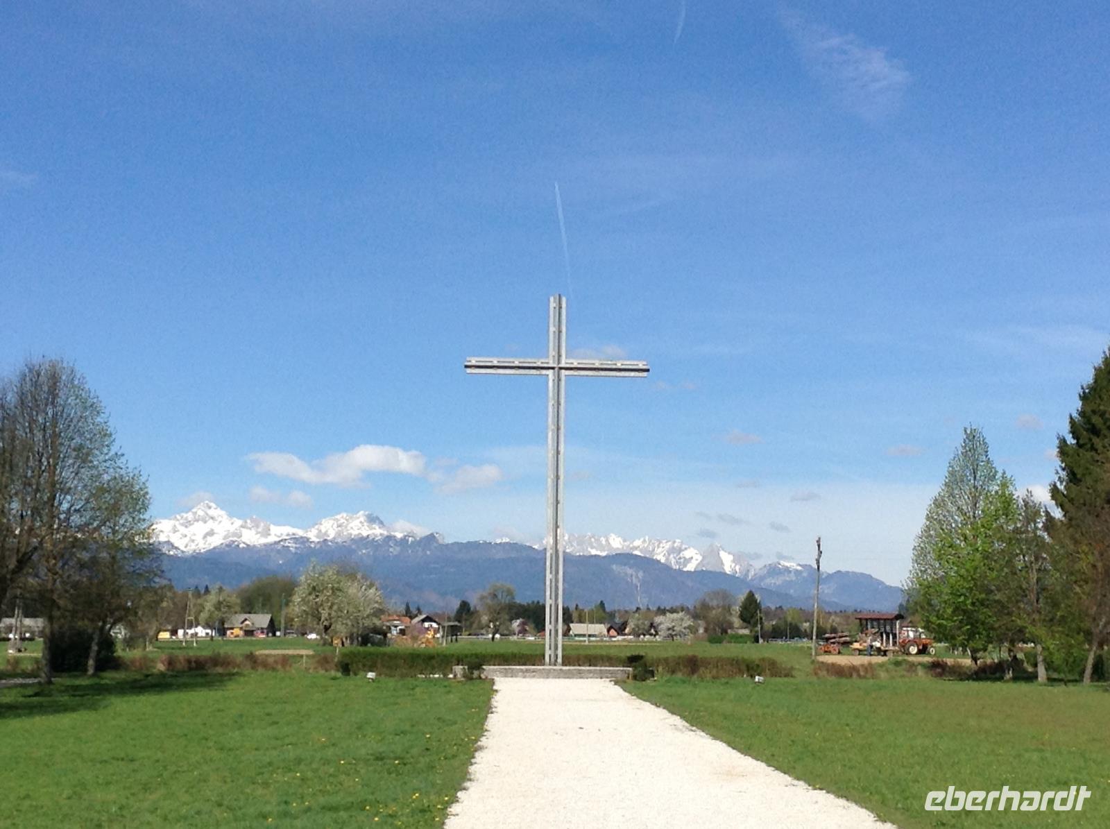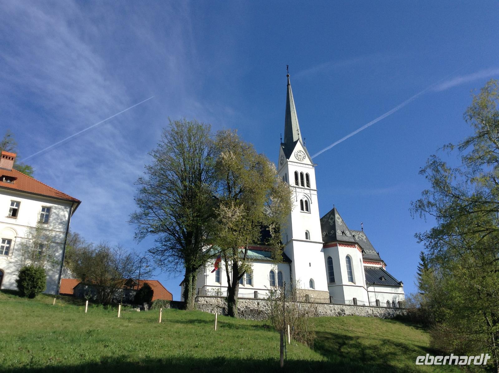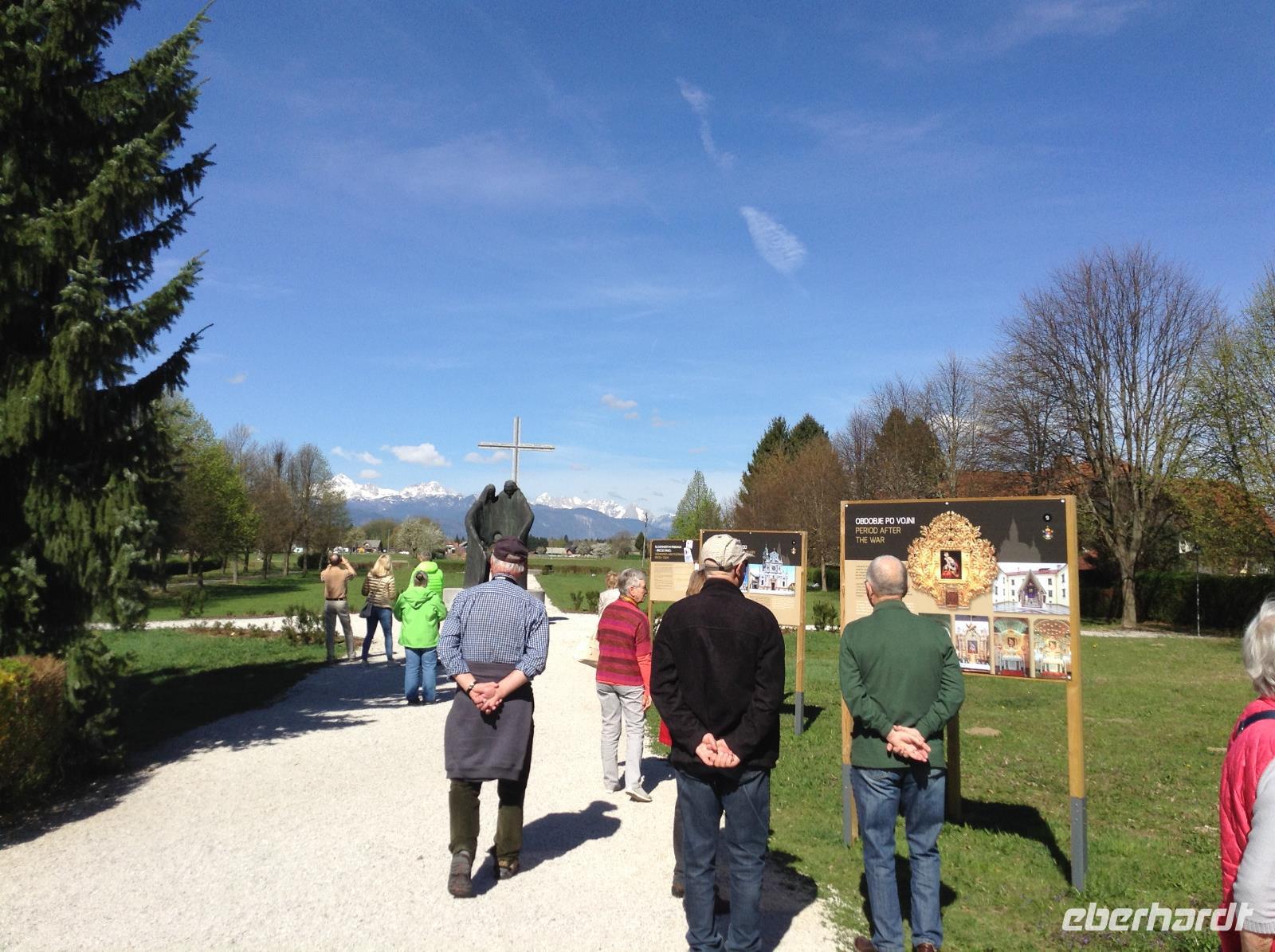 Anschießend fahren wir zur wichtigsten slowenischen Pilgerkirche nach Brezje. Wir geniessen von da auch einen wunderschönen Blick zurück in die noch teils verschneiten Berge.
