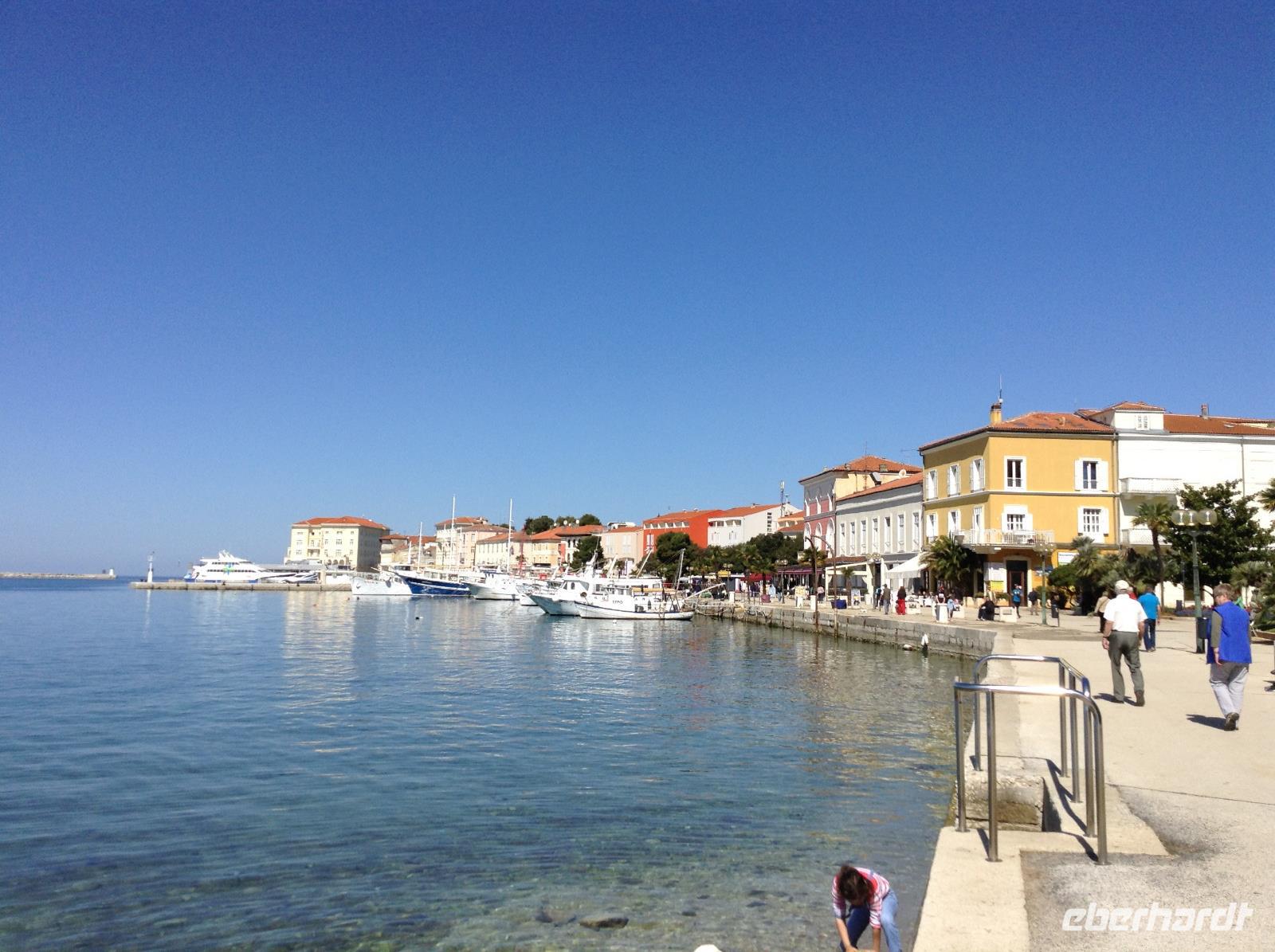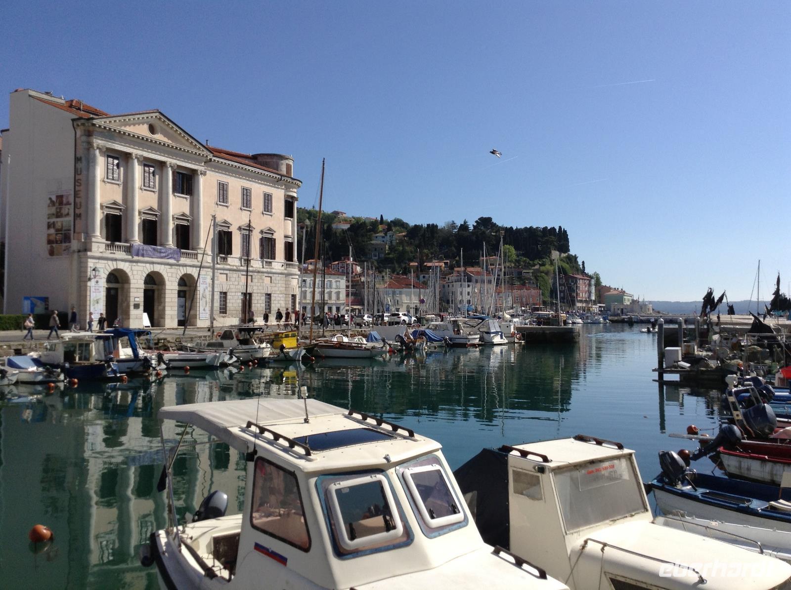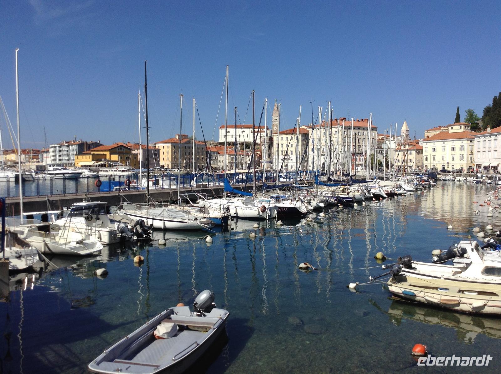 Dann ging es weiter vorbei am Ort Postojna und dem Eingang zu den Adelsberger Grotten auf schmaler Landstraße zur "Burg vor der Höhle", auf dem einst der Raubritter Erasmus sein Unwesen trieb. Predjamski Grad war schon besonders sehenswert ! Weiter geht es in Richtung Süden, wir wollen noch die Adria sehen an diesem Tag. Wir durchqueren Slowenien und fahren zum kleinen slowenischen Küstenabschnitt an der Adria, nach Piran. Gemeinsam gehen wir auf Stadtbummel an der Küste entlang zum Platz Tartini, genießen erste warme Sonnenstrahlen und traumhaft blaues Meer. Zahlreiche Boote haben im Hafen festgemacht und die Bistros und Kaffees entlang der Küste laden zum Verweilen und Entspannen ein.