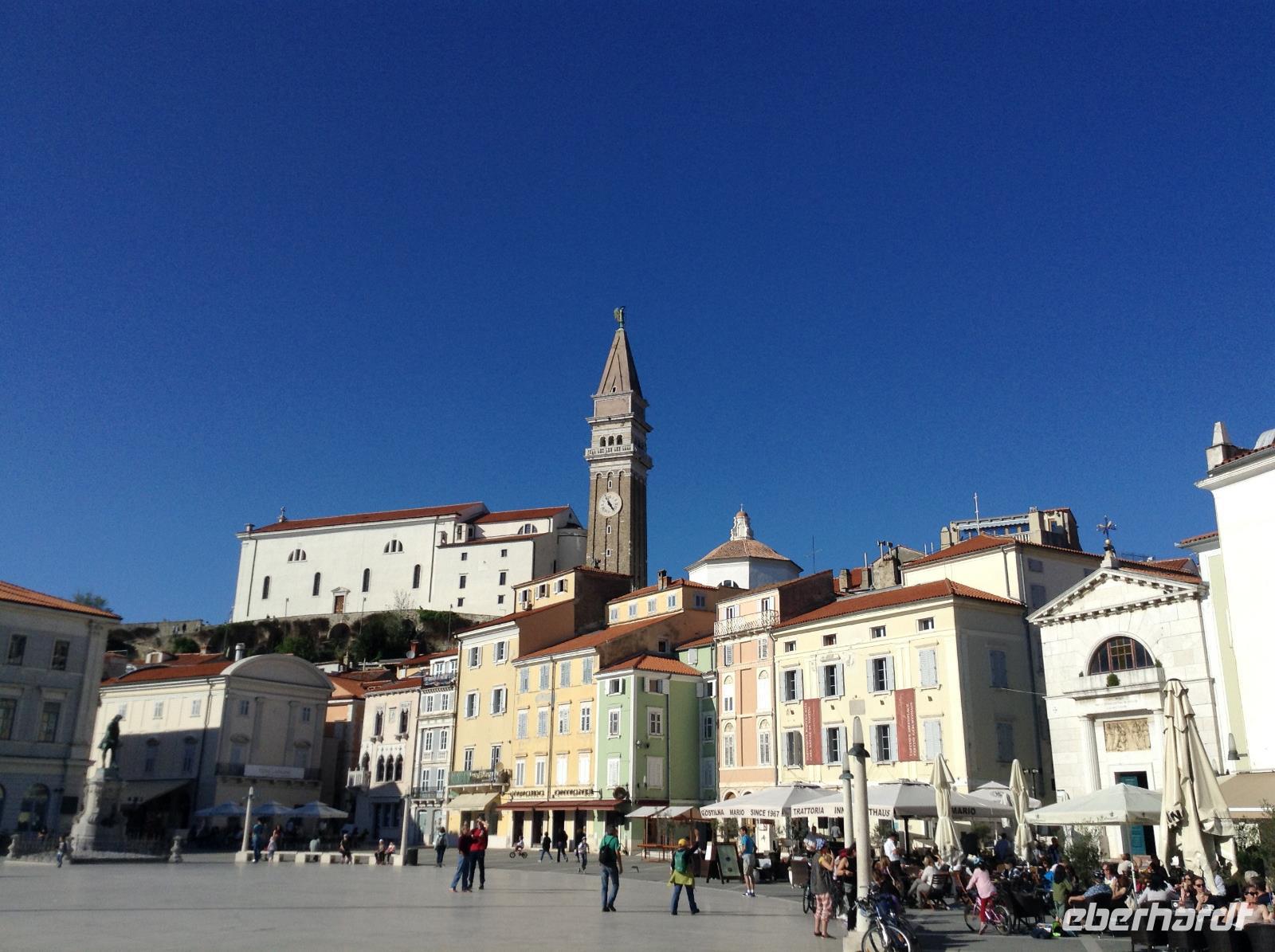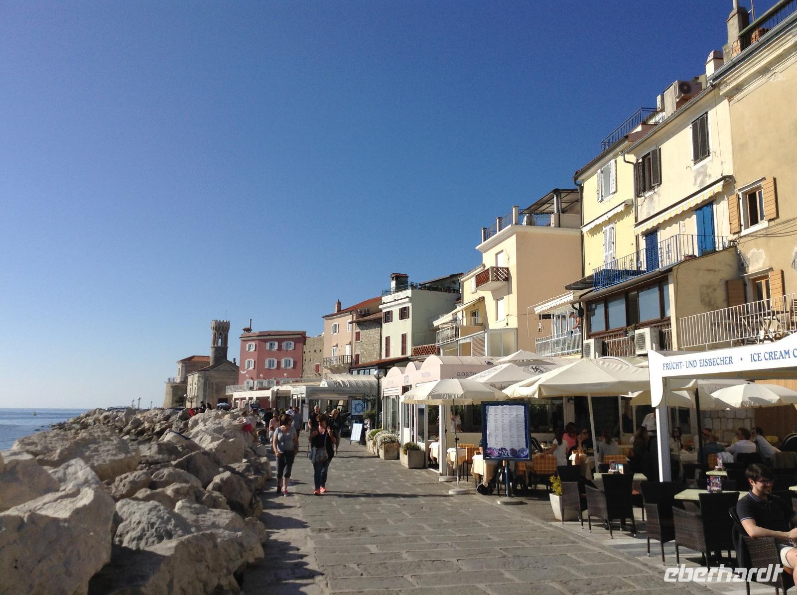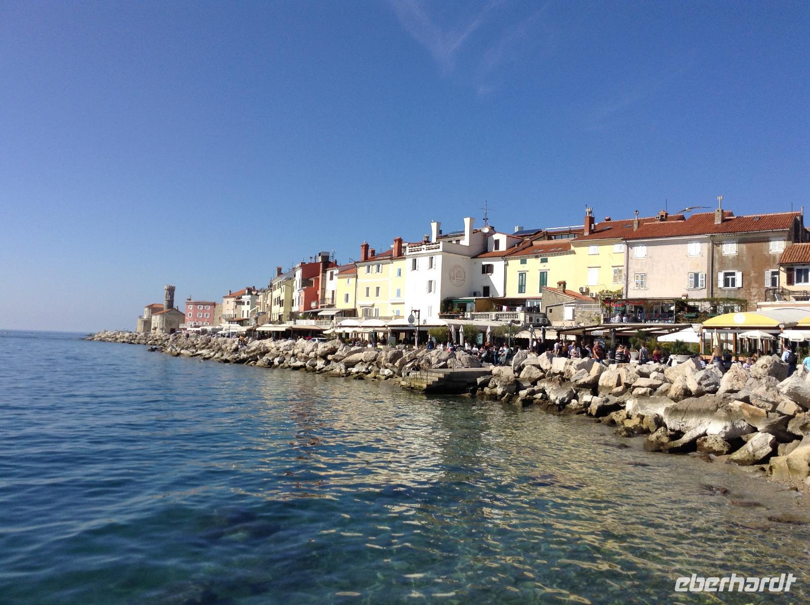 Dann ging es weiter vorbei am Ort Postojna und dem Eingang zu den Adelsberger Grotten auf schmaler Landstraße zur "Burg vor der Höhle", auf dem einst der Raubritter Erasmus sein Unwesen trieb. Predjamski Grad war schon besonders sehenswert ! Weiter geht es in Richtung Süden, wir wollen noch die Adria sehen an diesem Tag. Wir durchqueren Slowenien und fahren zum kleinen slowenischen Küstenabschnitt an der Adria, nach Piran. Gemeinsam gehen wir auf Stadtbummel an der Küste entlang zum Platz Tartini, genießen erste warme Sonnenstrahlen und traumhaft blaues Meer. Zahlreiche Boote haben im Hafen festgemacht und die Bistros und Kaffees entlang der Küste laden zum Verweilen und Entspannen ein.