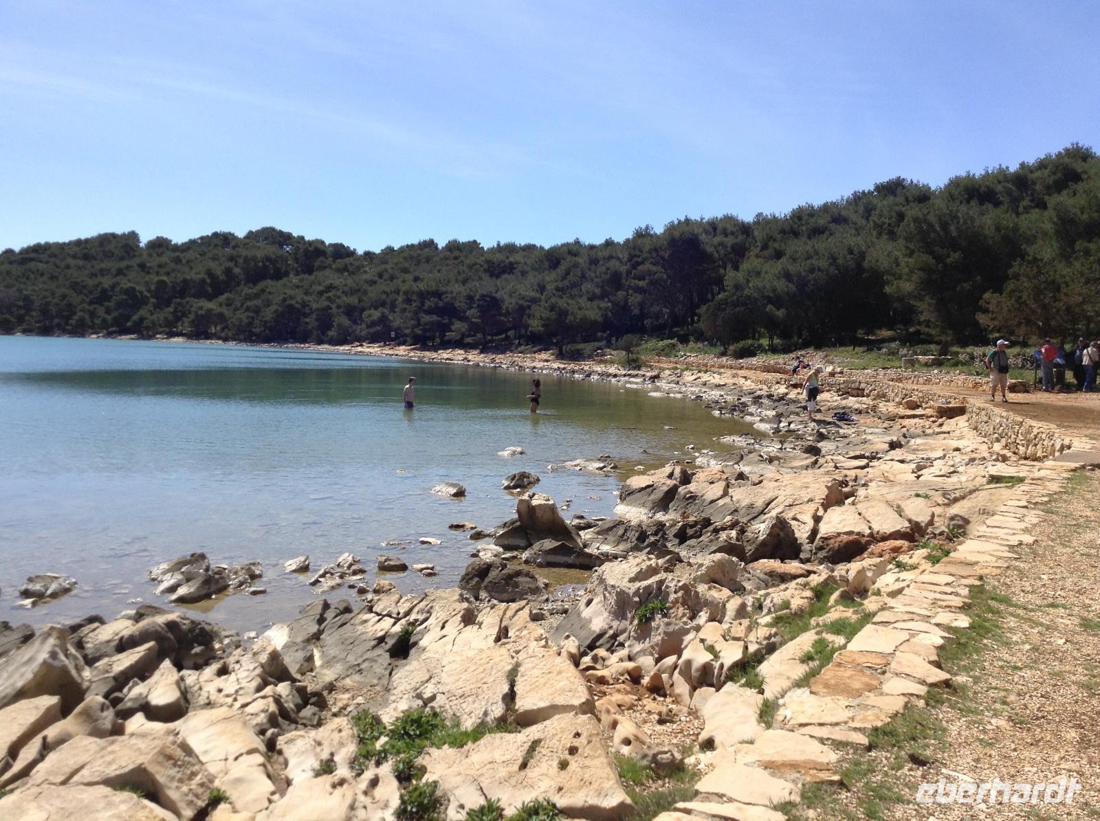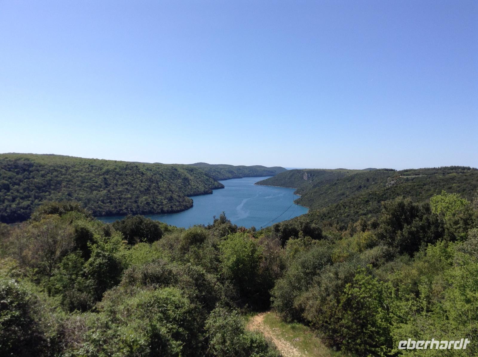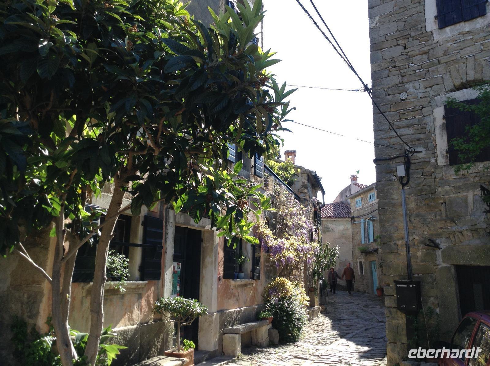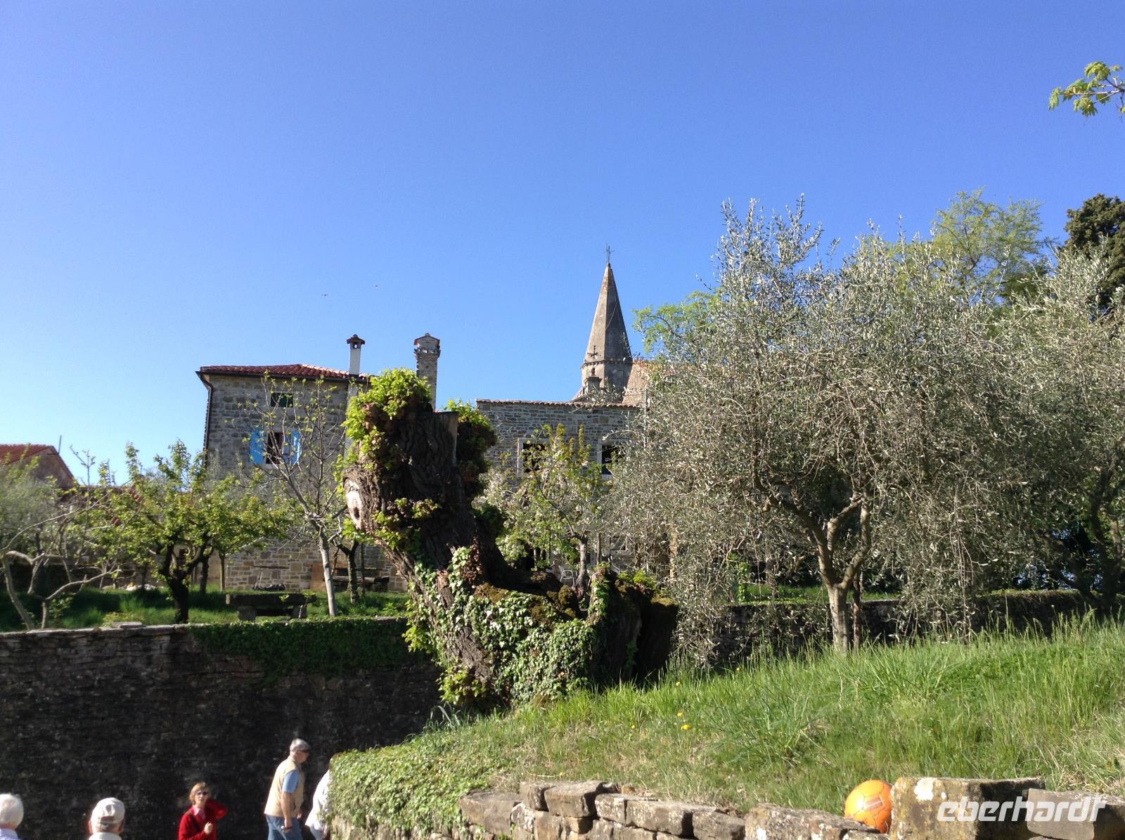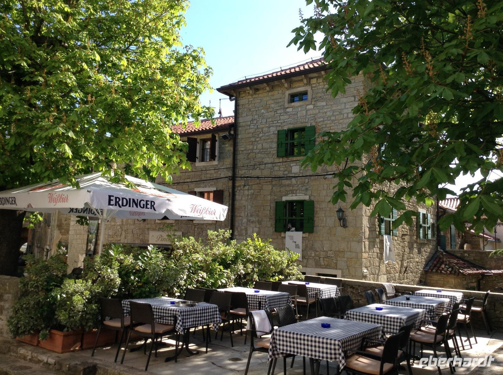 Gleich früh am Morgen geht es über die Grenze nach Kroatien. Kurzer Stopp an der Grenze, alle raus aus dem Buss und zur Ausweiskontrolle ! Wir haben aber nicht viel Zeit verlohren und so geht es weiter zur Erkundung Istriens. Wir fahren ins hügelige Hinterland zum ersten Ziel, dem kleinen alten Künstlerdorf Groznjan. Eigentlich erwarten wir ziemliche Einsamkeit, dem ist aber an diesem tag nicht so ! Ein Fahrradrennen findet statt und die ehe schon schmale Zufahrt zum Parkplatz vor den Toren des Städtchens ist voll mit parkenden Autos und Bikern. Beim Bummeln durch den Ort entdecken wir etliche Galerien und auch einen wirklichen Künstler, der uns sein Haus und die Werkstatt und seine Gemälde zeigt. Eine sehr nette und interessante Begegnung. Aus den Bergen geht es zurück an die Küste, jetzt zum kroatischen Abschnitt. Wir fahren nach Porec mit seinen alten Sehenswürdigkeiten, die teilweise unter Unesco-Weltkulturerbe stehen. Dort ist für alle Freizeit zum Bummeln in den engen Altstadtgassen und natürlich zum Shoppen, denn es gibt hier auch nette kleine Läden. Einige probieren auch die leckere Istrische Küche. Nach dem Mittag geht es weiter entlang der Küste Istriens bis nach Pula. Unterwegs durfte der tolle Ausblick auf den Limski-Kanal nicht verpasst werden, ein sehr schönes Fotomotiv.