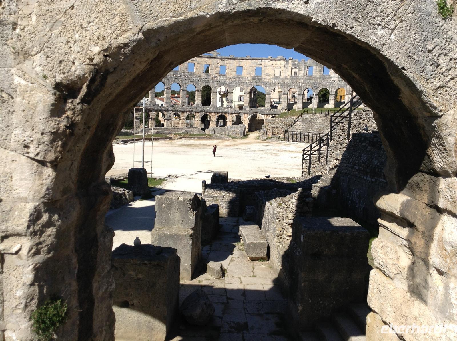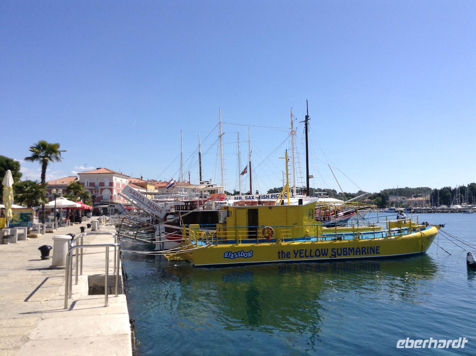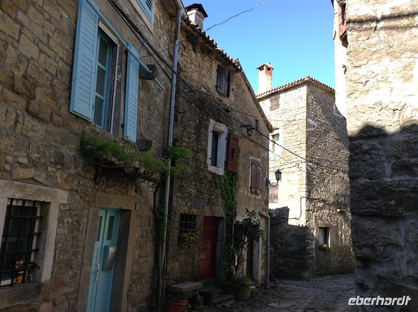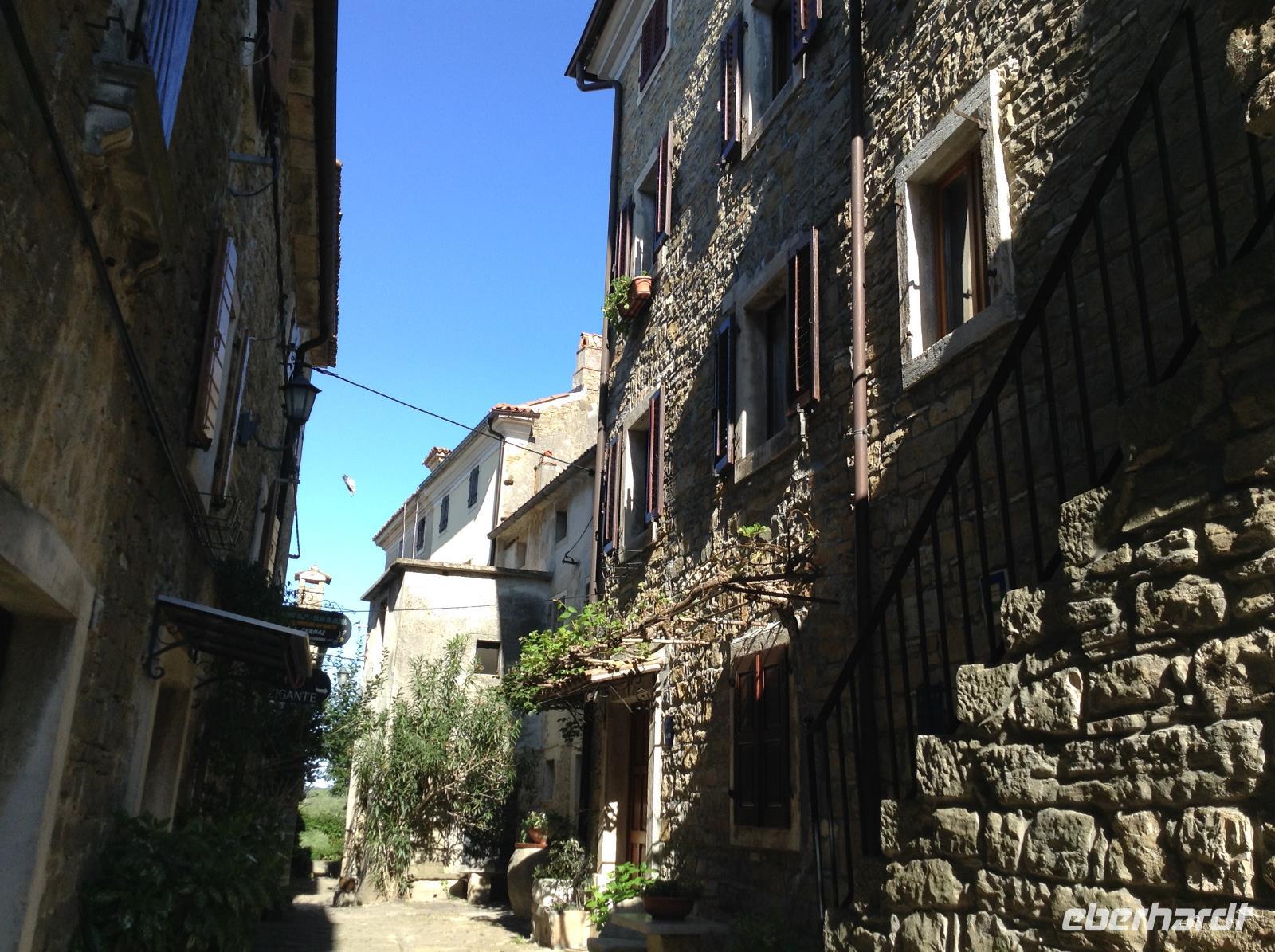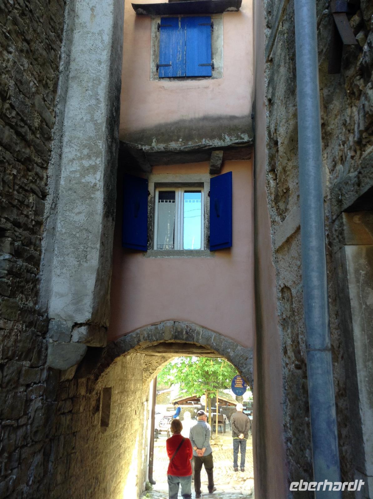 Gleich früh am Morgen geht es über die Grenze nach Kroatien. Kurzer Stopp an der Grenze, alle raus aus dem Buss und zur Ausweiskontrolle ! Wir haben aber nicht viel Zeit verlohren und so geht es weiter zur Erkundung Istriens. Wir fahren ins hügelige Hinterland zum ersten Ziel, dem kleinen alten Künstlerdorf Groznjan. Eigentlich erwarten wir ziemliche Einsamkeit, dem ist aber an diesem tag nicht so ! Ein Fahrradrennen findet statt und die ehe schon schmale Zufahrt zum Parkplatz vor den Toren des Städtchens ist voll mit parkenden Autos und Bikern. Beim Bummeln durch den Ort entdecken wir etliche Galerien und auch einen wirklichen Künstler, der uns sein Haus und die Werkstatt und seine Gemälde zeigt. Eine sehr nette und interessante Begegnung. Aus den Bergen geht es zurück an die Küste, jetzt zum kroatischen Abschnitt. Wir fahren nach Porec mit seinen alten Sehenswürdigkeiten, die teilweise unter Unesco-Weltkulturerbe stehen. Dort ist für alle Freizeit zum Bummeln in den engen Altstadtgassen und natürlich zum Shoppen, denn es gibt hier auch nette kleine Läden. Einige probieren auch die leckere Istrische Küche. Nach dem Mittag geht es weiter entlang der Küste Istriens bis nach Pula. Unterwegs durfte der tolle Ausblick auf den Limski-Kanal nicht verpasst werden, ein sehr schönes Fotomotiv.