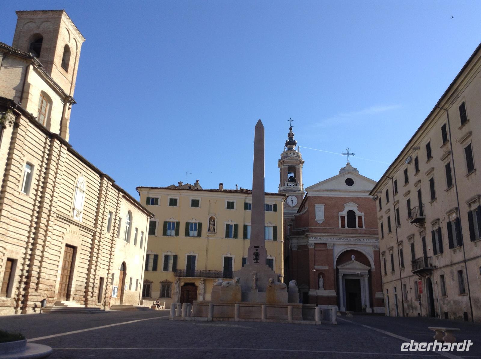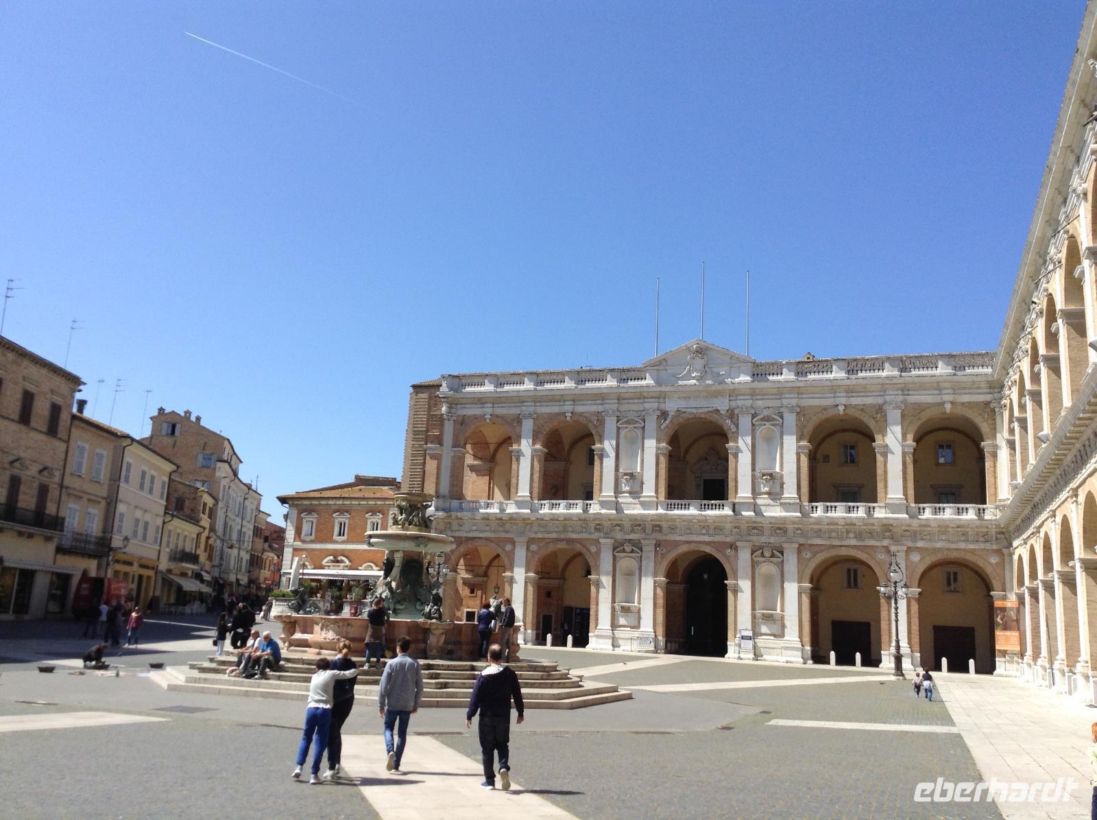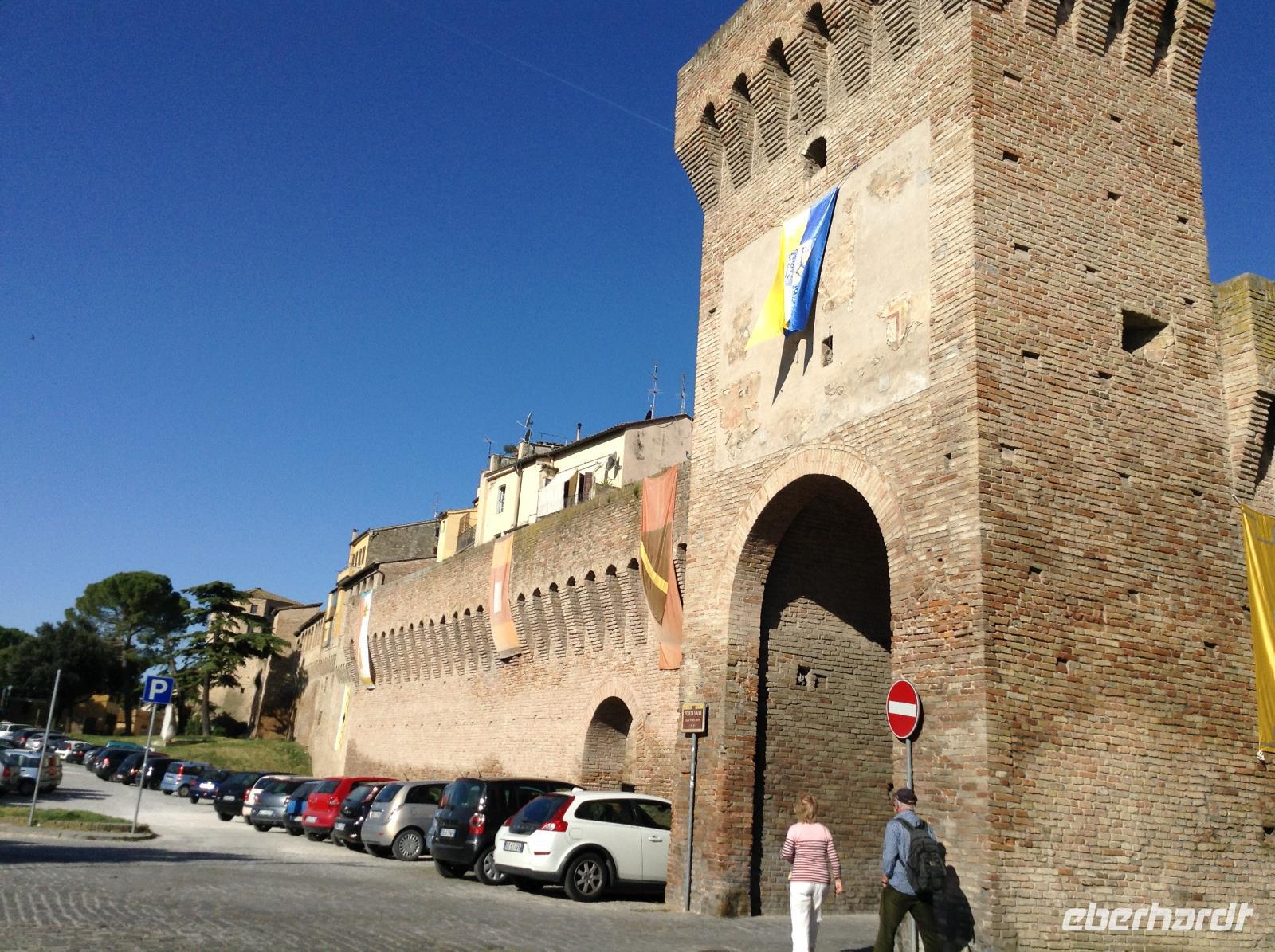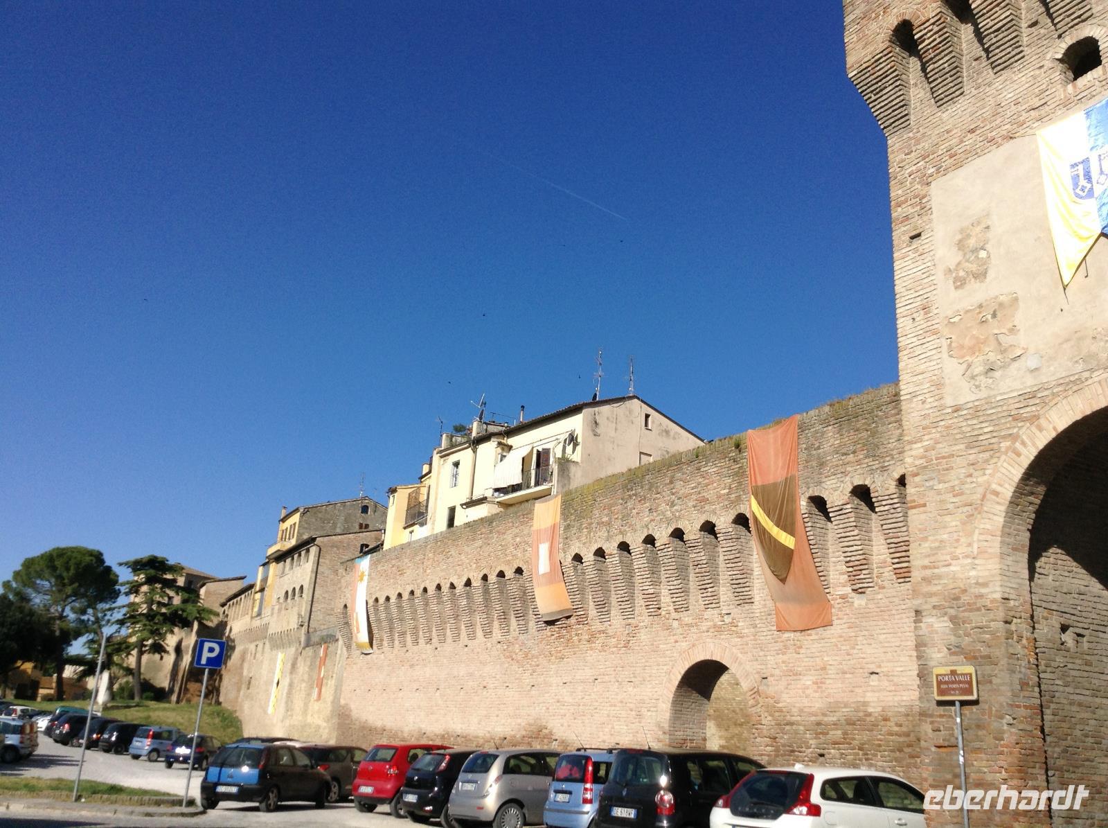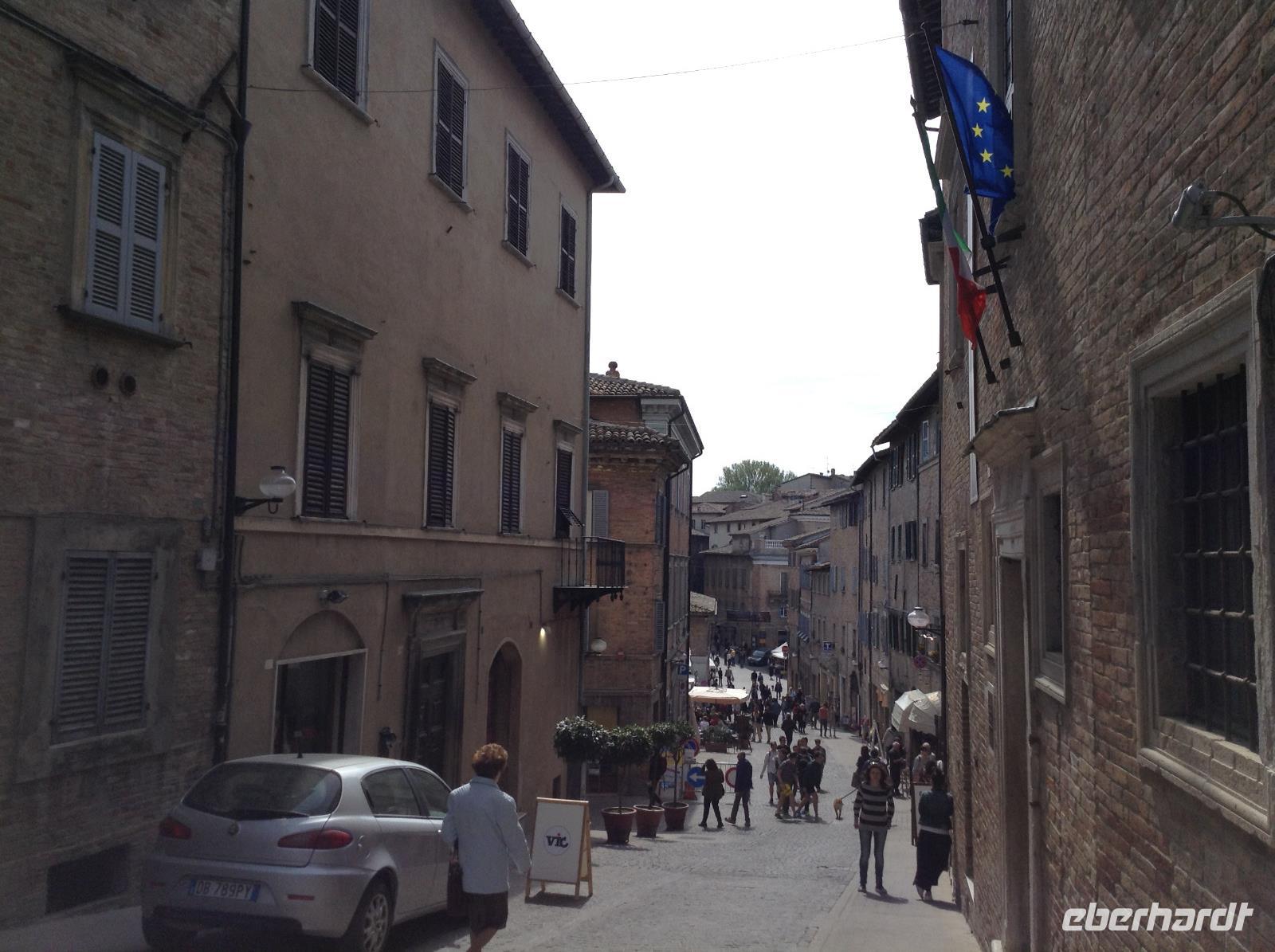 Heute ist Jesi unser erstes Ziel und schon blad erscheint die mächtige Altstadt vor uns auf einem Hügel. Wir bummeln durch das Stadttor hinauf in die Altstadt. In den Gassen und auf den Plätzen ist es noch ruhig an diesem Morgen. Aber die Italiener bereiten sich auf das bevorstehende Osterfest vor und so gibt es in den Geschäften überall riesig große Schokoladeneier, grell verpackt.