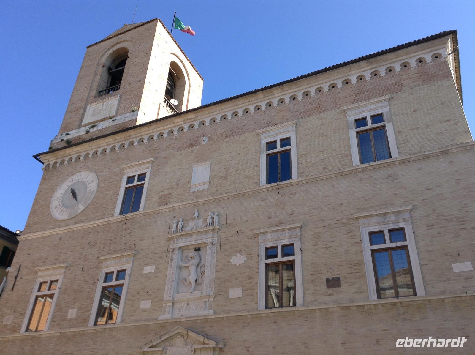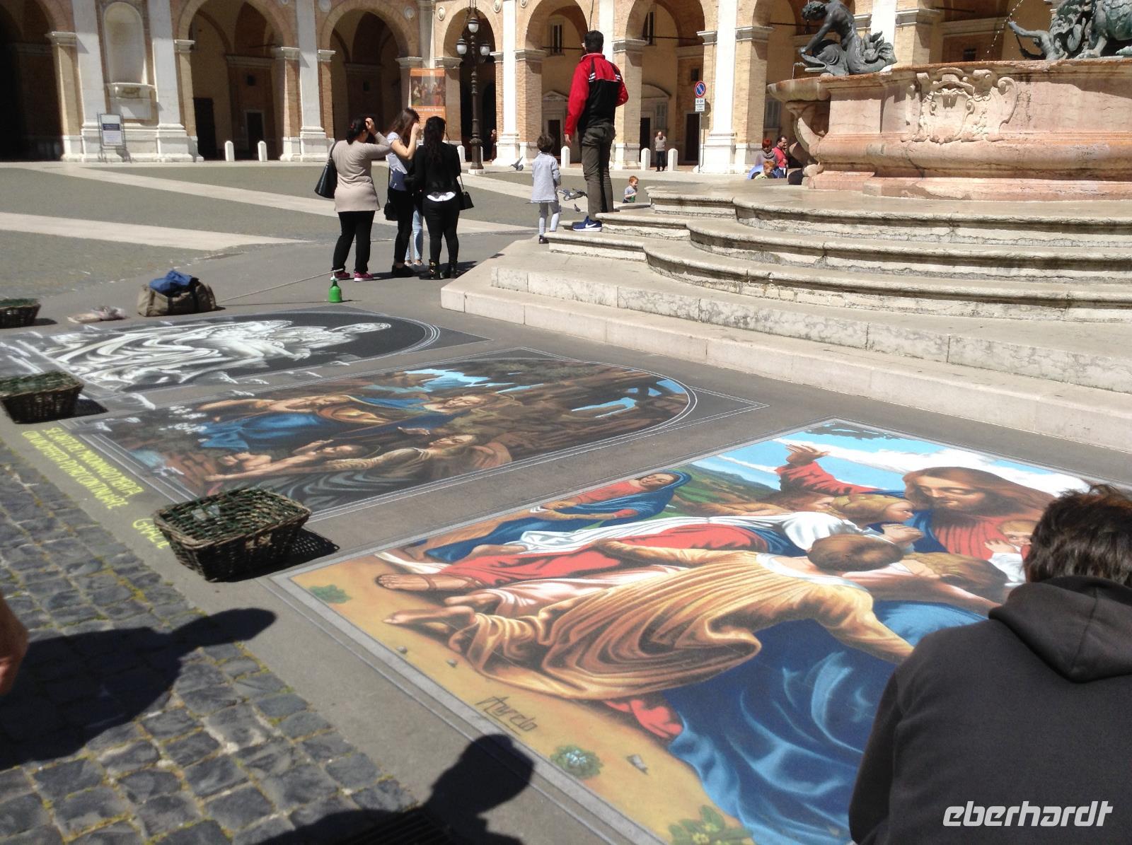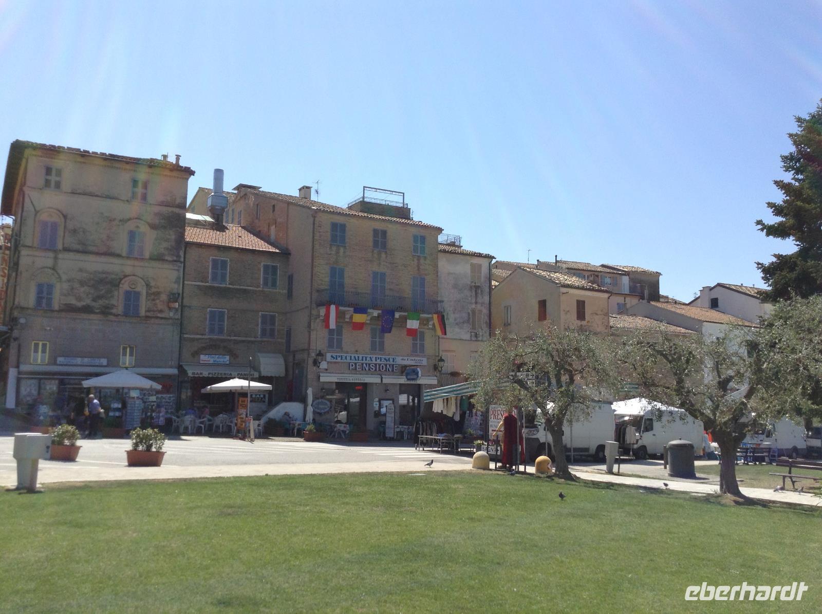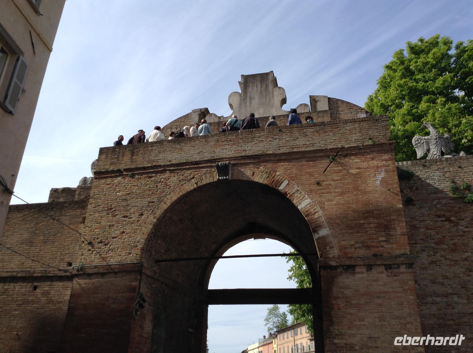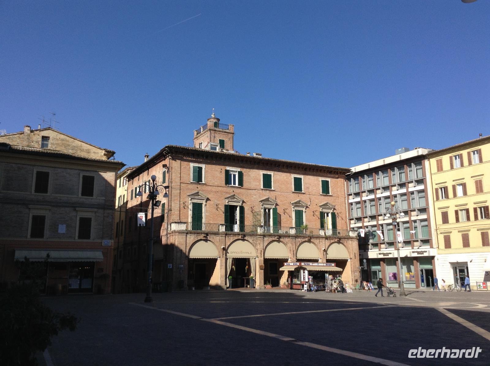 Heute ist Jesi unser erstes Ziel und schon blad erscheint die mächtige Altstadt vor uns auf einem Hügel. Wir bummeln durch das Stadttor hinauf in die Altstadt. In den Gassen und auf den Plätzen ist es noch ruhig an diesem Morgen. Aber die Italiener bereiten sich auf das bevorstehende Osterfest vor und so gibt es in den Geschäften überall riesig große Schokoladeneier, grell verpackt.