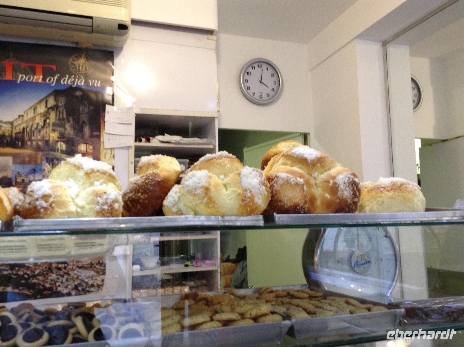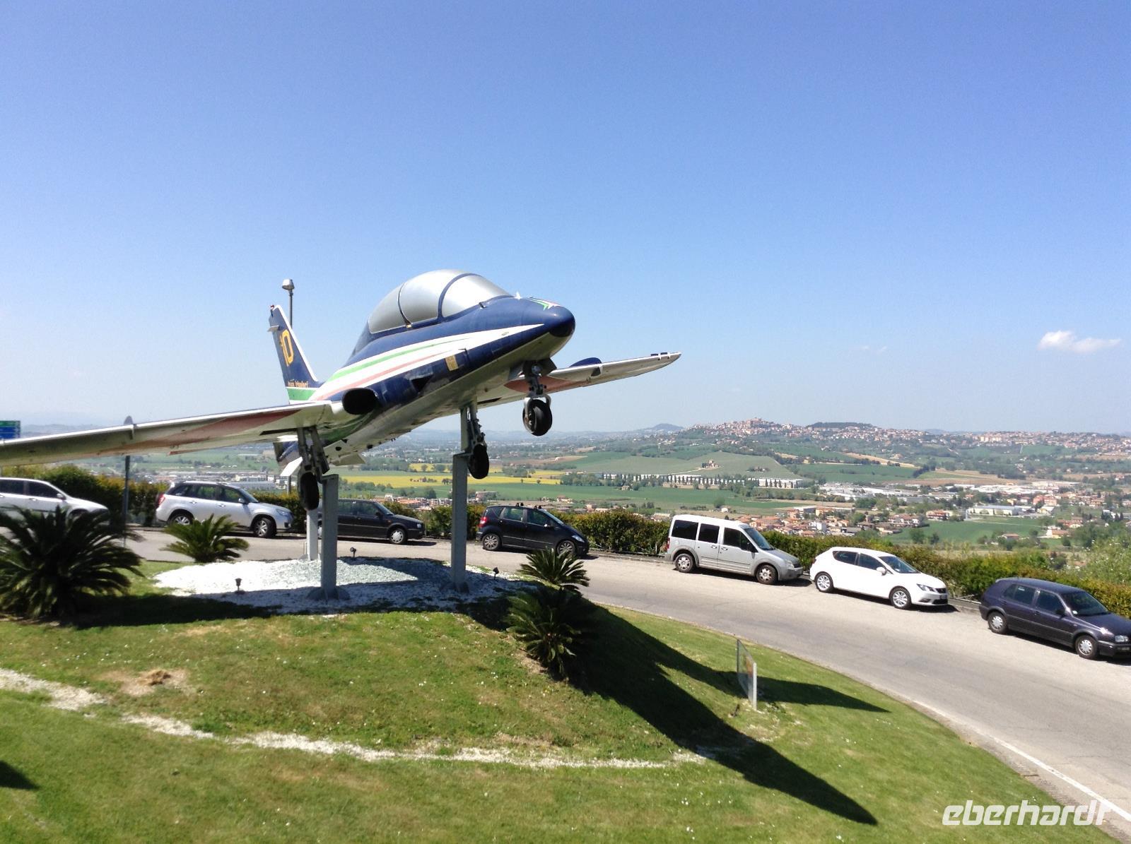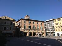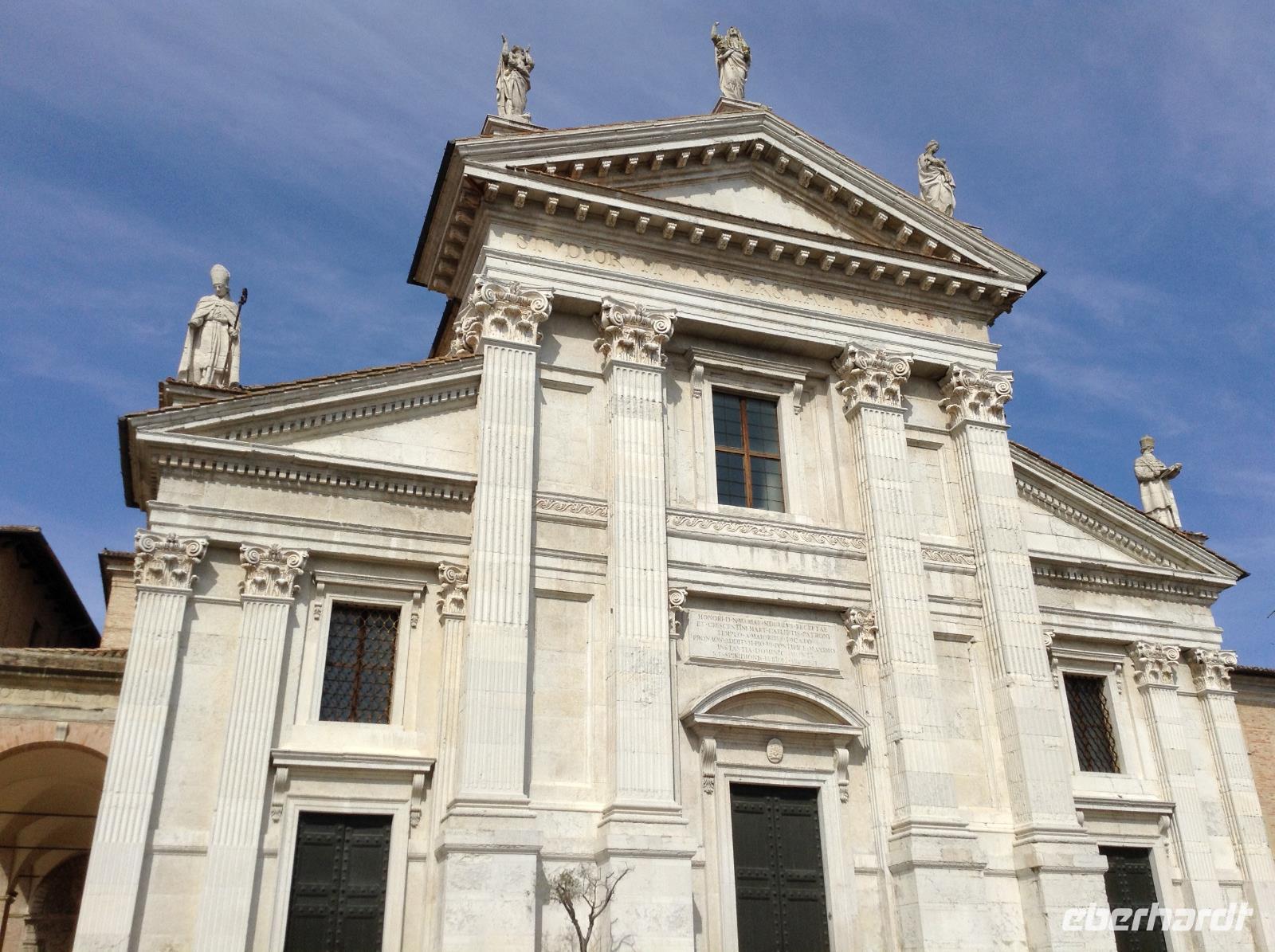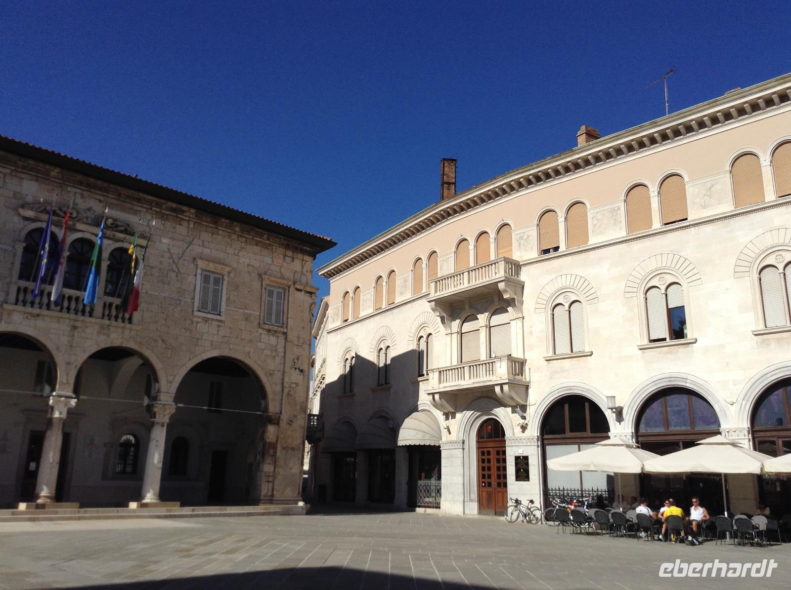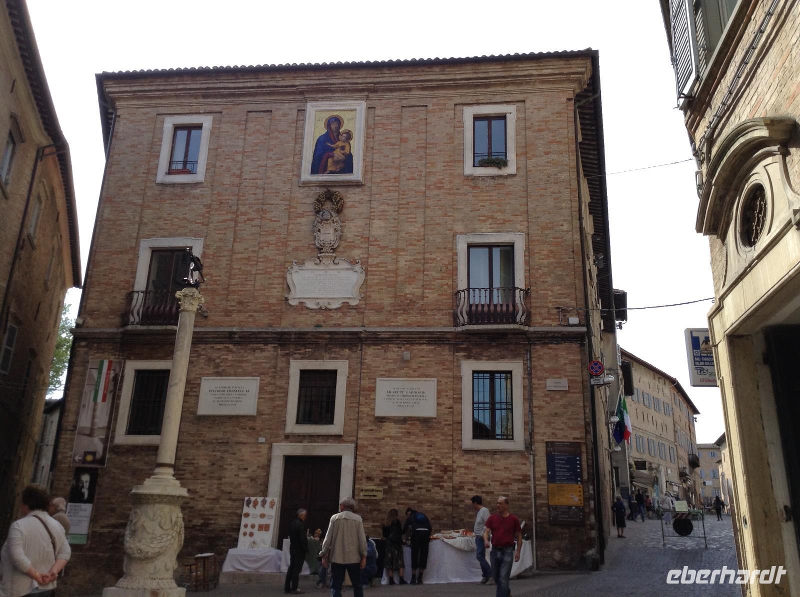 Heute ist Jesi unser erstes Ziel und schon blad erscheint die mächtige Altstadt vor uns auf einem Hügel. Wir bummeln durch das Stadttor hinauf in die Altstadt. In den Gassen und auf den Plätzen ist es noch ruhig an diesem Morgen. Aber die Italiener bereiten sich auf das bevorstehende Osterfest vor und so gibt es in den Geschäften überall riesig große Schokoladeneier, grell verpackt.