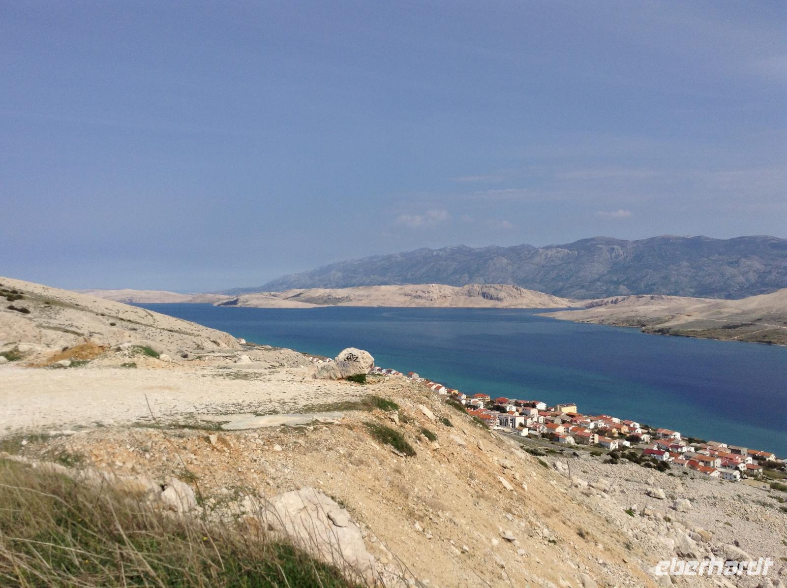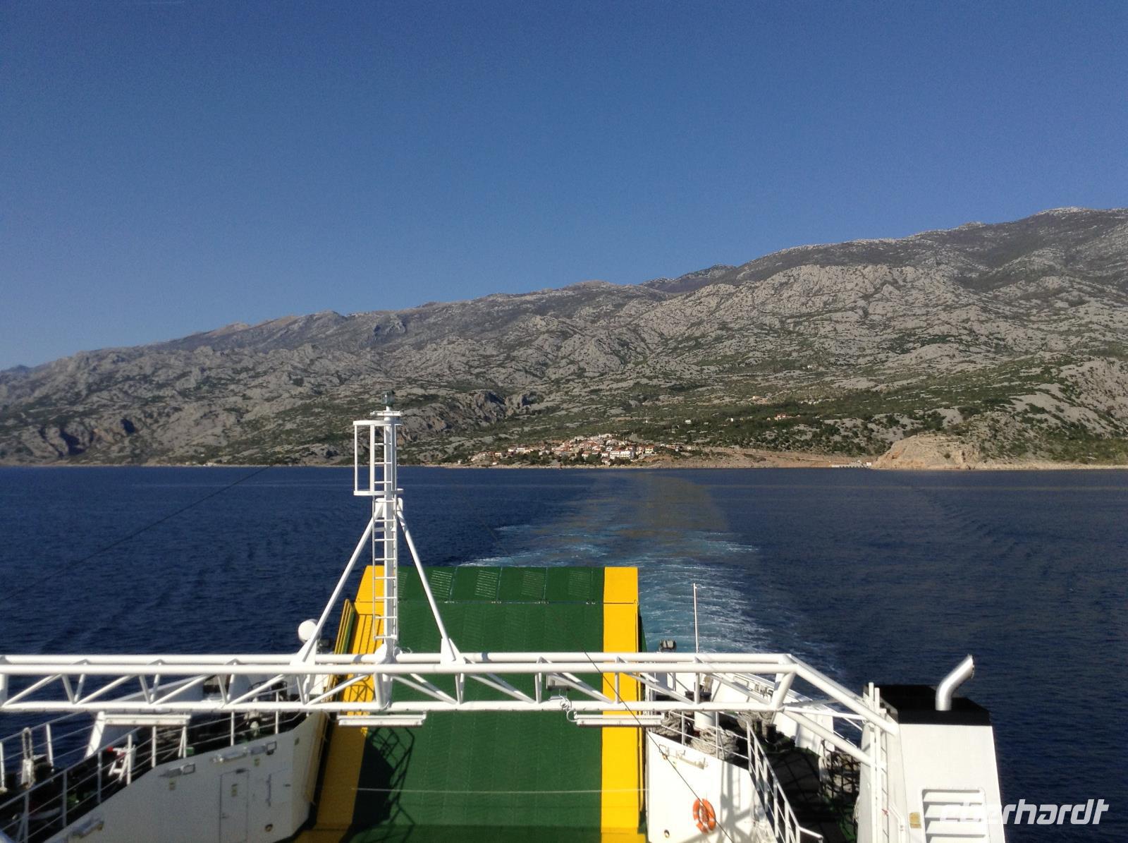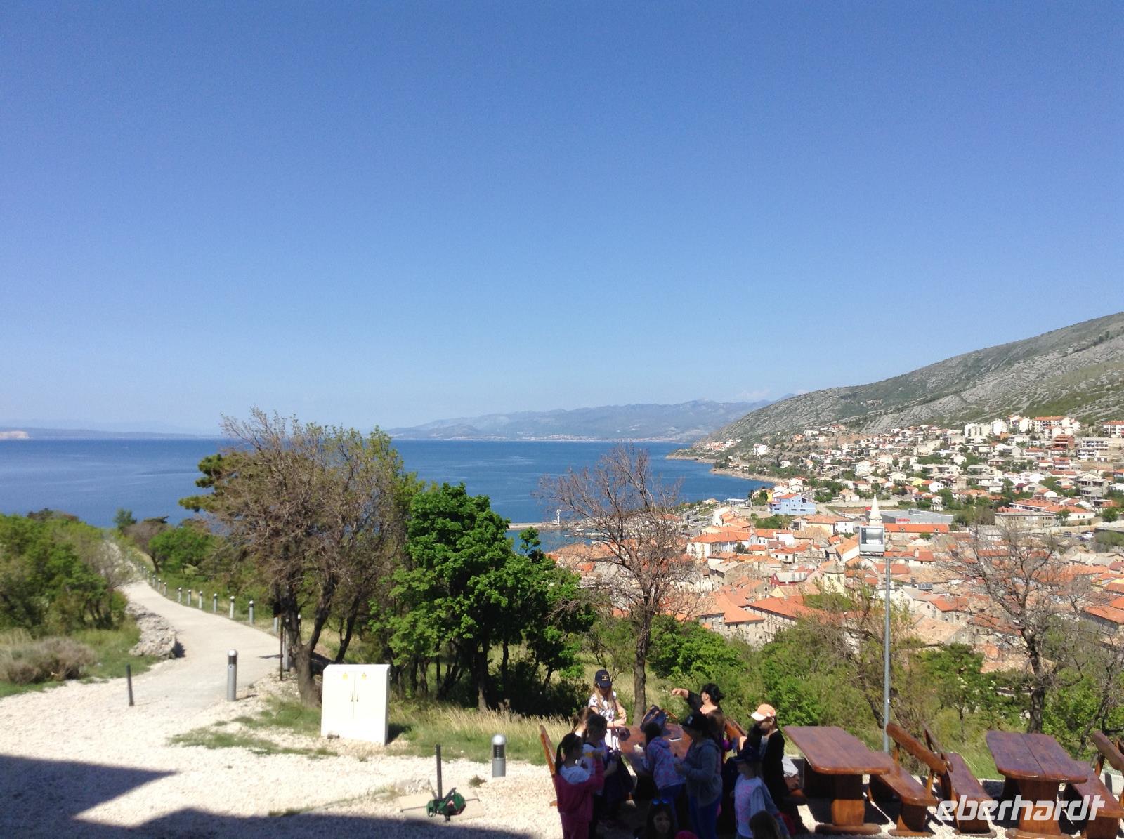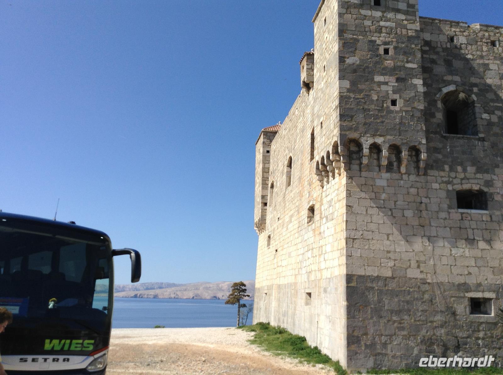 Im Ortszentrum treffen wir auf unsere Stadtführerin und fahren zuerst zur Uskokenburg hinauf. Vom Hügel vor dem Ort gibt es einen fantastischen Rundblick auf das Meer, die vorgelagerten Inseln und die Berge. Es gibt eine Führung in der alten Burg und etwas freie Zeit zur eigenen Erkundung. Dann geht es zurück auf einen Stadtbummel mit Erklärungen nach Senj. Es geht weiter mit dem Bus nach Prizna, wo am Nachmittag unser Fährüberfahrt zur Insel Pag gebucht ist. Auf Pag angekommen, geht es die kleine Inselstrasse entlang zur Nordspitze, nach Lun. Dort ist unser Hotel für die nächste Nacht. Die Buseinfahrt in Lun war abenteuerlich, unser Busfahrer ganz schön verzweifelt ! Aber es hat sich gelohnt, das Hotel war echt schön und sehr gut gelegen, direkt am Meer.