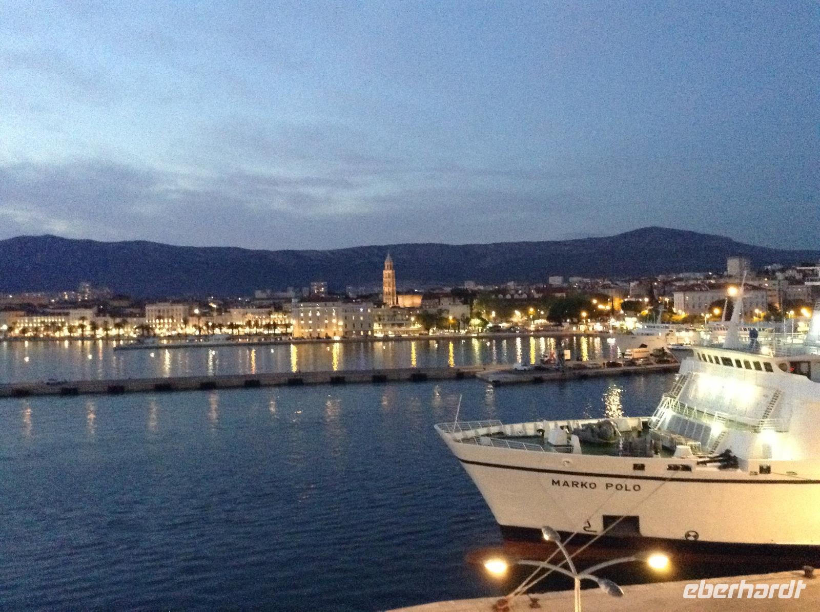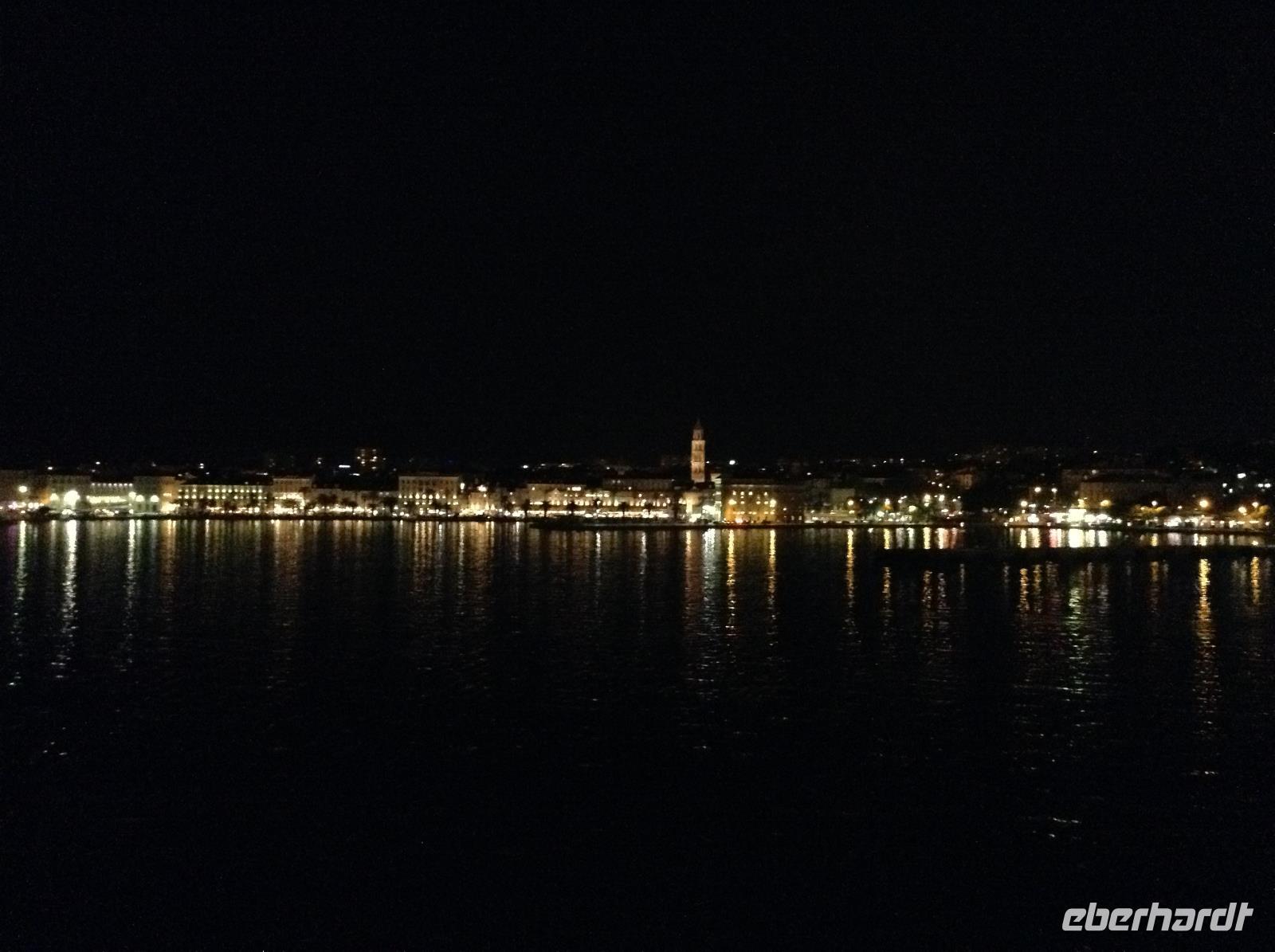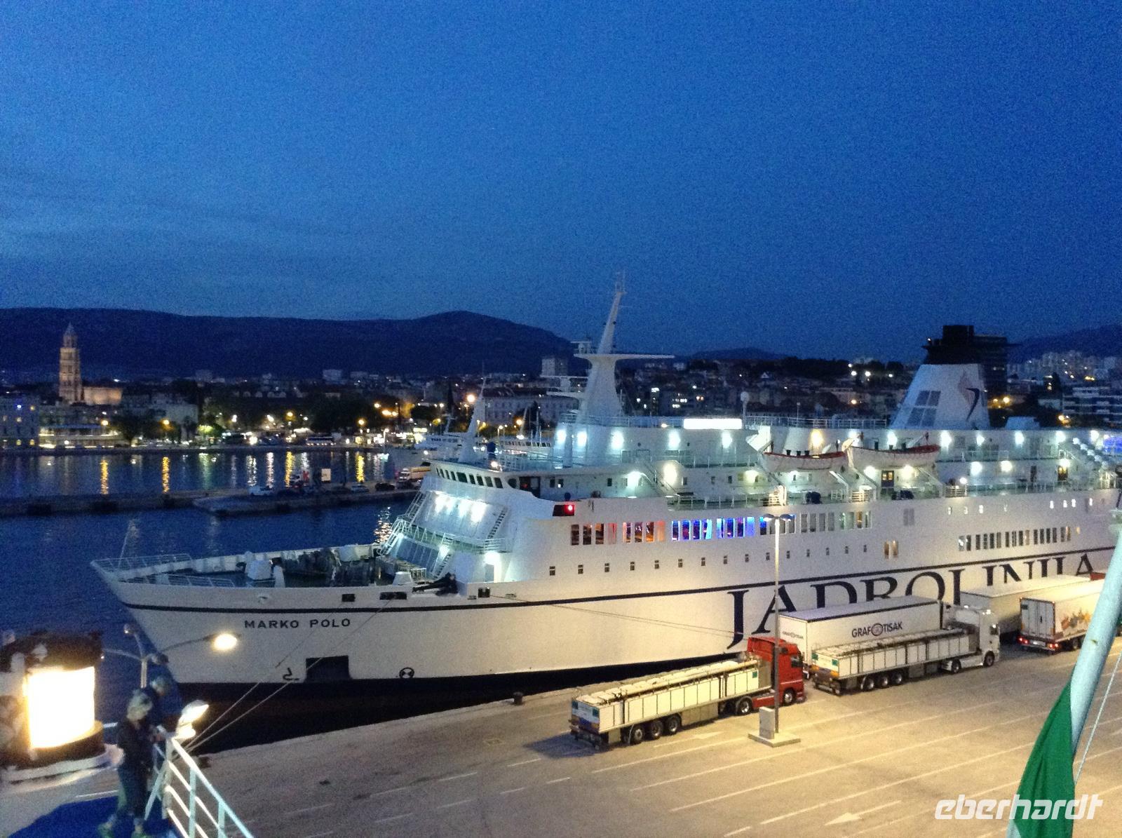 Gegen 18.30 Uhr ist Treff am Bus, wir wollen zur Fährüberfahrt nach Ancona. Als das Schiff etwas mit Verspätung ablegt, ist es dunkel. Die Stadt zeigt sich in abendlicher Beleuchtung.