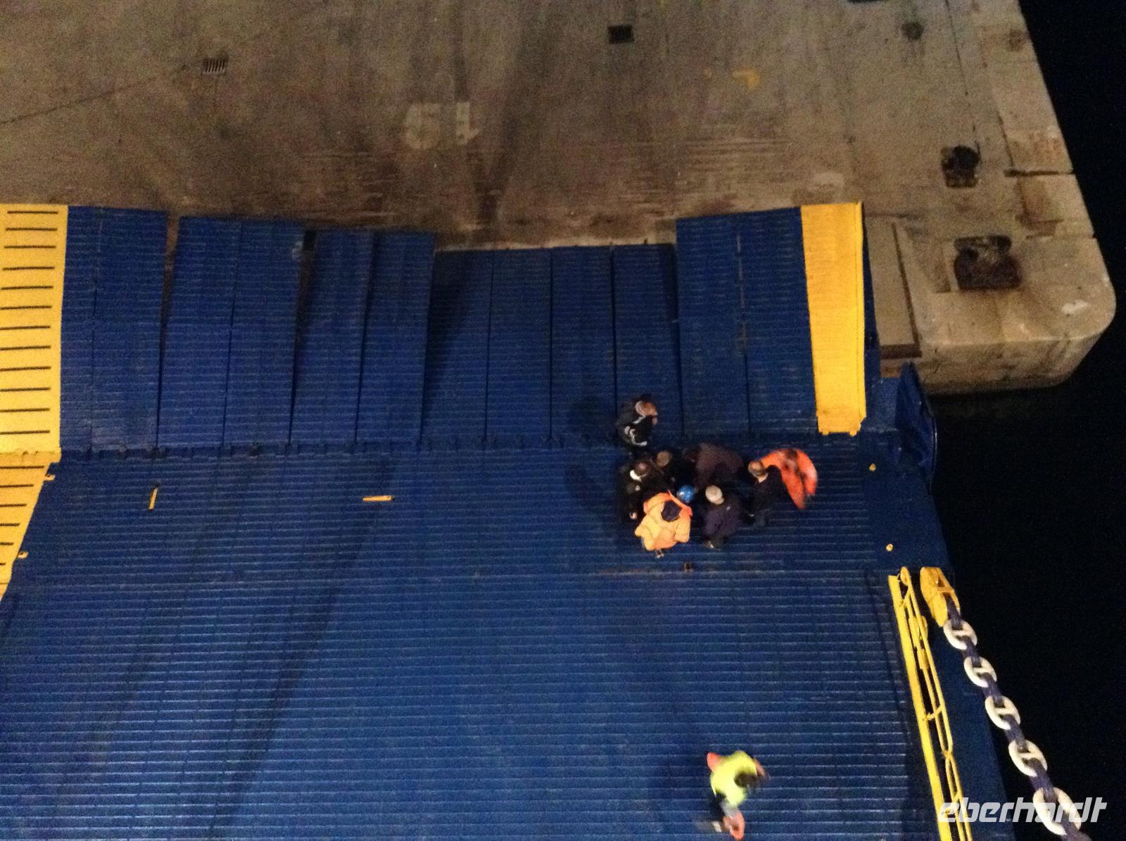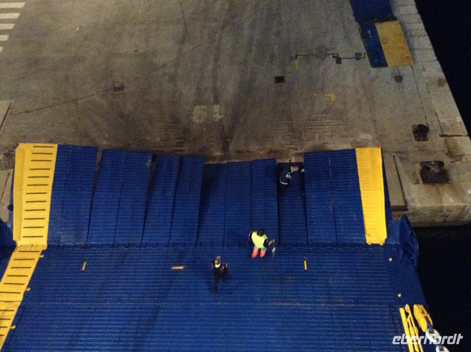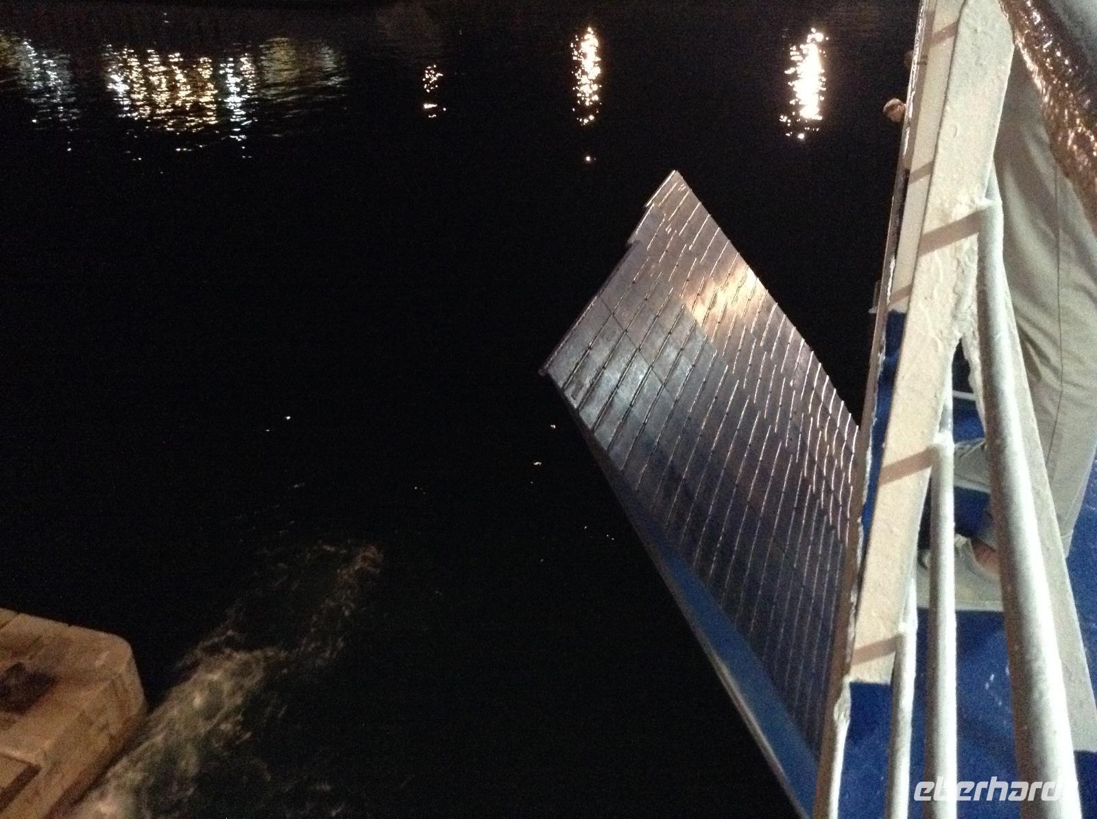 Gegen 18.30 Uhr ist Treff am Bus, wir wollen zur Fährüberfahrt nach Ancona. Als das Schiff etwas mit Verspätung ablegt, ist es dunkel. Die Stadt zeigt sich in abendlicher Beleuchtung.