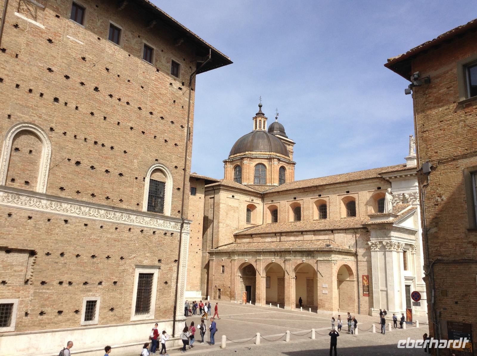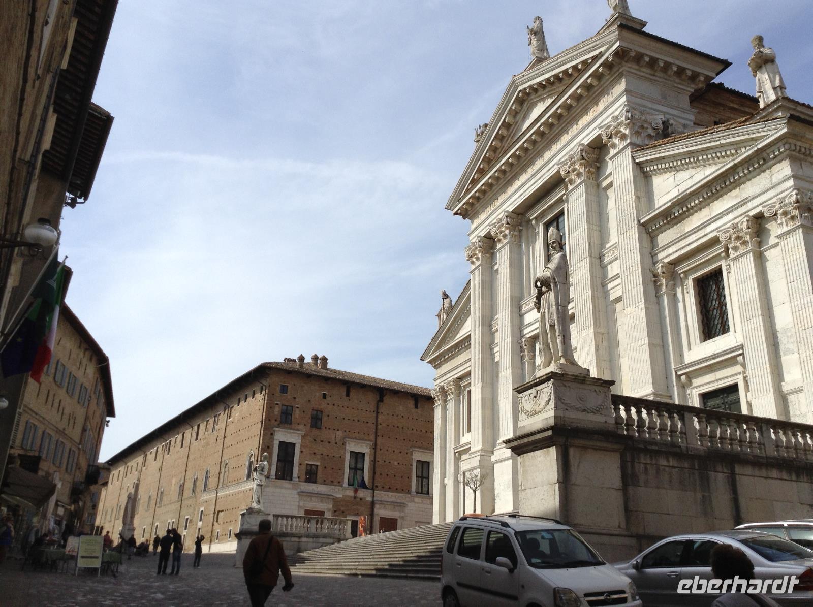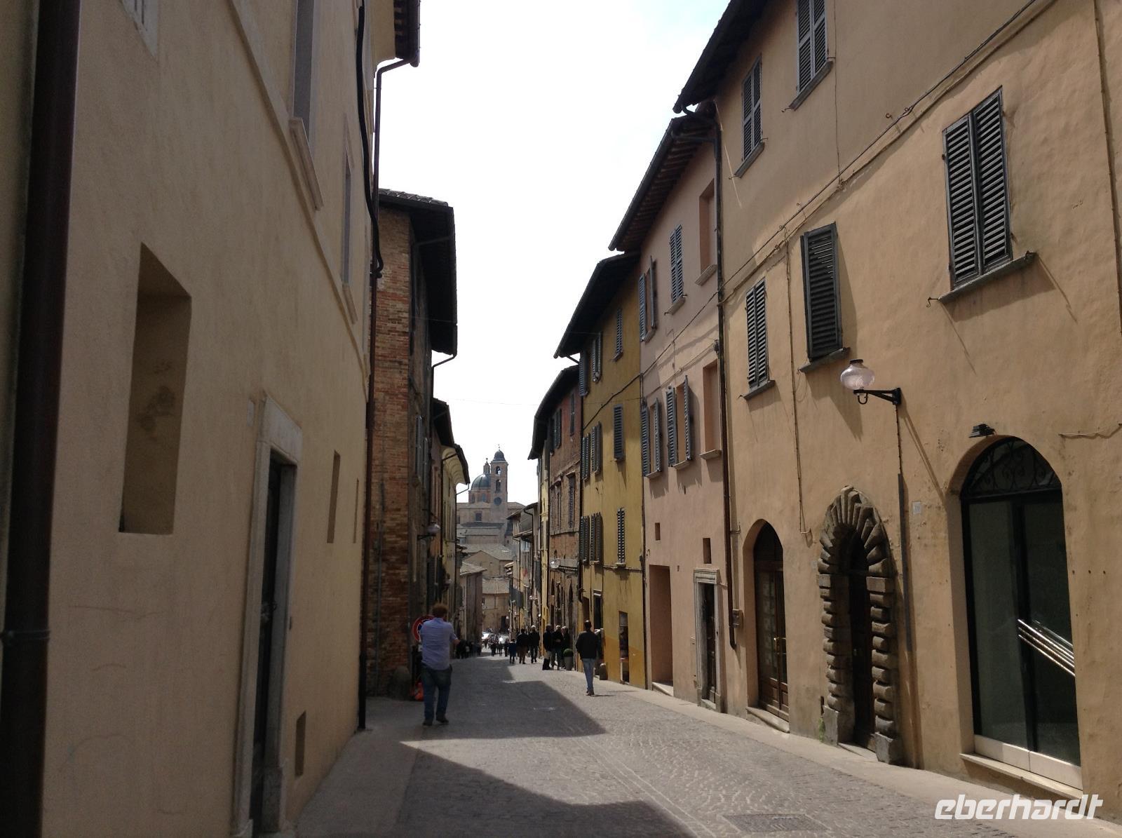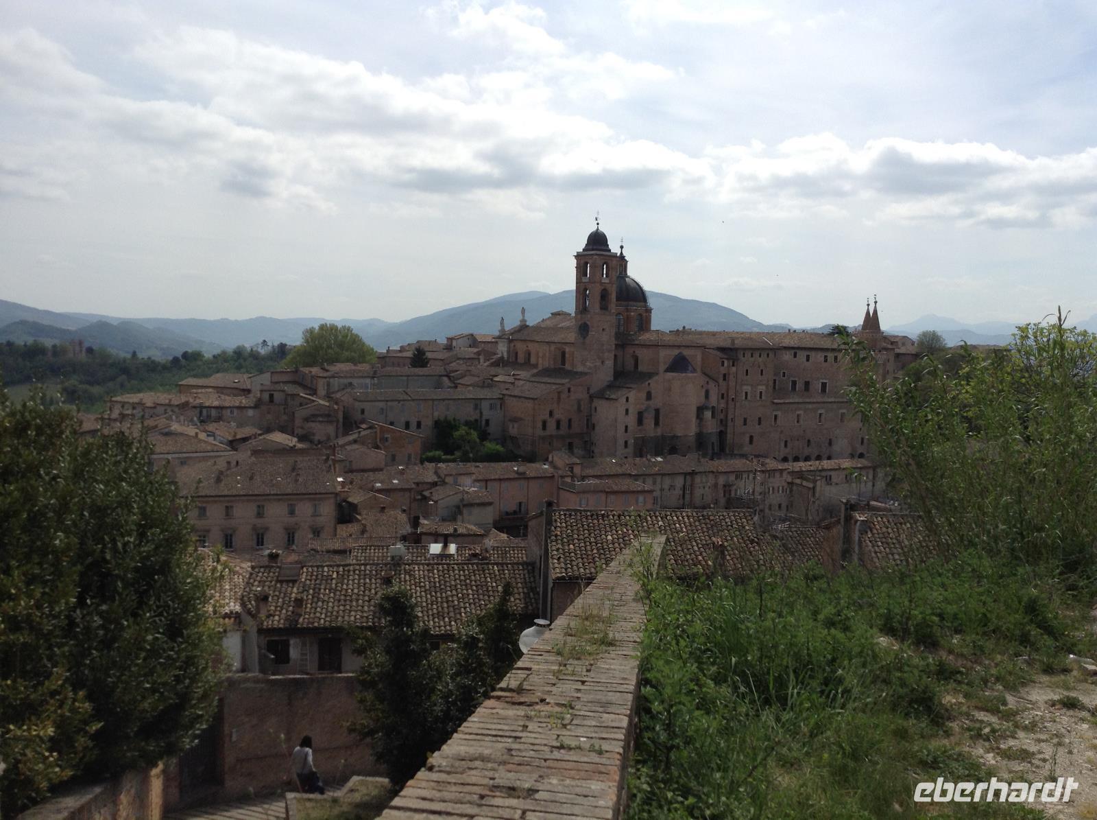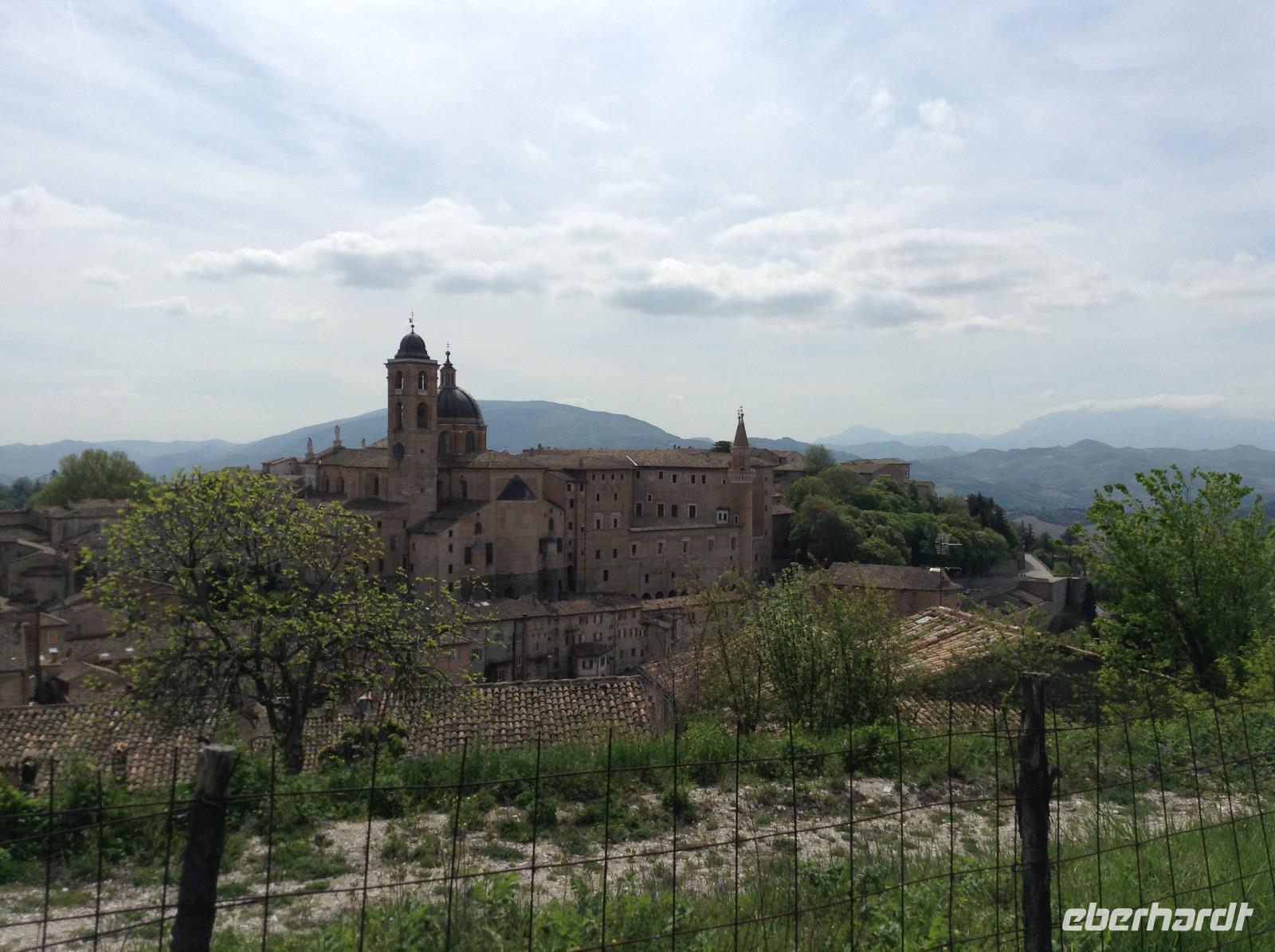 Unser erstes Ziel heute ist die alte Renaissancestadt Urbino. Oben auf dem Berg angekommen, führt uns der Fußweg aufwärts bis zur Piazza della Republica. Dort beginnt die Erkundung auf eigene Faust. Die Stadt hat so einiges zu bieten: Galerien, Ausstellungen, enge Gassen, hübsche Restaurants und Läden. Wer bis zum Aussichtspunkt hoch über der Stadt läuft wird mit einem tollen Rundblick belohnt.