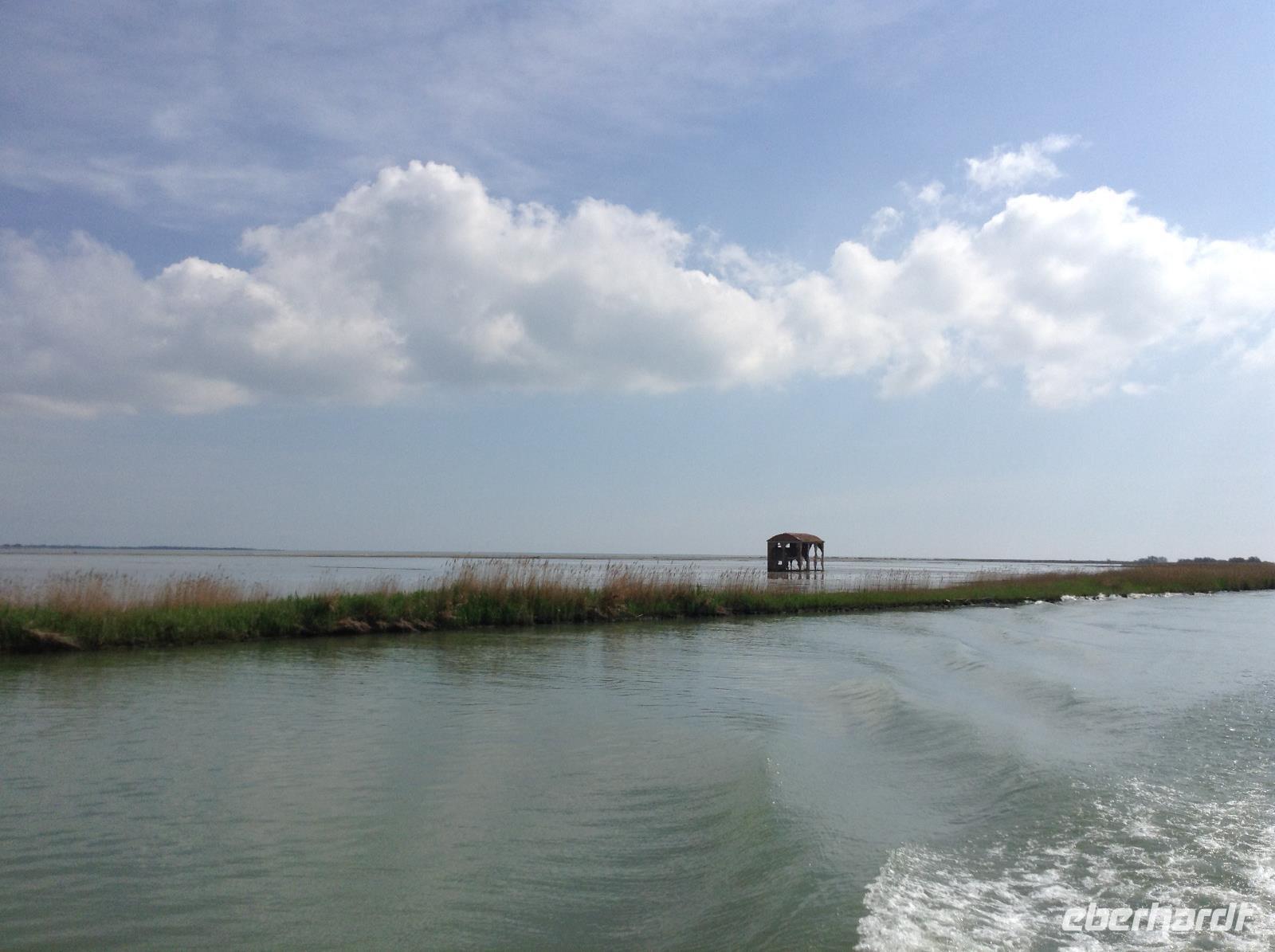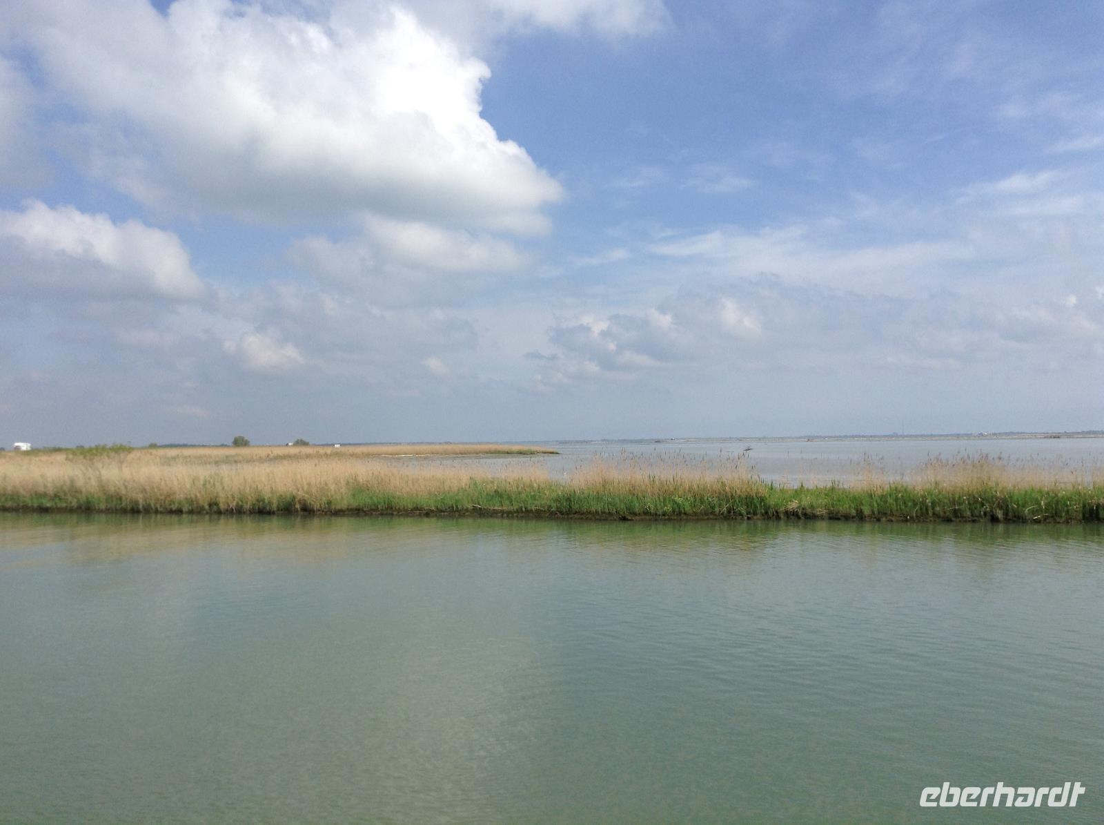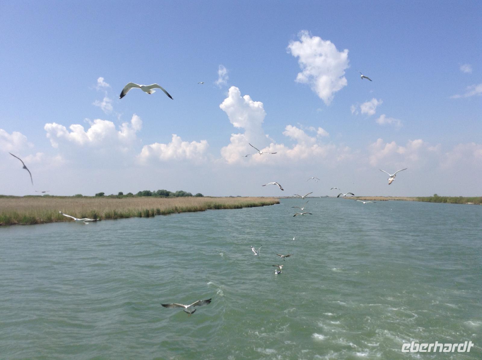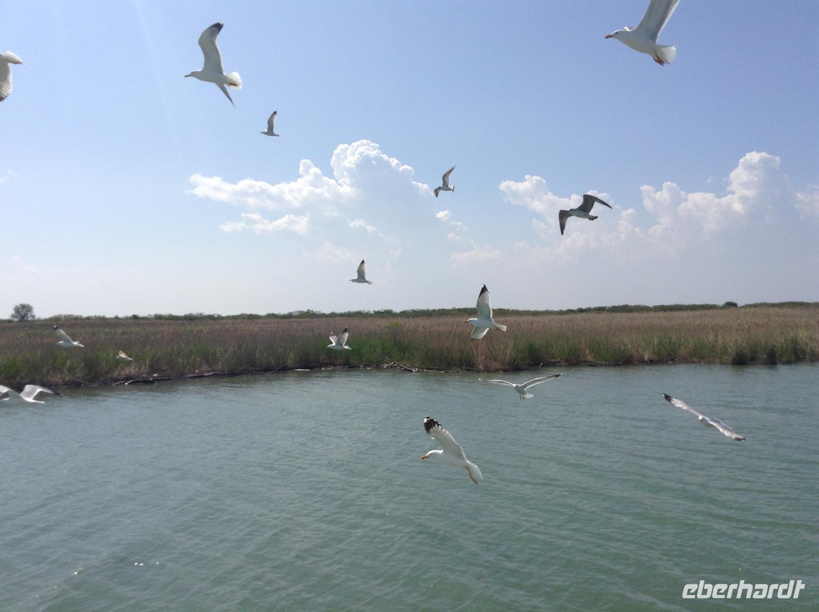 Es hat geregnet in der Nacht und als wir loswollen früh, war alles noch nass. Wir erreichen den Hafen bei Chamaccio und das Wetter entspannt sich. Die Sonne kommt raus und es war wieder ein schöner Tag. Bis auf 2 Personen ist die ganze Gruppe mit zum Ausflug gefahren. Und das hat sich echt gelohnt. Mit dem Schiff ging es hinaus auf das offene Meer bis zum Po-Delta. Wir fahren die Seitenarme entlang, machen Pause auf der Liebesinsel und eleben ein tolles Fisch-Picknick an Bord des Schiffes. Es gibt Wasser und Wein dazu.